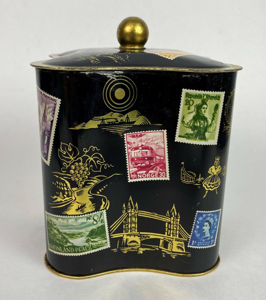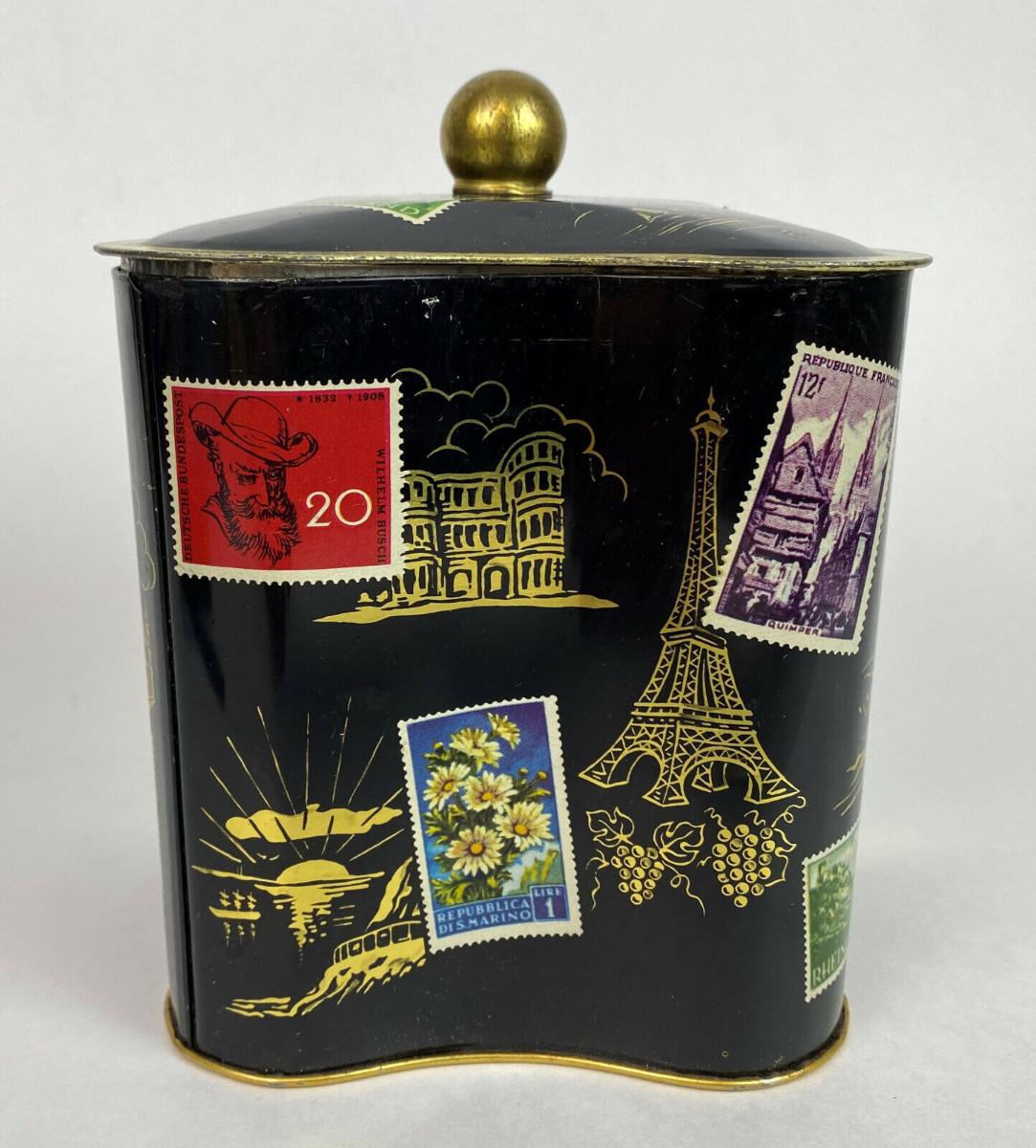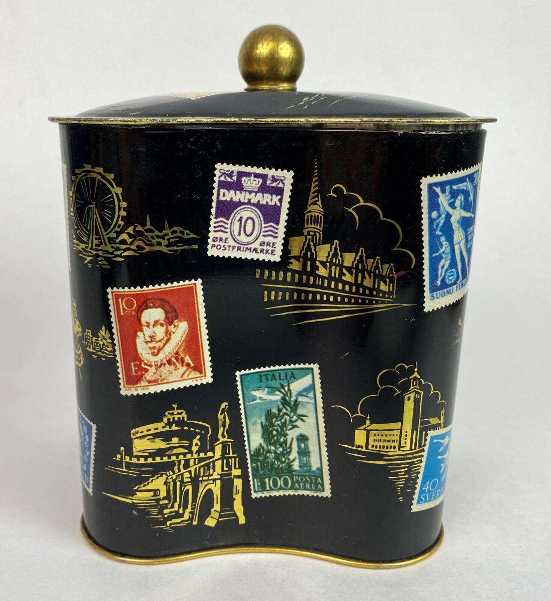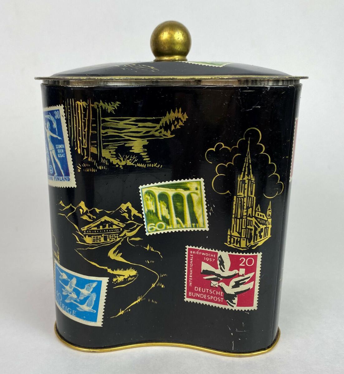 vintage black & gold & postage stamp graphics metal box made in West Germany circa 1957...Biscuit or candies?...Some light wear...Good condition...With lid...as shown...5" high by 5.5" wide.