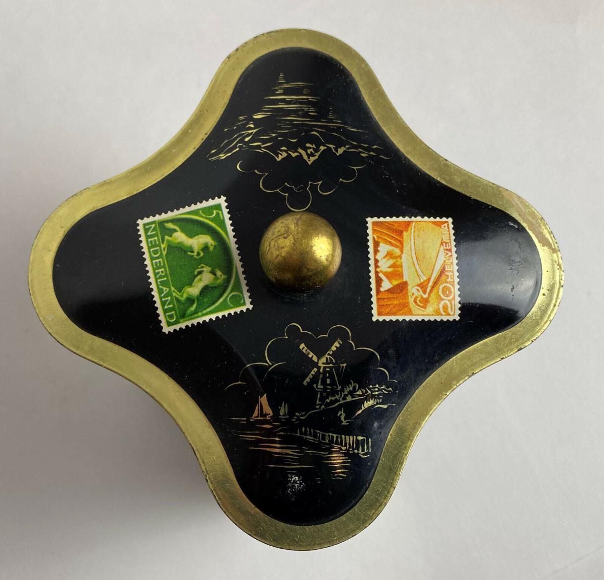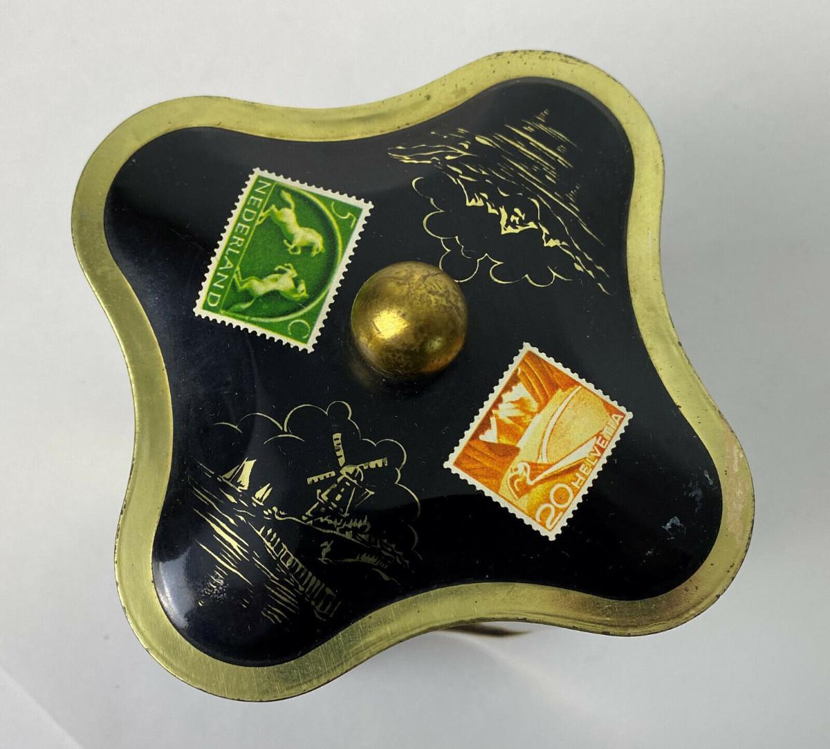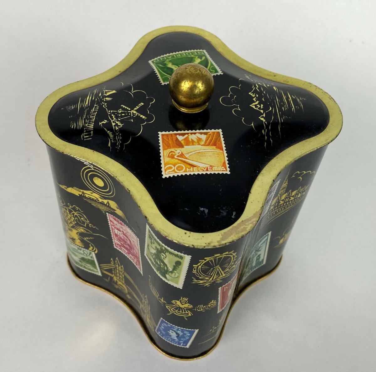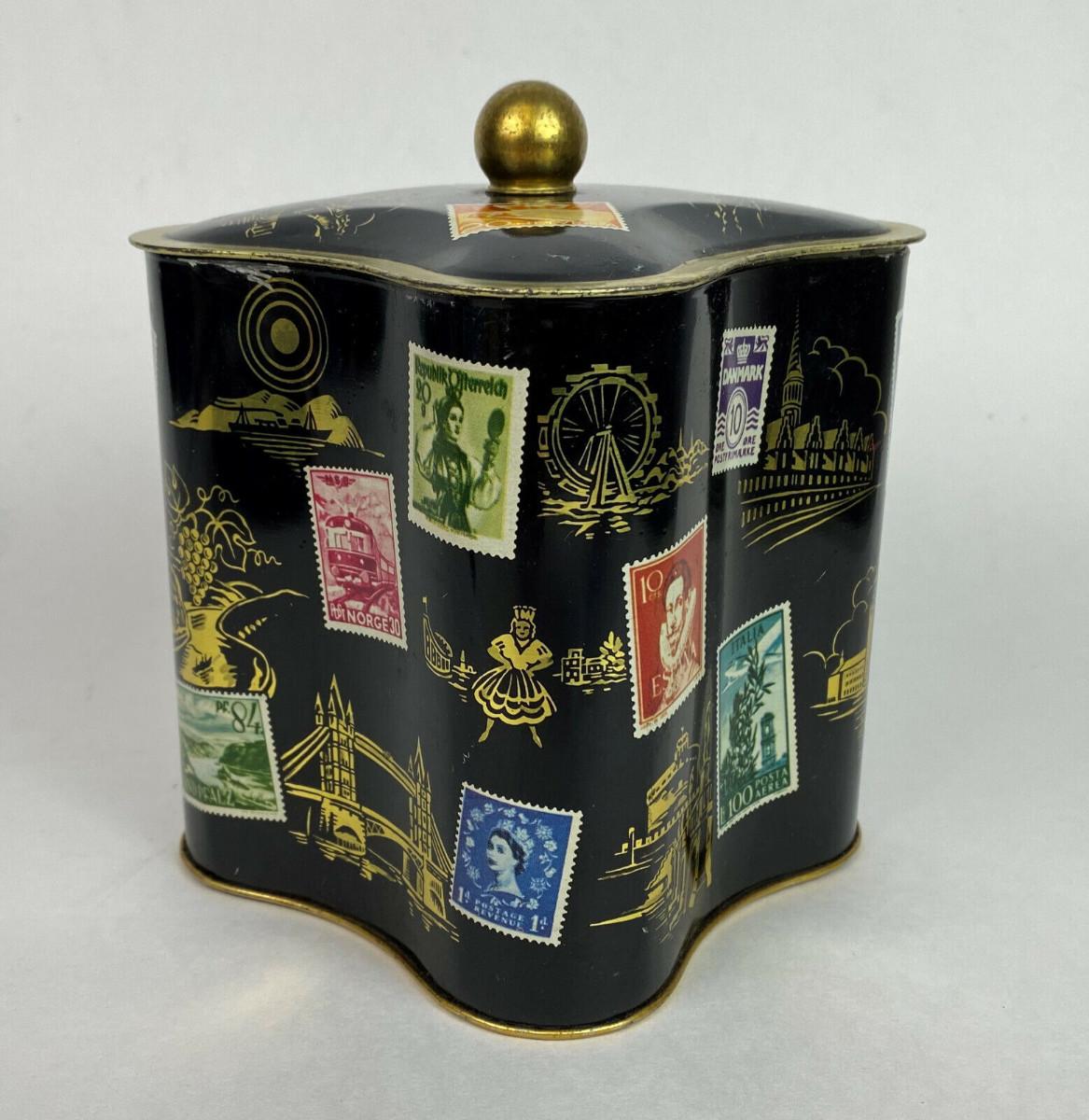 vintage black & gold & postage stamp graphics metal box made in West Germany circa 1957...Biscuit or candies?...Some light wear...Good condition...With lid...as shown...5" high by 5.5" wide.