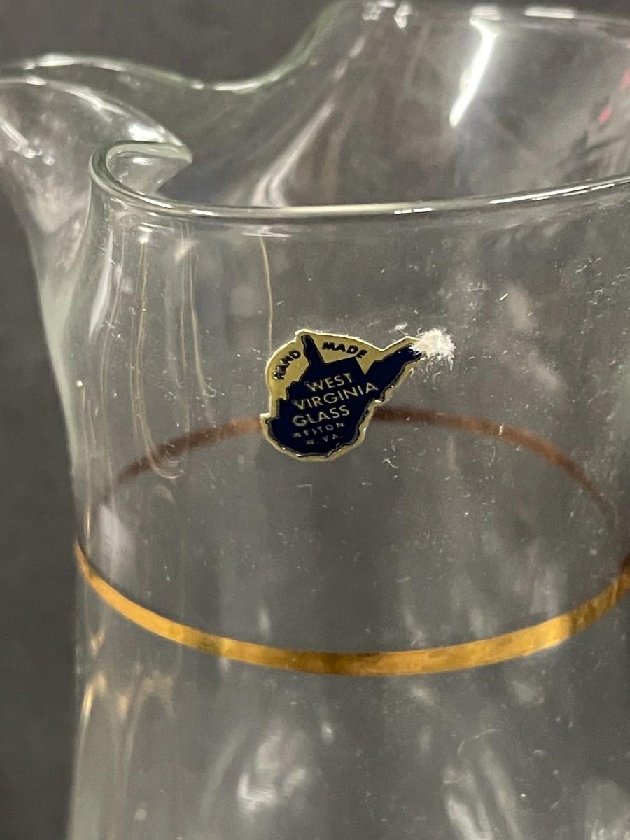 Vintage West Virginia Glass 50th Anniversary Glass Pitcher with 6 Glasses. All very good condition. Pitcher is 9".