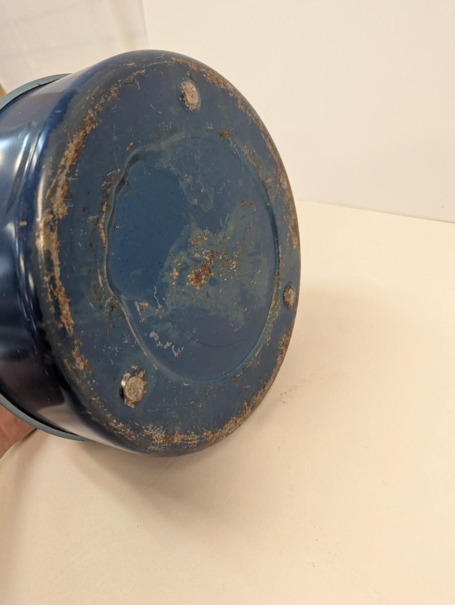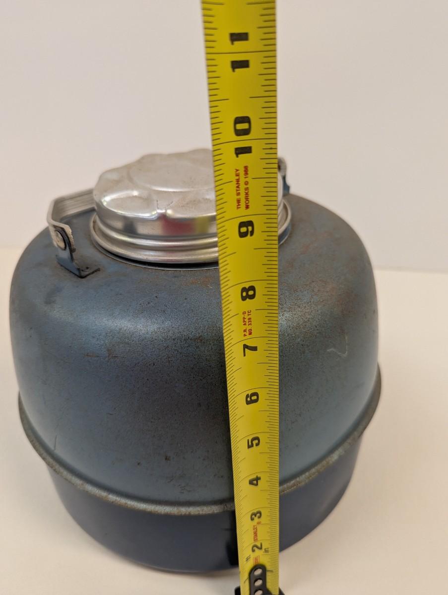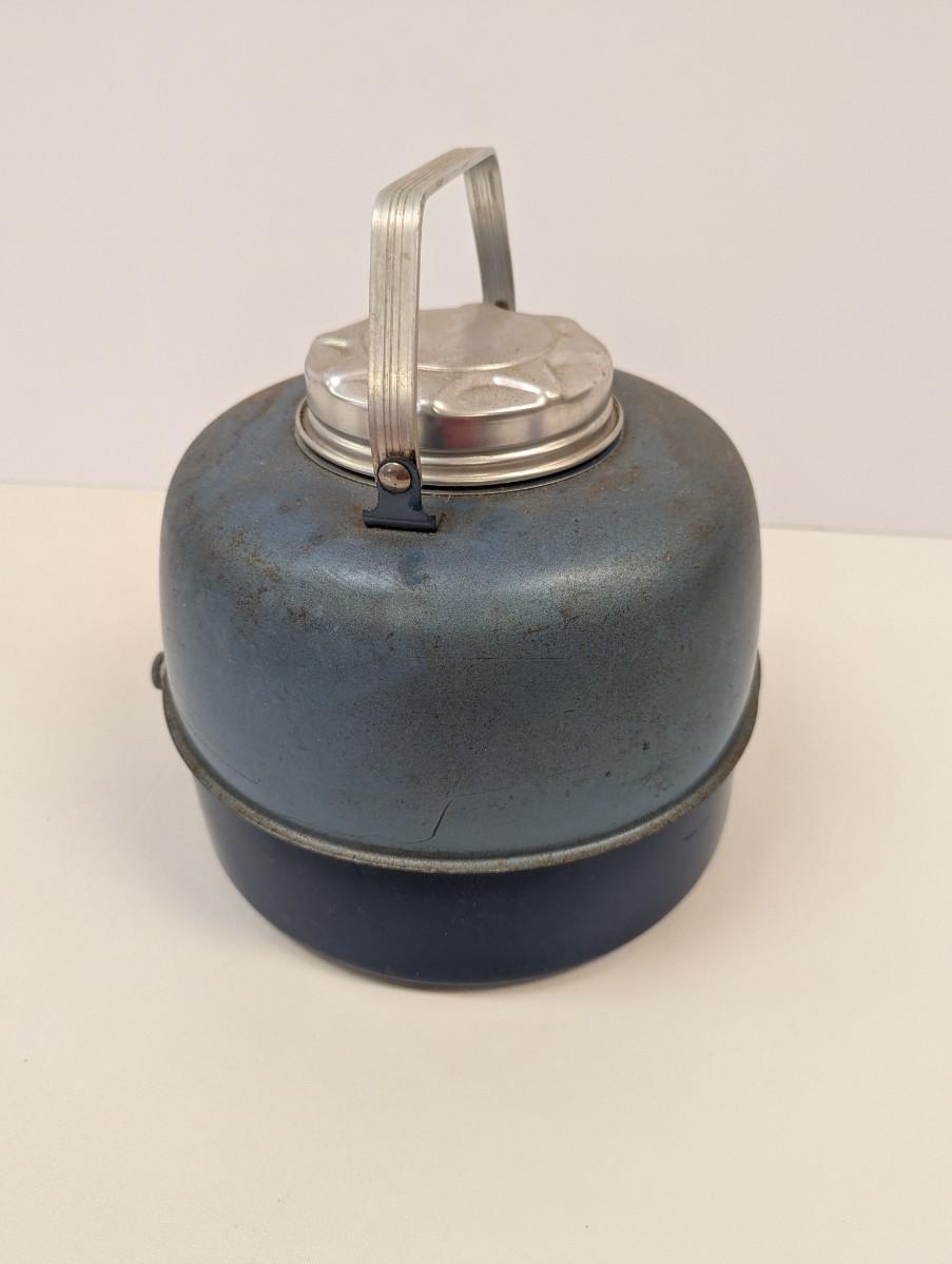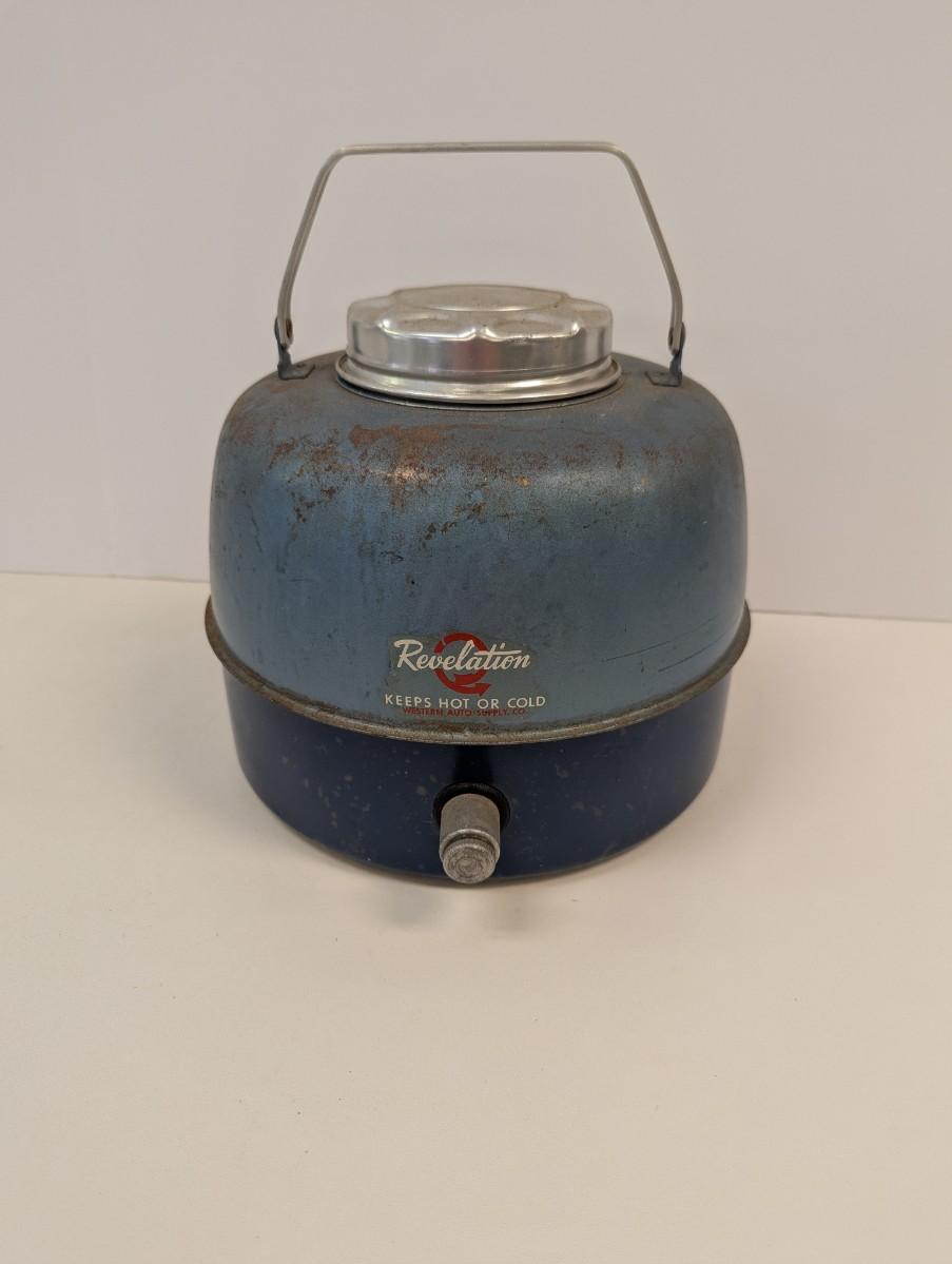 Vintage Western Auto Supply Co. Revelation water cooler jug in two-tone blue. Measures about 8.5" tall to the top of the lid and 10.5" to the top of the handle. The base is about 9.5" in diameter. Scratches, rust, missing paint, and other wear.