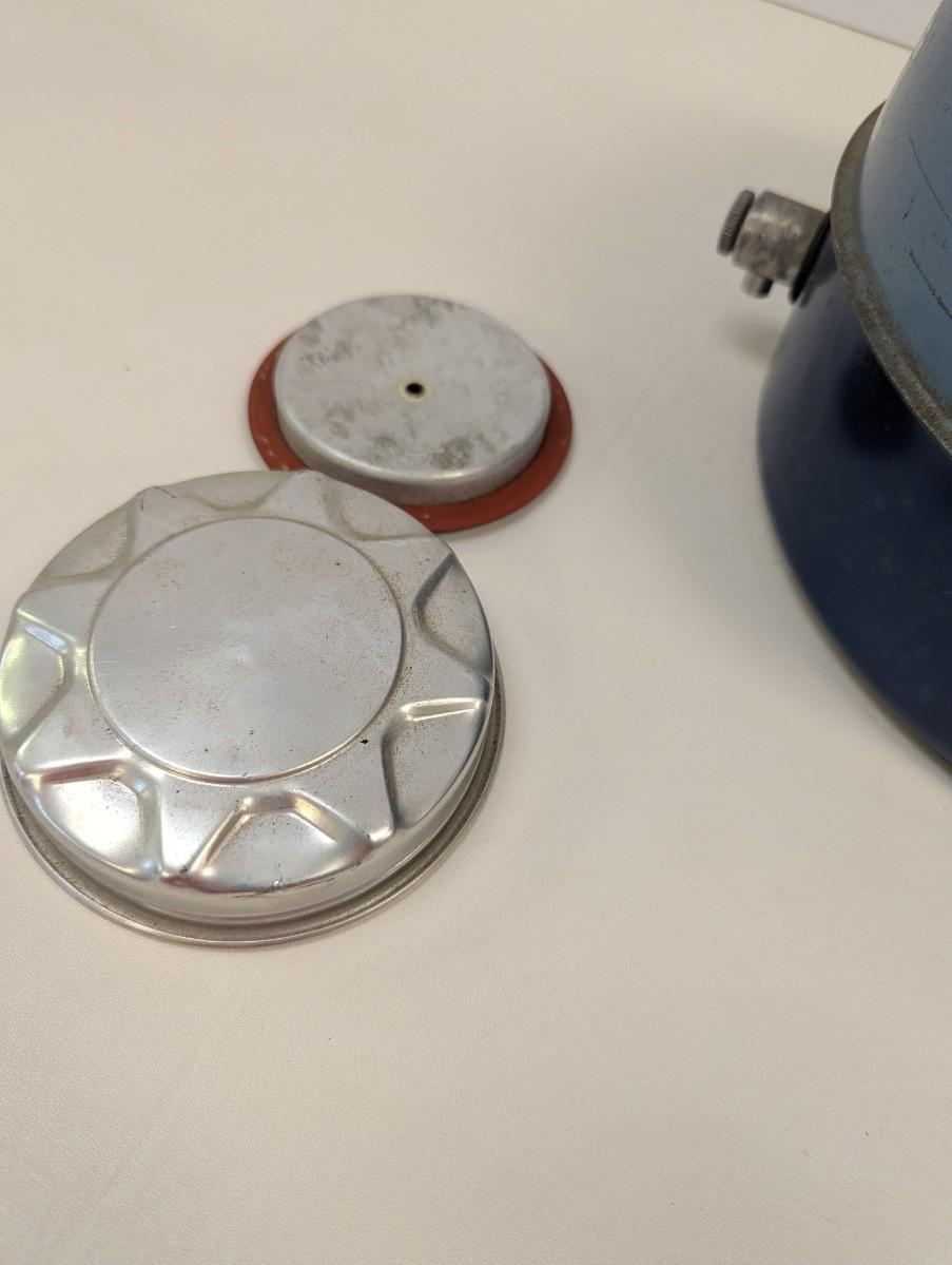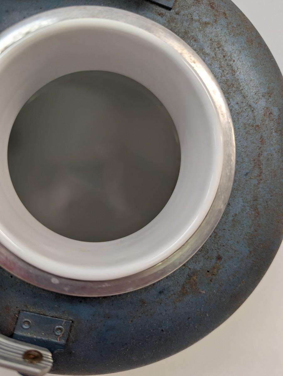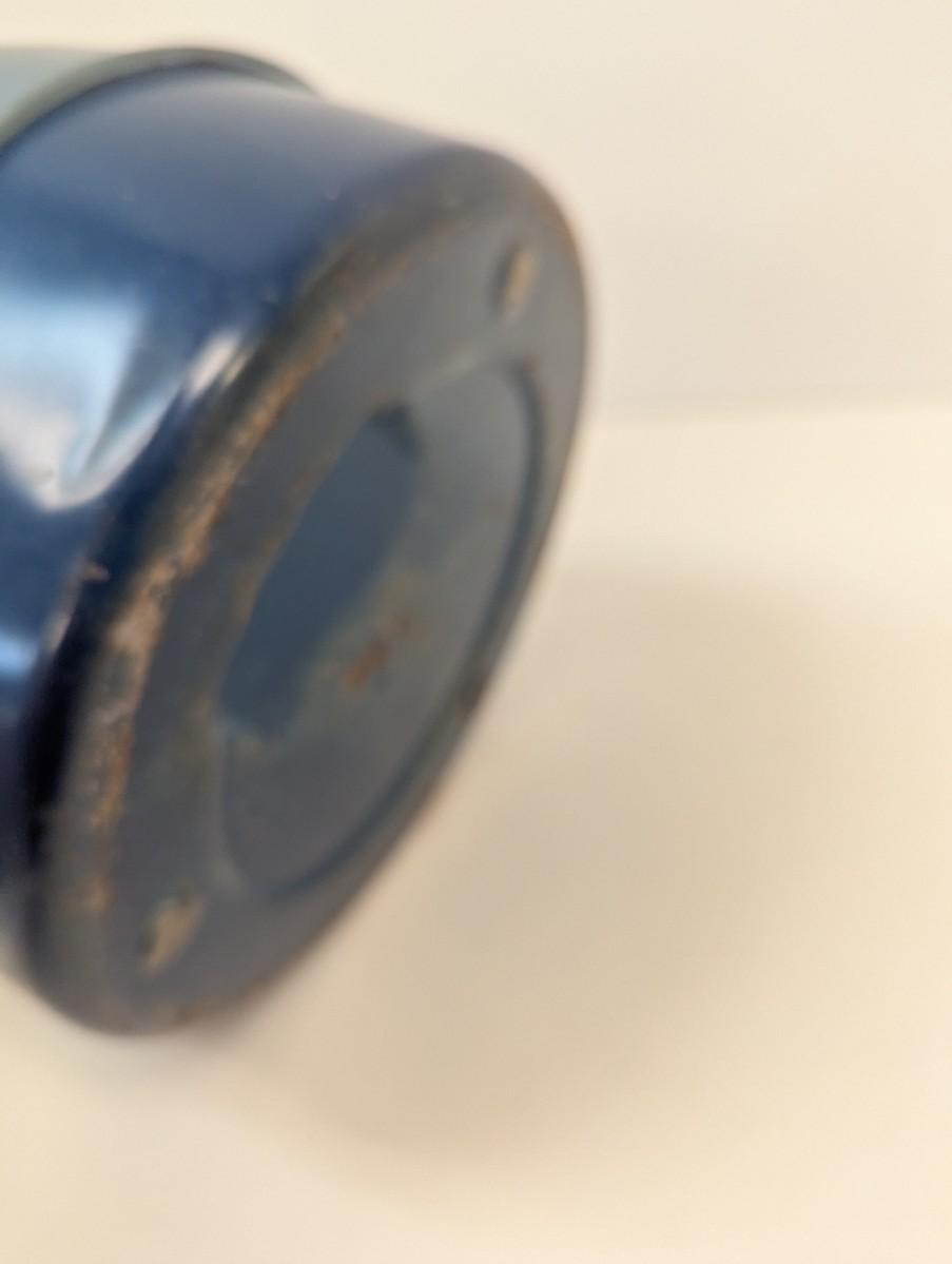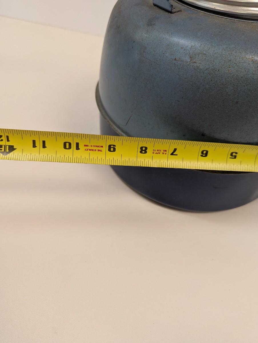 Vintage Western Auto Supply Co. Revelation water cooler jug in two-tone blue. Measures about 8.5" tall to the top of the lid and 10.5" to the top of the handle. The base is about 9.5" in diameter. Scratches, rust, missing paint, and other wear.
