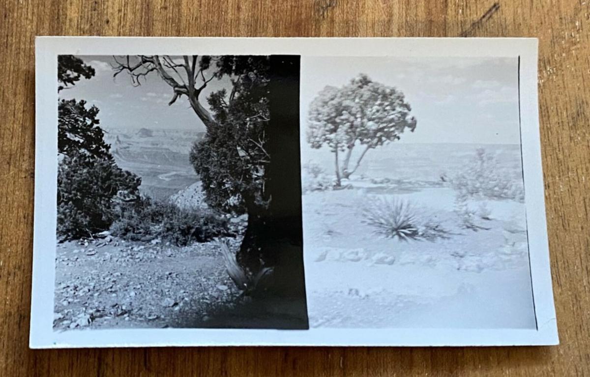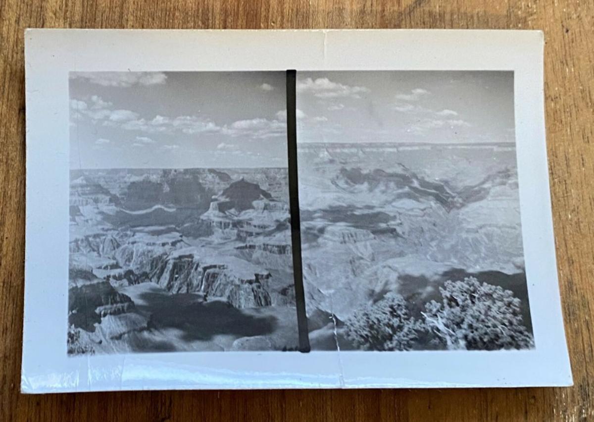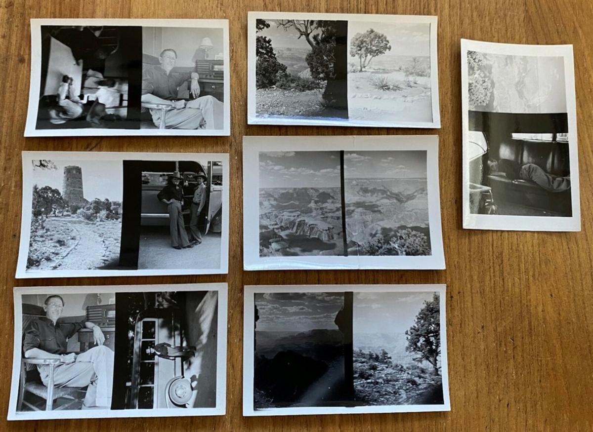 seven(7) small double image snapshots of a western bus excursion to the Grand Canyon circa 1939...features one shot of the Desert View Watchtower at the edge of the Canyon not long after it was built in 1932...the vision of Mary Colter based on Native structures...Referred to as the architect of the southwest Mary Colter was the chief architect and decorator for the Fred Harvey Company from 1902 to 1948 as well...The b/w prints measure just 2 3/4 x 1 7/8"...In very good condition...Estate find...No other B/G available.