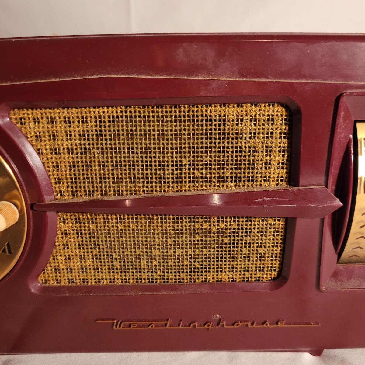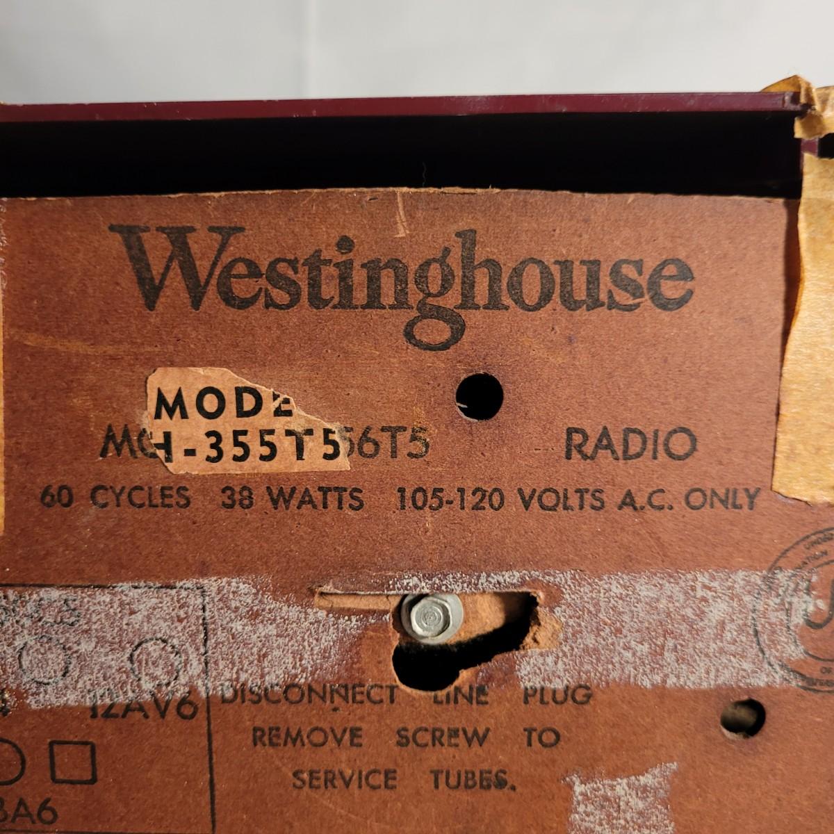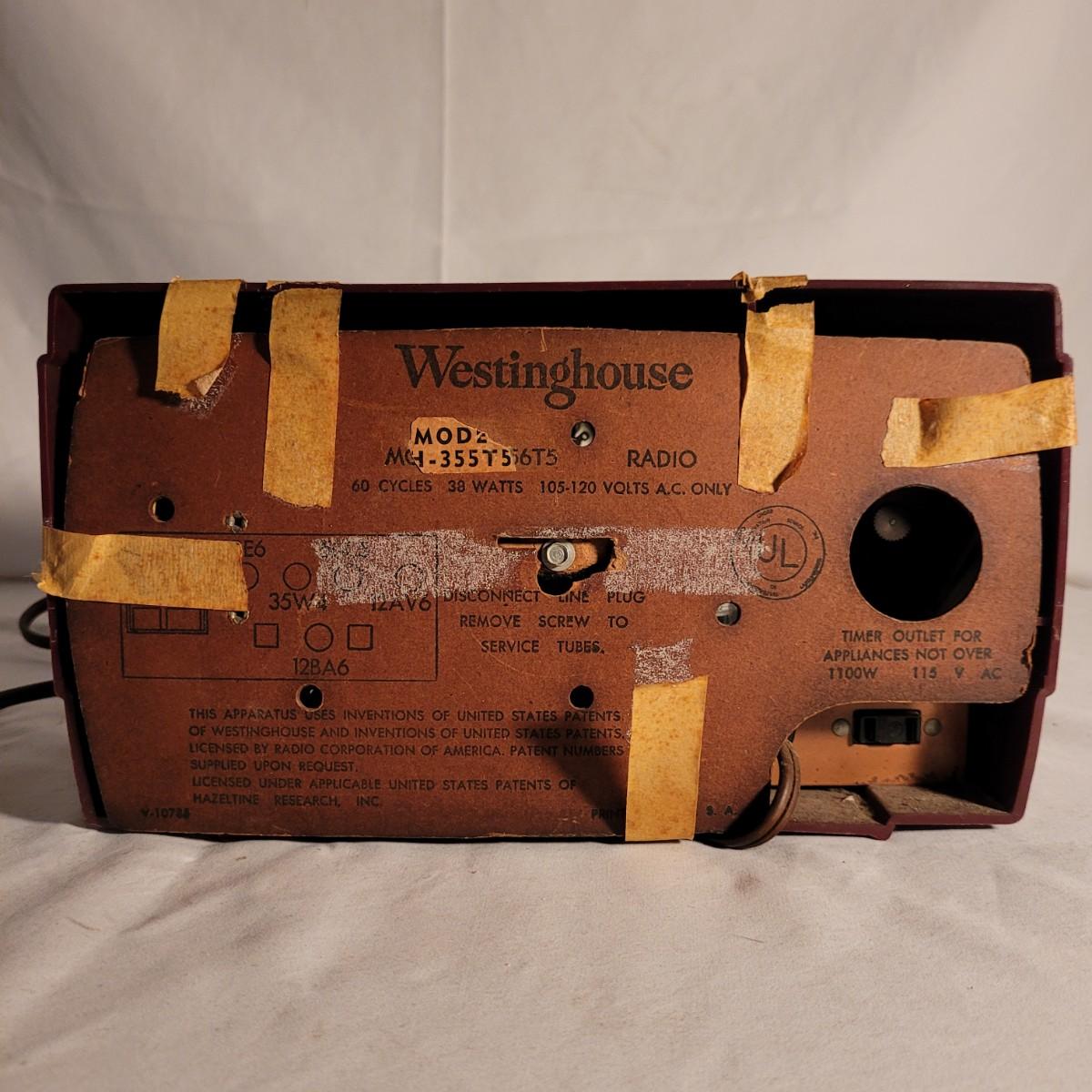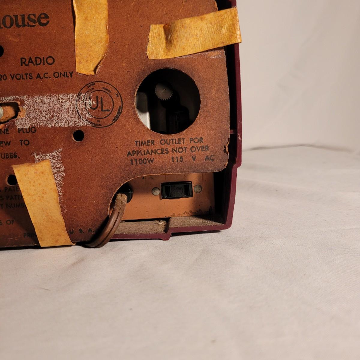 Vintage Westinghouse clock radio. Does not turn on when plugged in. Appears to be missing cord for back. Old tape on back dried and leaving marks. Small crack on top. Measures approximately 11.5"L x6"D x6.5"H. Shipping available.