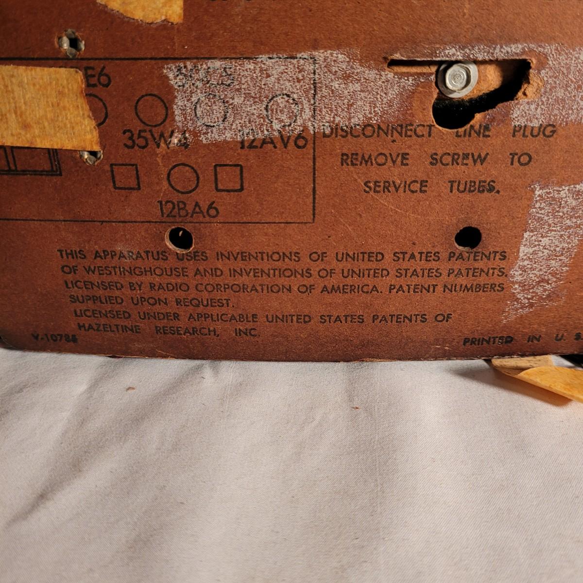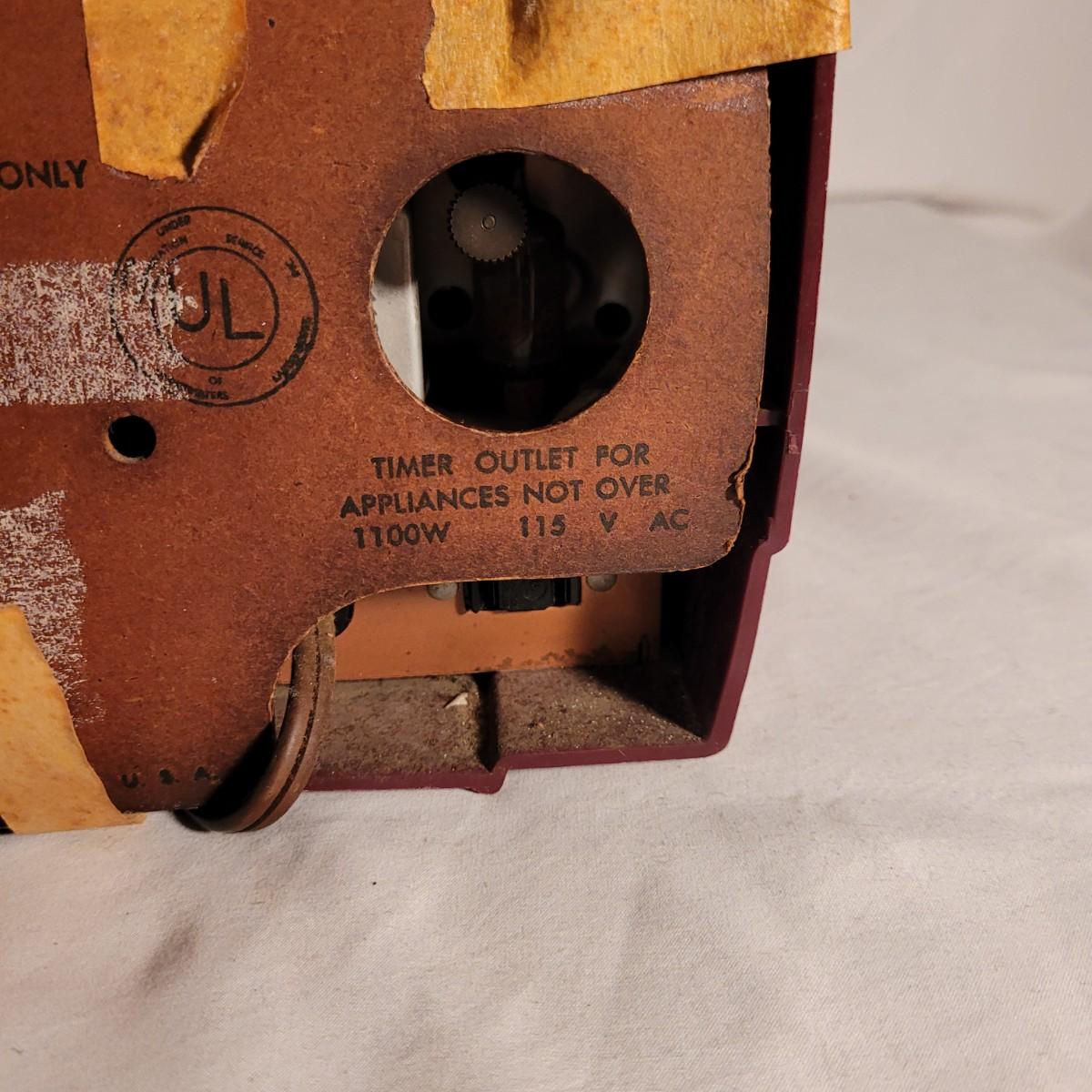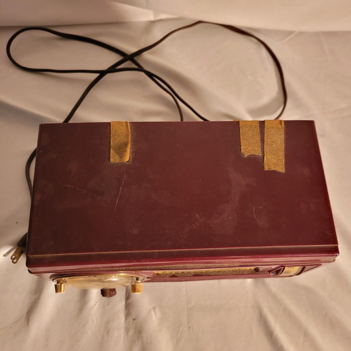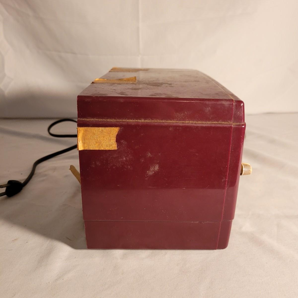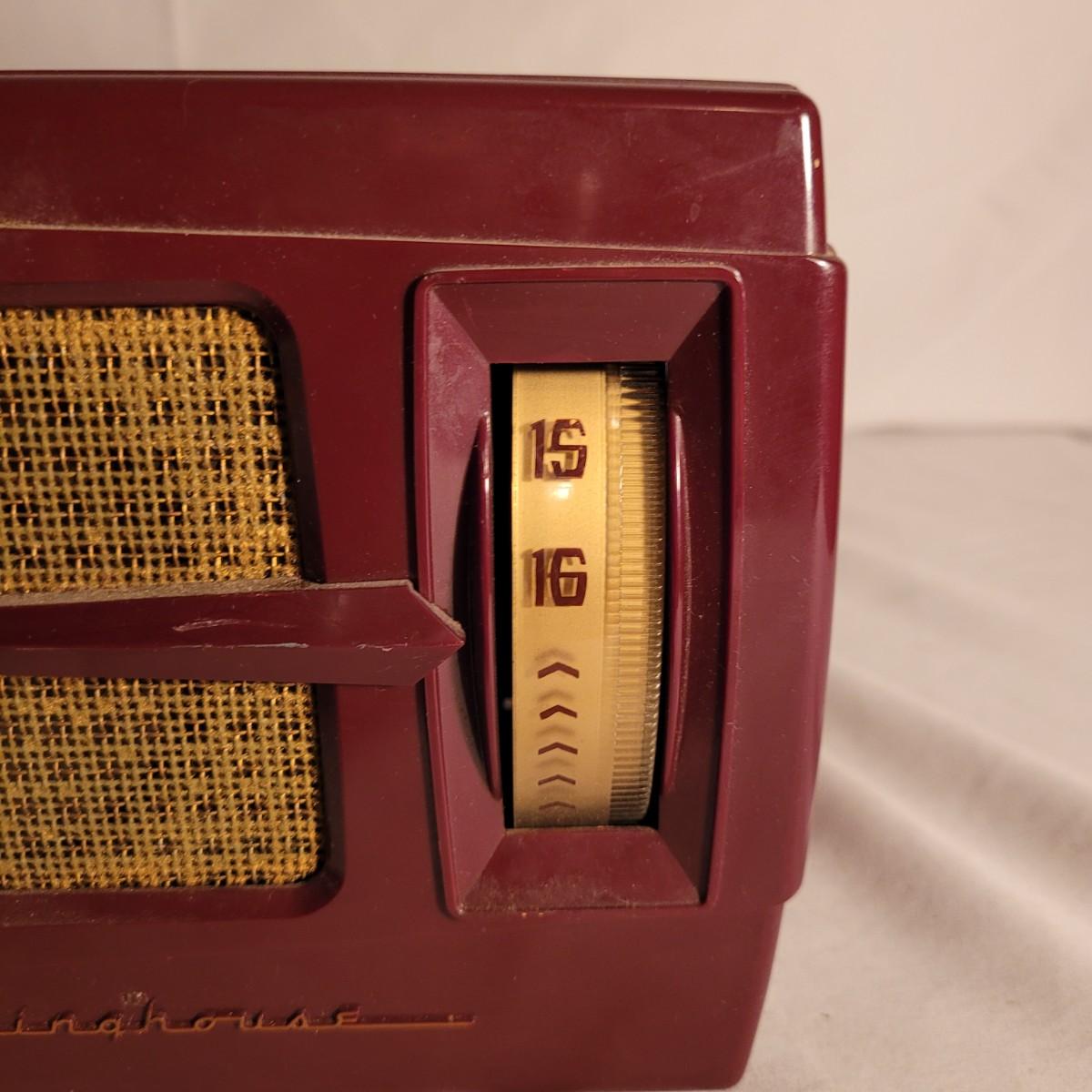 Vintage Westinghouse clock radio. Does not turn on when plugged in. Appears to be missing cord for back. Old tape on back dried and leaving marks. Small crack on top. Measures approximately 11.5"L x6"D x6.5"H. Shipping available.