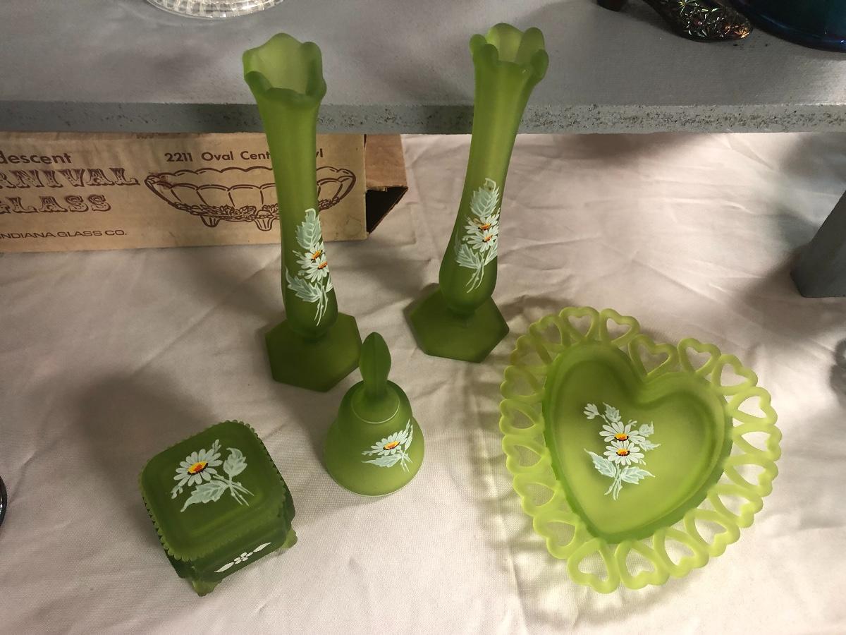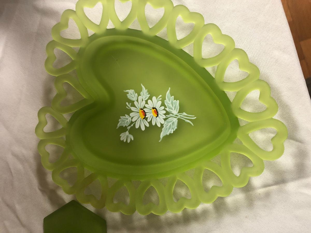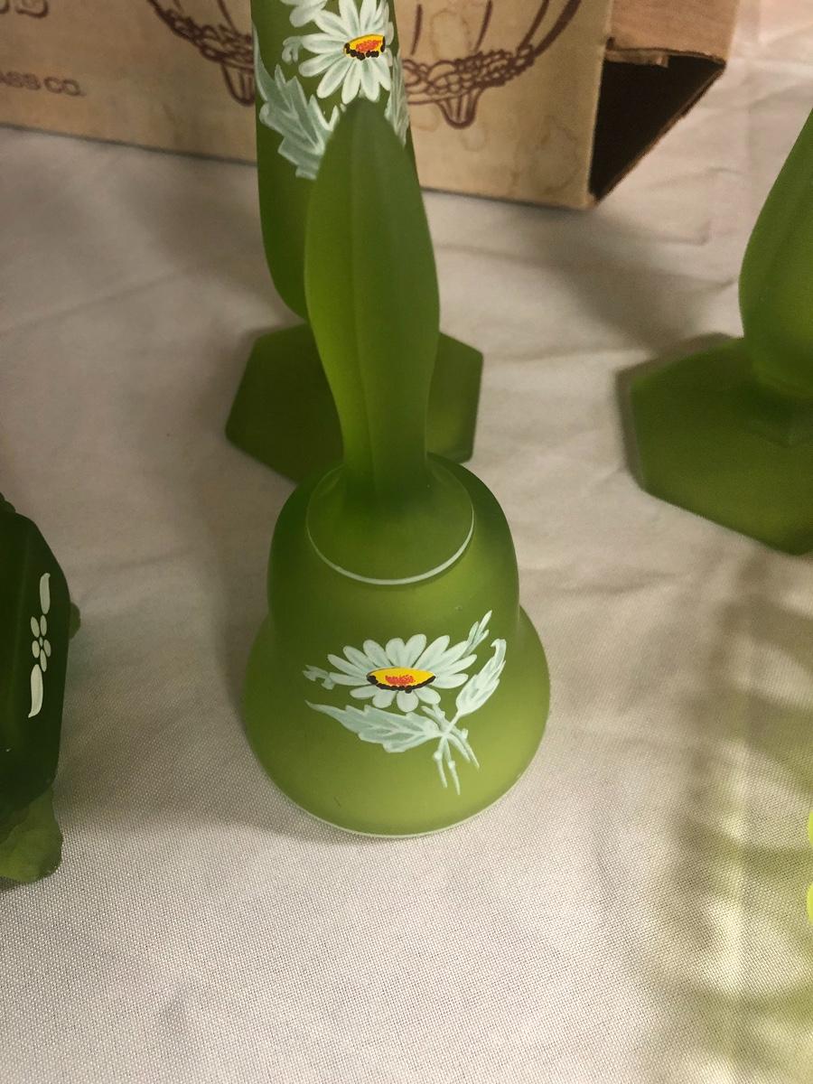 This set is stunning. All hand painted. Plate is 8 x 7. Bell is 5 x 2. Two vases are 9 x 3 and trinket box is 3 x 3