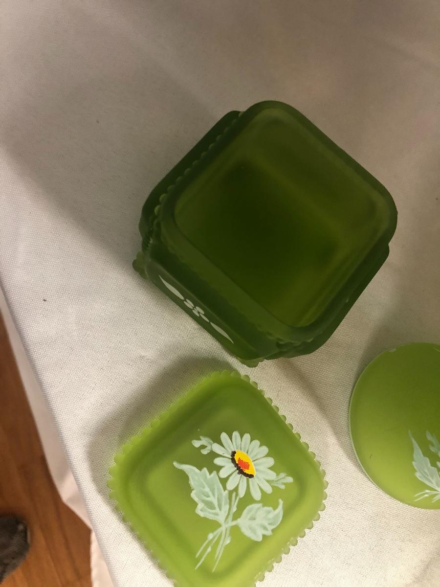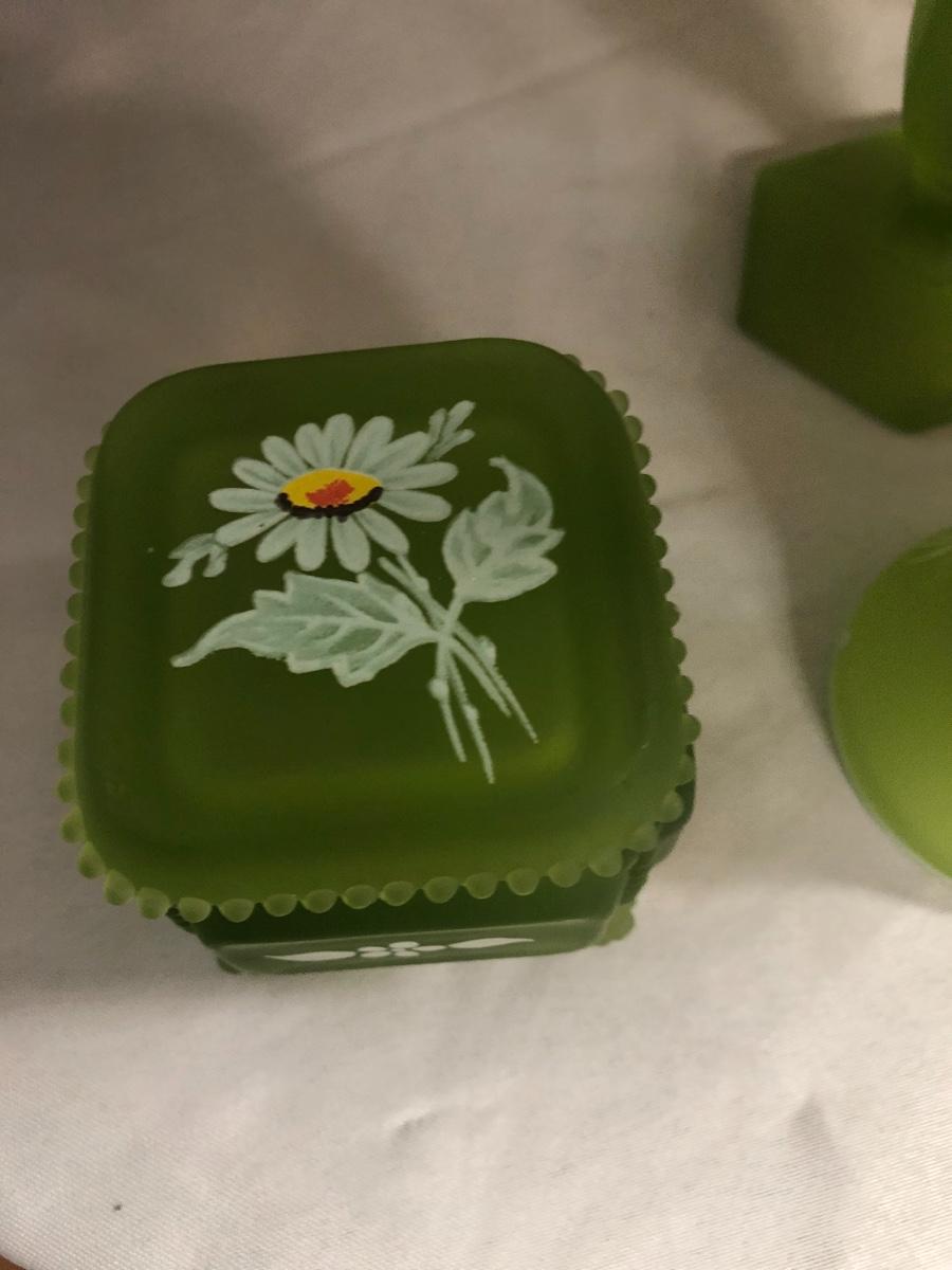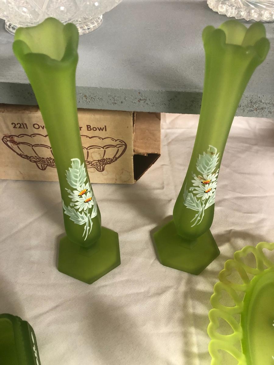 This set is stunning. All hand painted. Plate is 8 x 7. Bell is 5 x 2. Two vases are 9 x 3 and trinket box is 3 x 3