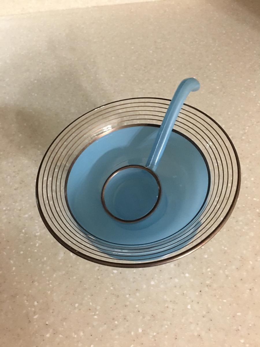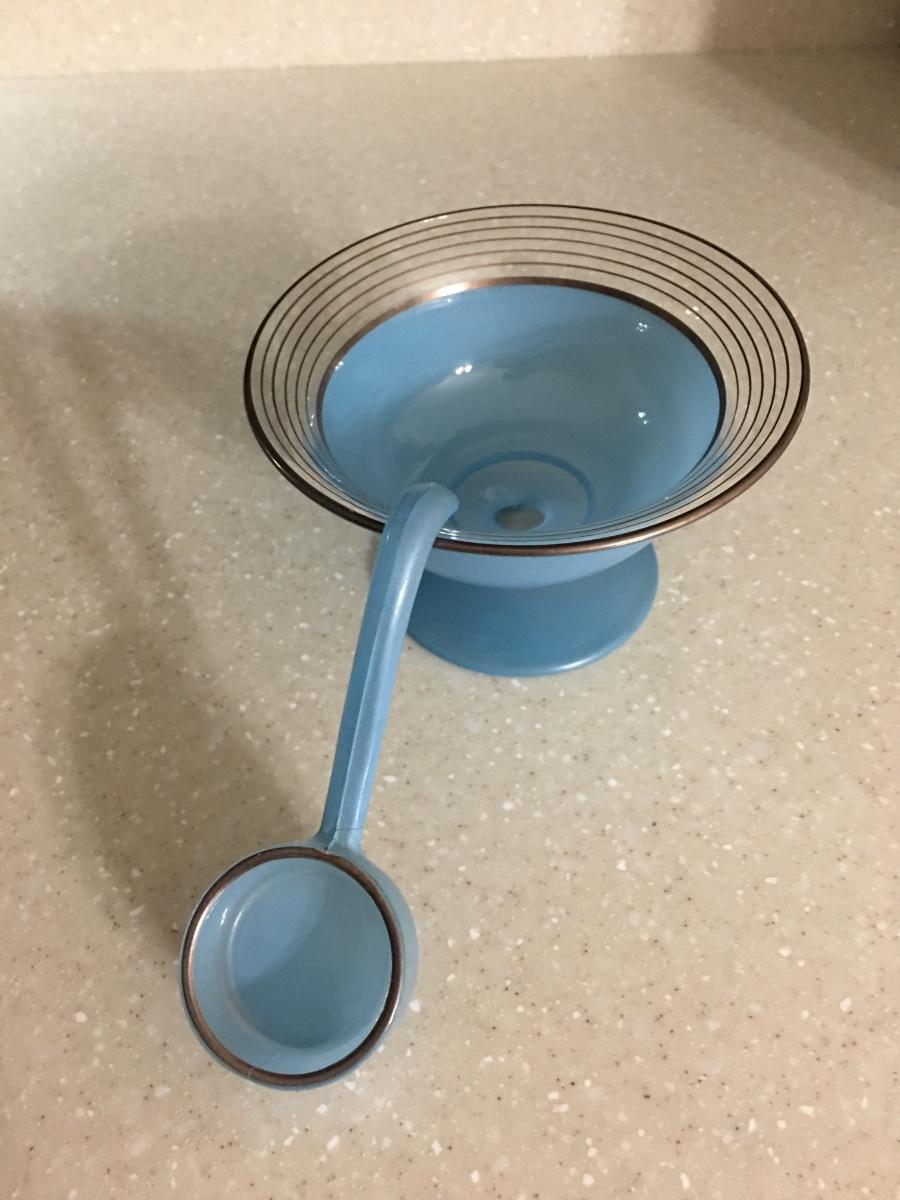 Vintage Westmoreland blue footed gold trim bowl with ladle