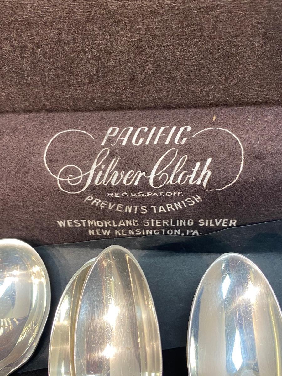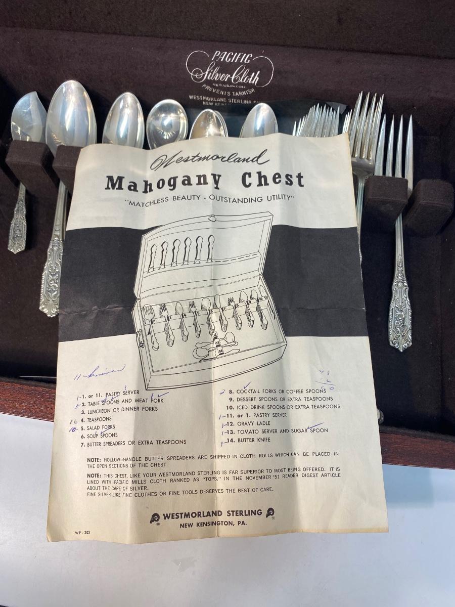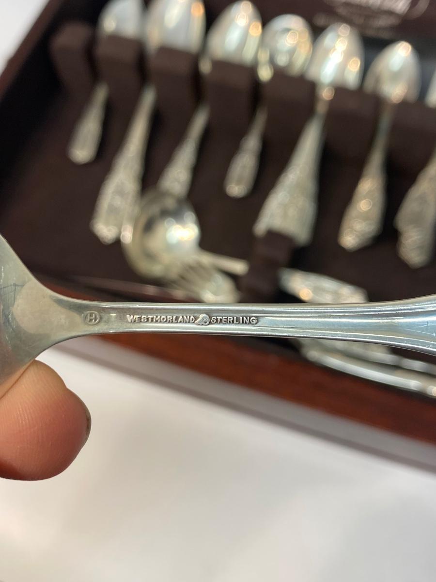 Vintage Westmorland Sterling Silver Flatware Set with Serving Pieces & Storage Box. Beautiful floral pattern - Milburn Rose. In very good condition. Hollow handled pieces weighed separate from solid sterling pieces. Not quite service for 12, missing a few pieces, handwritten list is accurate. Hollow handle 1184g t.w. and solid pieces 2272g t.w.. Similar set is currently for sale on Etsy for $3800.00