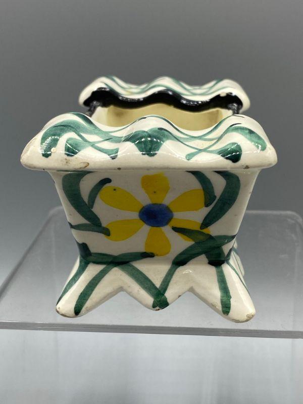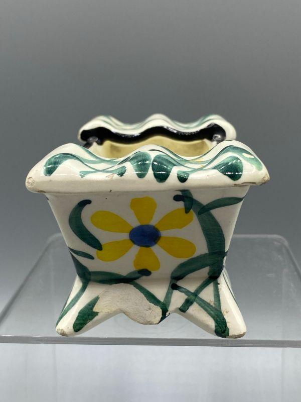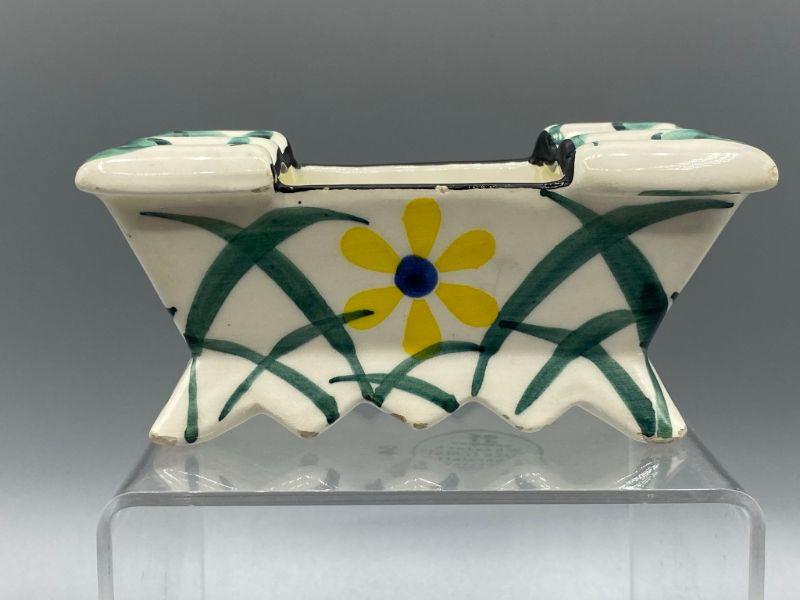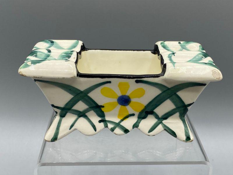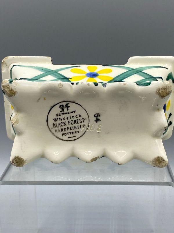 Vintage Wheelock Black Forest Ceramic dish. Hand Painted flower design. Could be used as an ashtray or maybe a toothpick holder. Small 4" size. Does have a couple small chips along edges and corners. Stamped on the bottom.