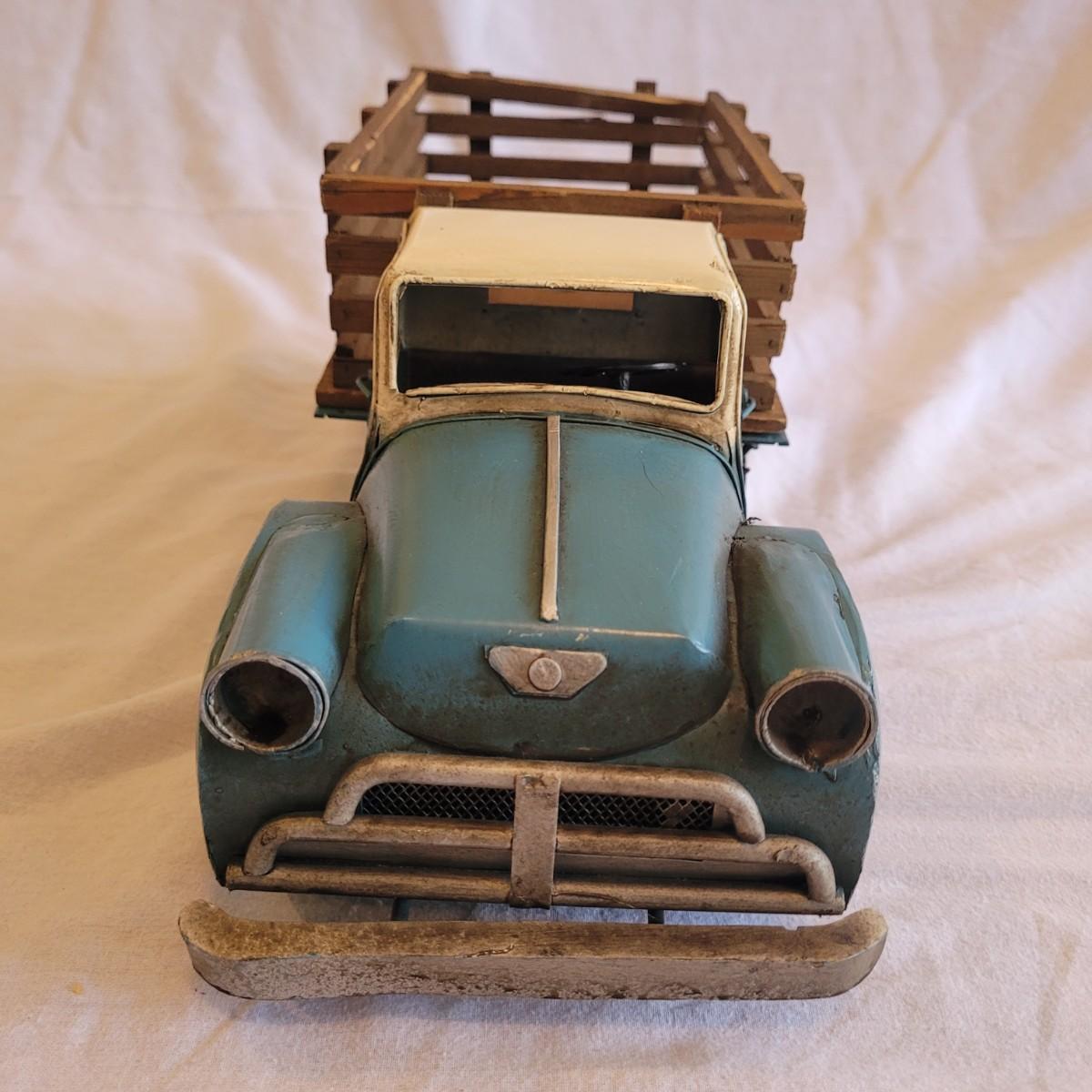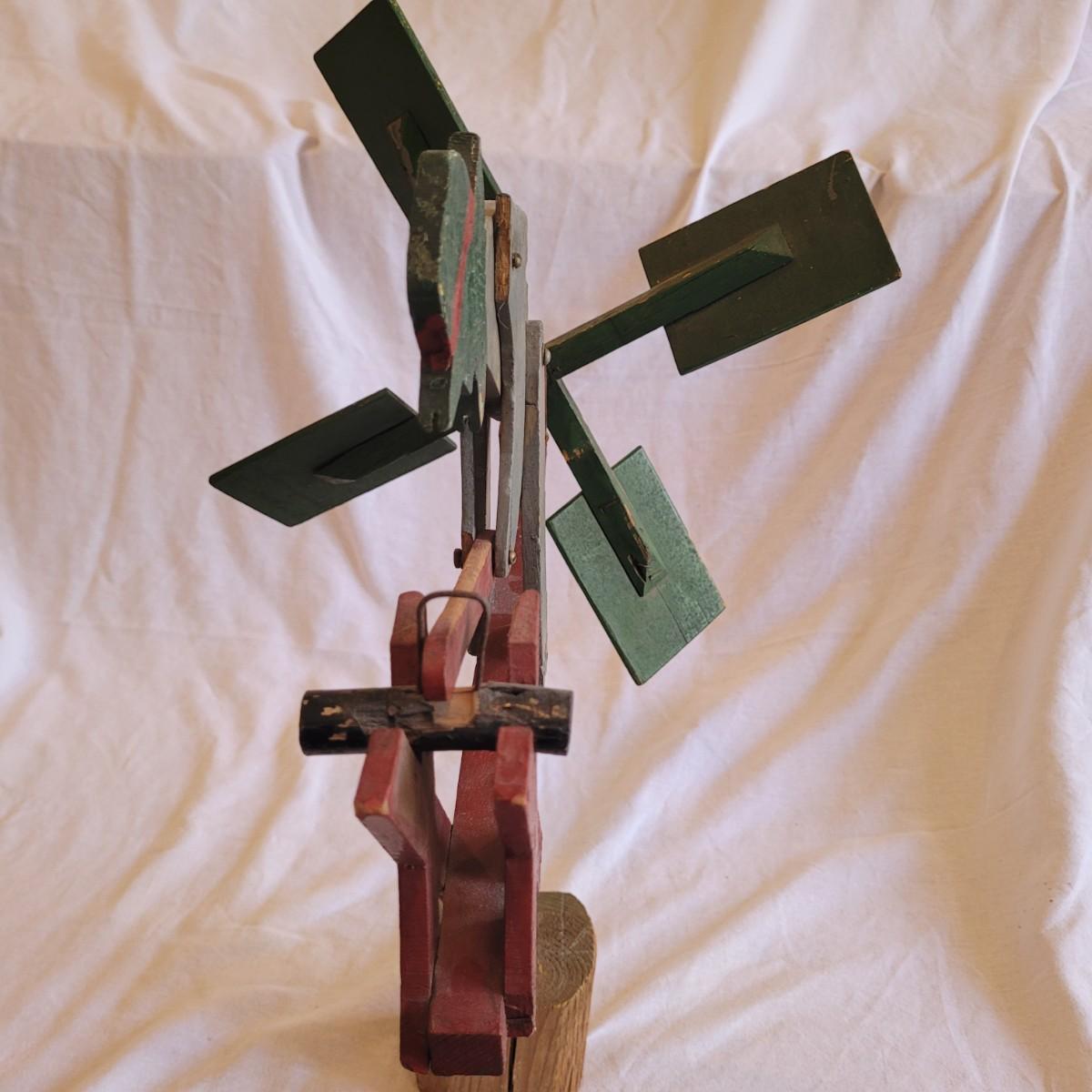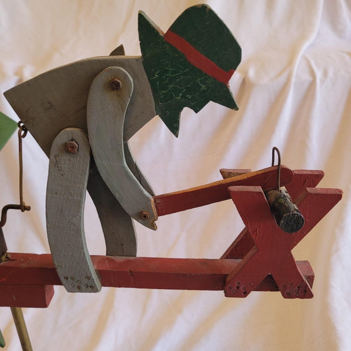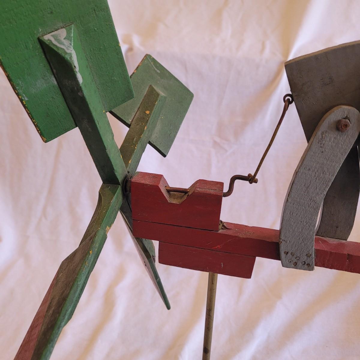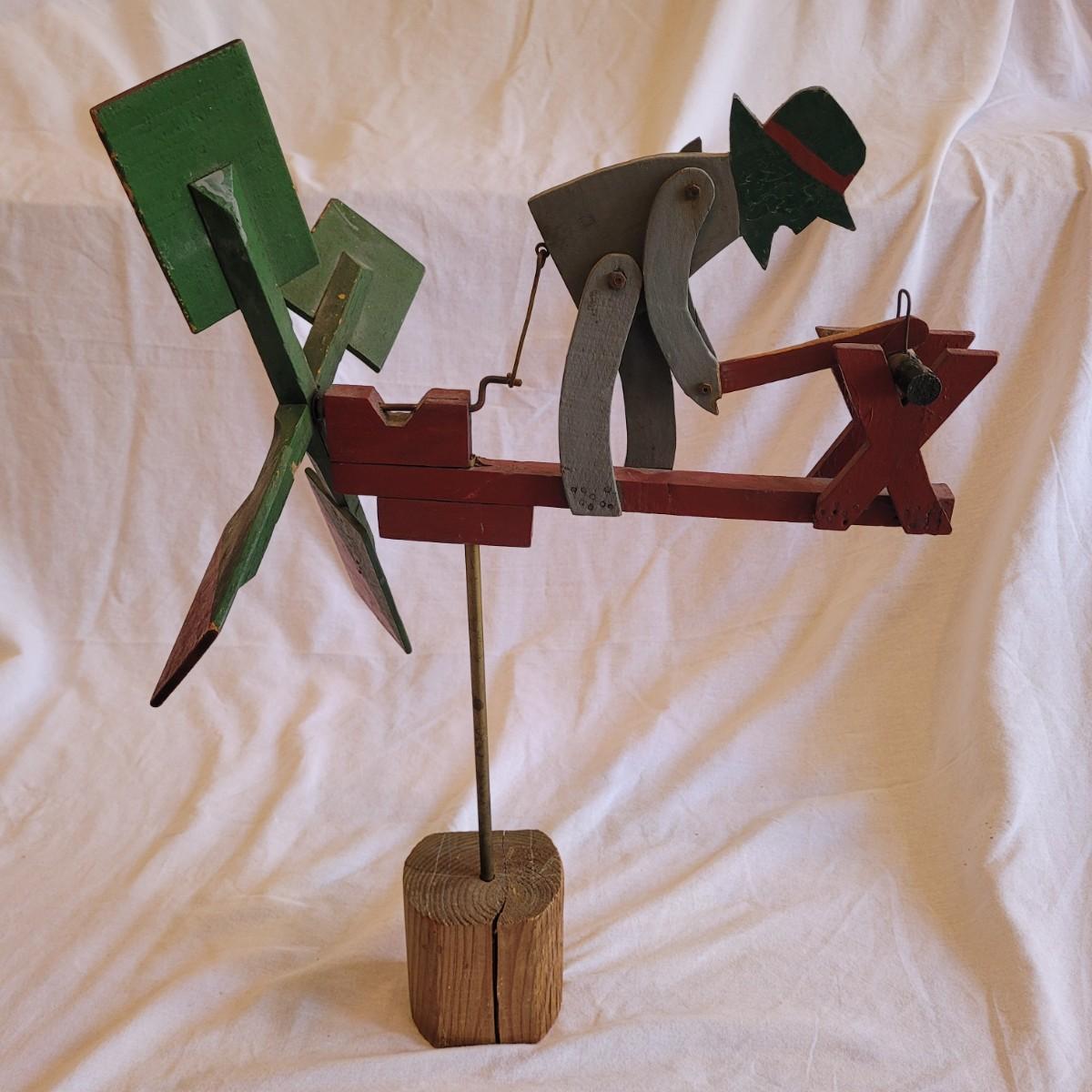 This lot contains two items. One of which is a vintage whirligig, a type of wind-powered kinetic folk art. It depicts a man sawing wood, with the action animated by a propeller. When the propeller spins, it causes the man to move his saw back and forth. It is considered American folk art, likely from the 1940s. It is designed to be a whimsical, moving garden ornament. It is made of wood and metal and measures approximately 16" x 16" x 25"H. The second item is reproduction of a vintage Tonka stake bed truck. It is made from metal with wooden and rubber parts. There is some damage to the wooden truck bed. It measures 7" x 16" x 5.5"H.