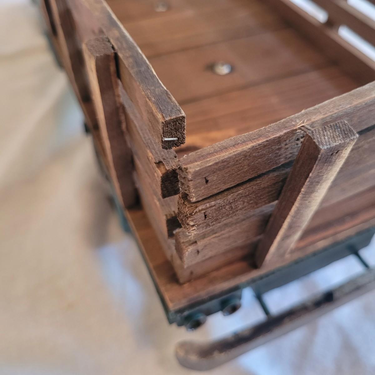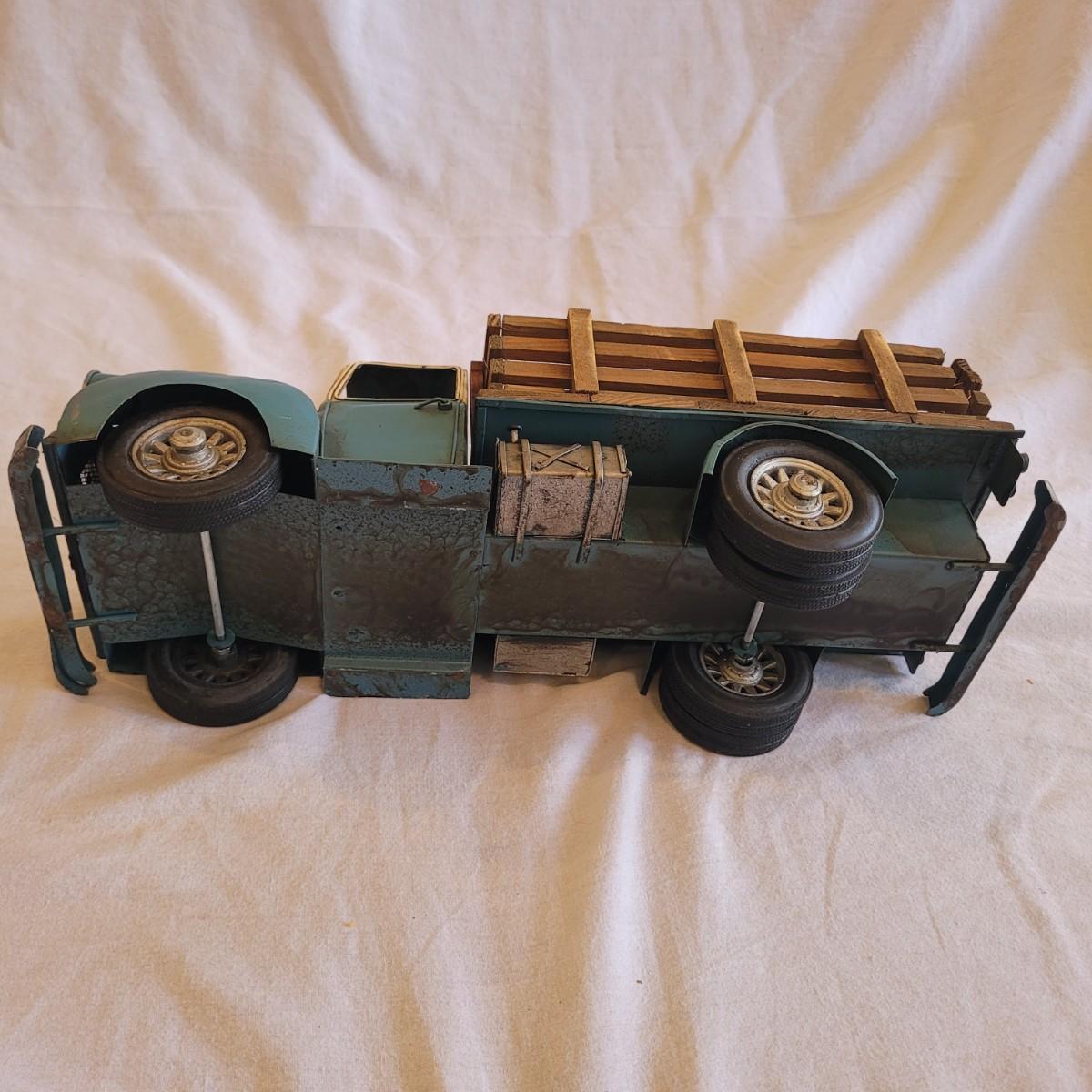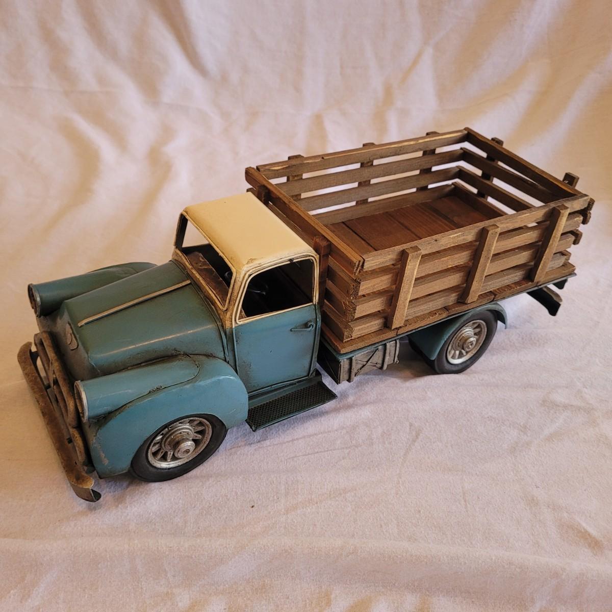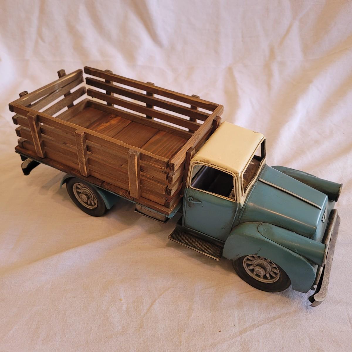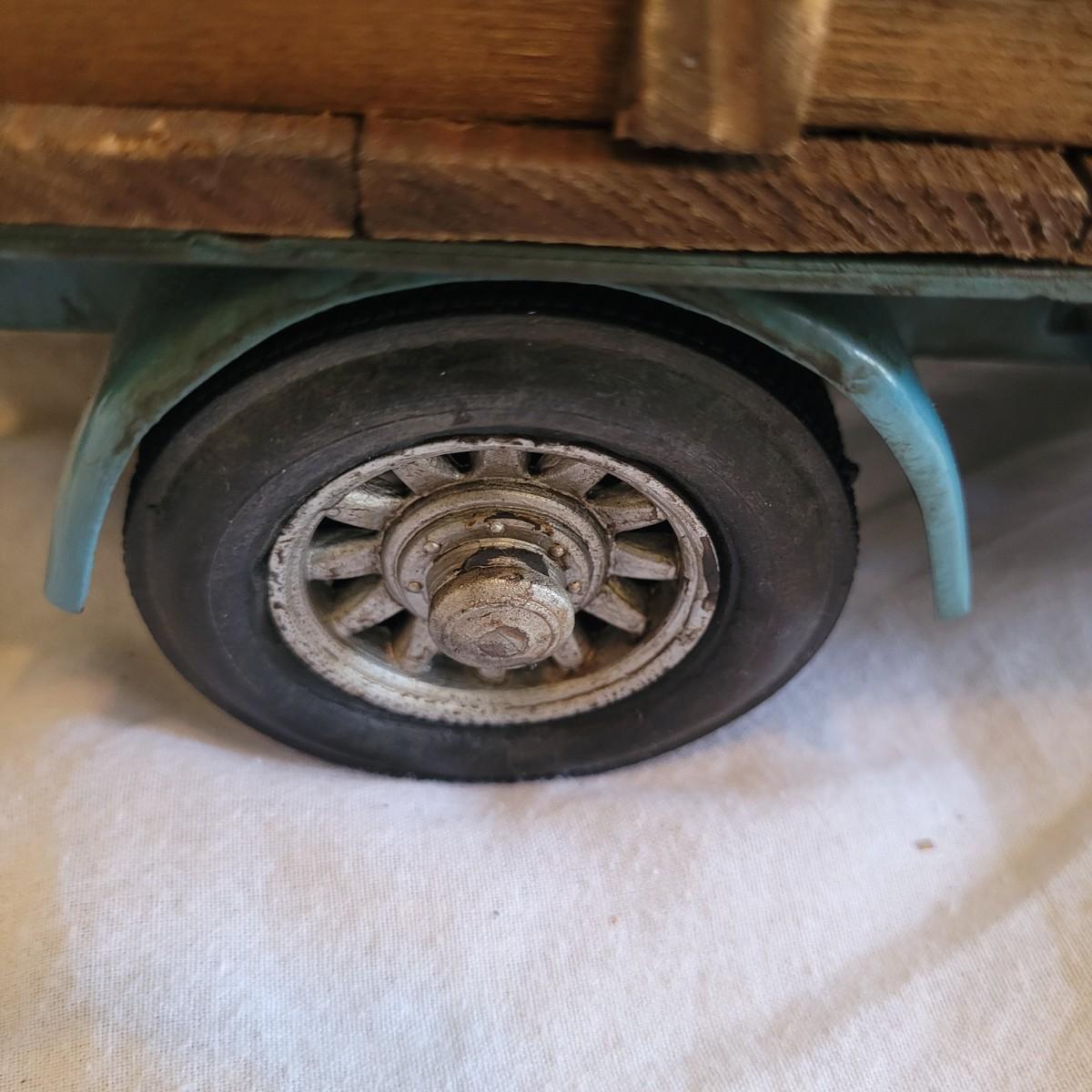 This lot contains two items. One of which is a vintage whirligig, a type of wind-powered kinetic folk art. It depicts a man sawing wood, with the action animated by a propeller. When the propeller spins, it causes the man to move his saw back and forth. It is considered American folk art, likely from the 1940s. It is designed to be a whimsical, moving garden ornament. It is made of wood and metal and measures approximately 16" x 16" x 25"H. The second item is reproduction of a vintage Tonka stake bed truck. It is made from metal with wooden and rubber parts. There is some damage to the wooden truck bed. It measures 7" x 16" x 5.5"H.
