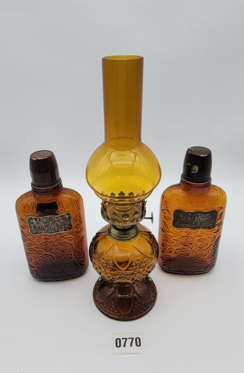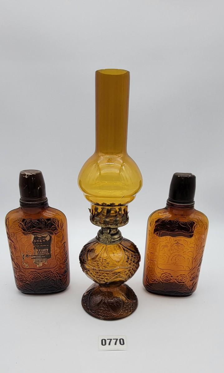 Vintage Whiskey Bottles and Oil Lamp
