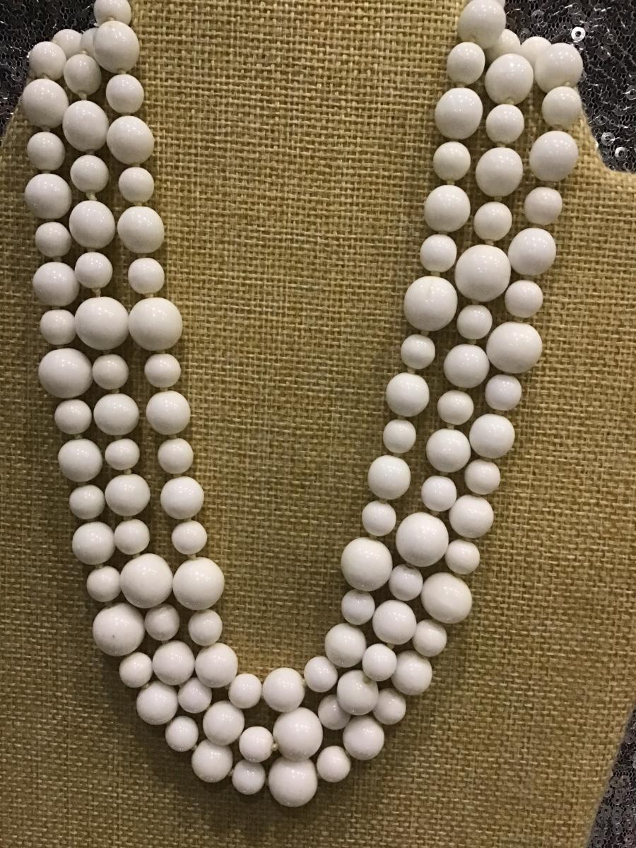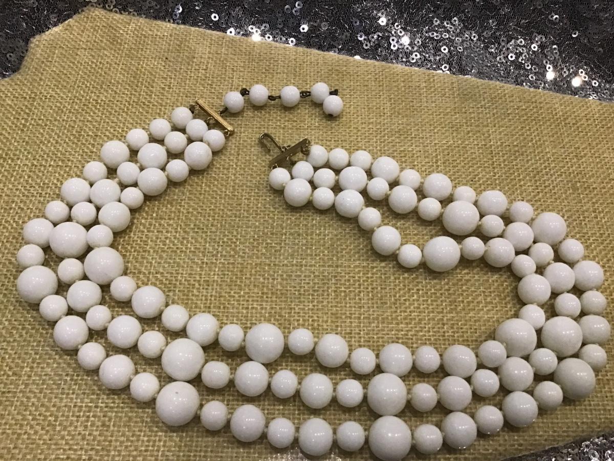 Vintage White 3-Strand Faux Milk Glass Beaded Mid-Century Style Necklace