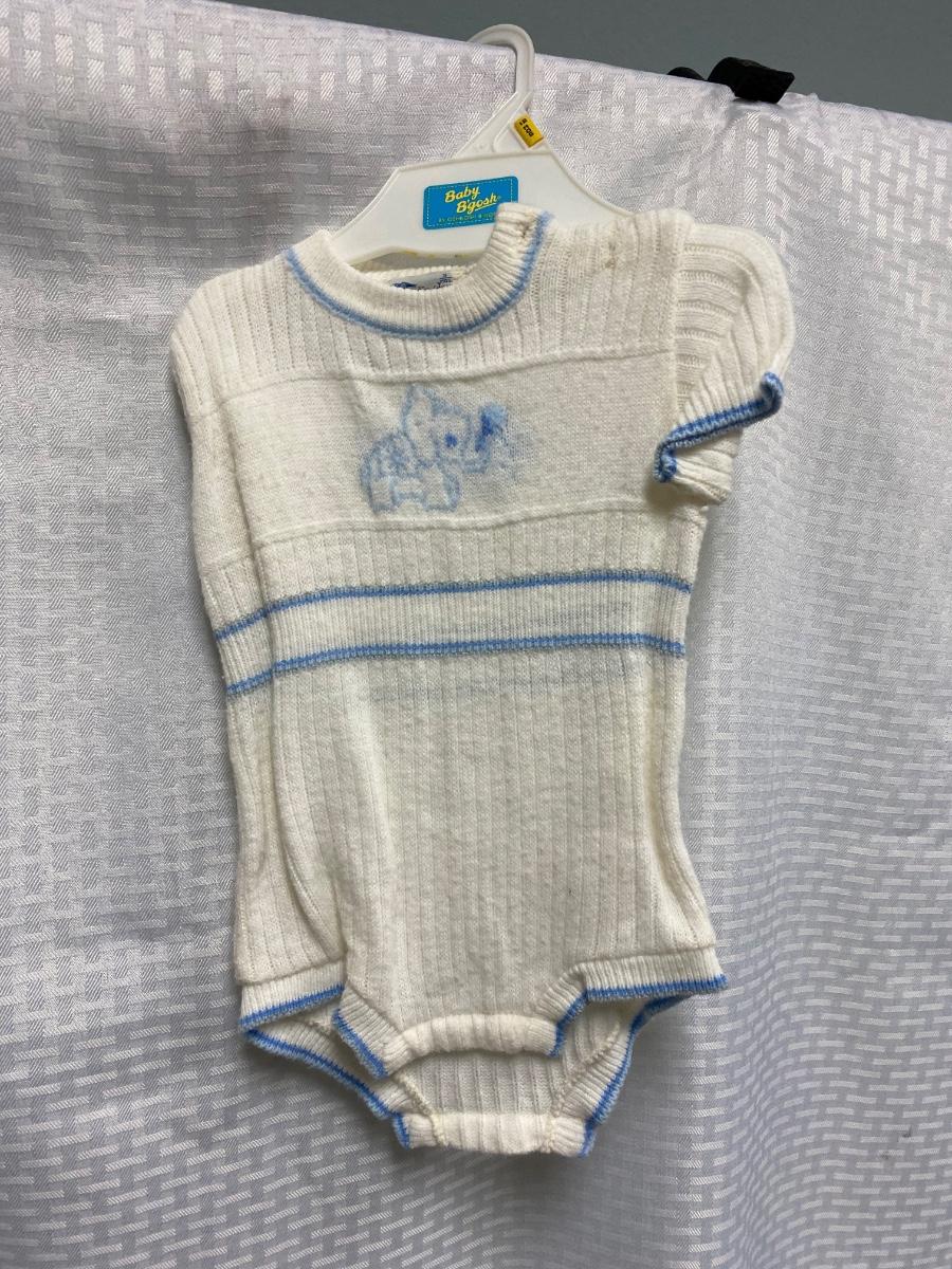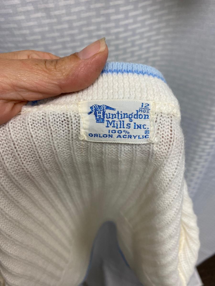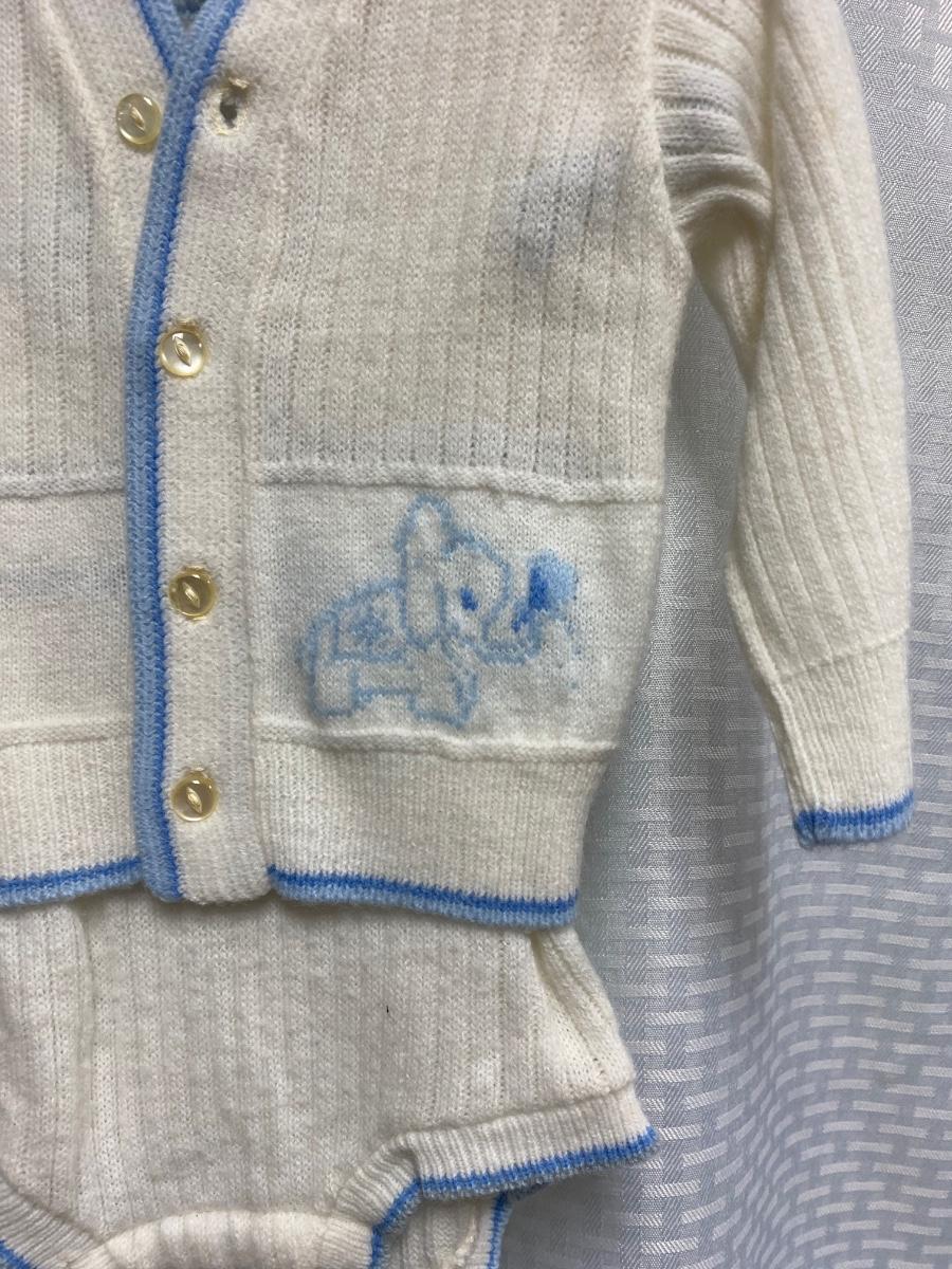 Vintage White & Blue Infant Sweater Set Elephant Onesie Cardigan Huntington Mills 9-12 month. In good vintage condition. No spots or holes and it doesn't look to have discolor either.