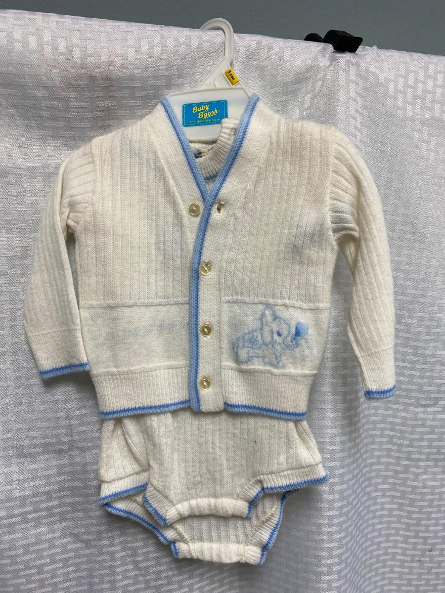 Vintage White & Blue Infant Sweater Set Elephant Onesie Cardigan Huntington Mills 9-12 month