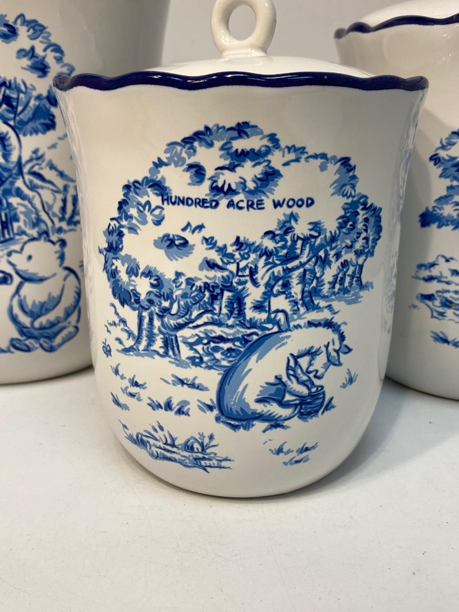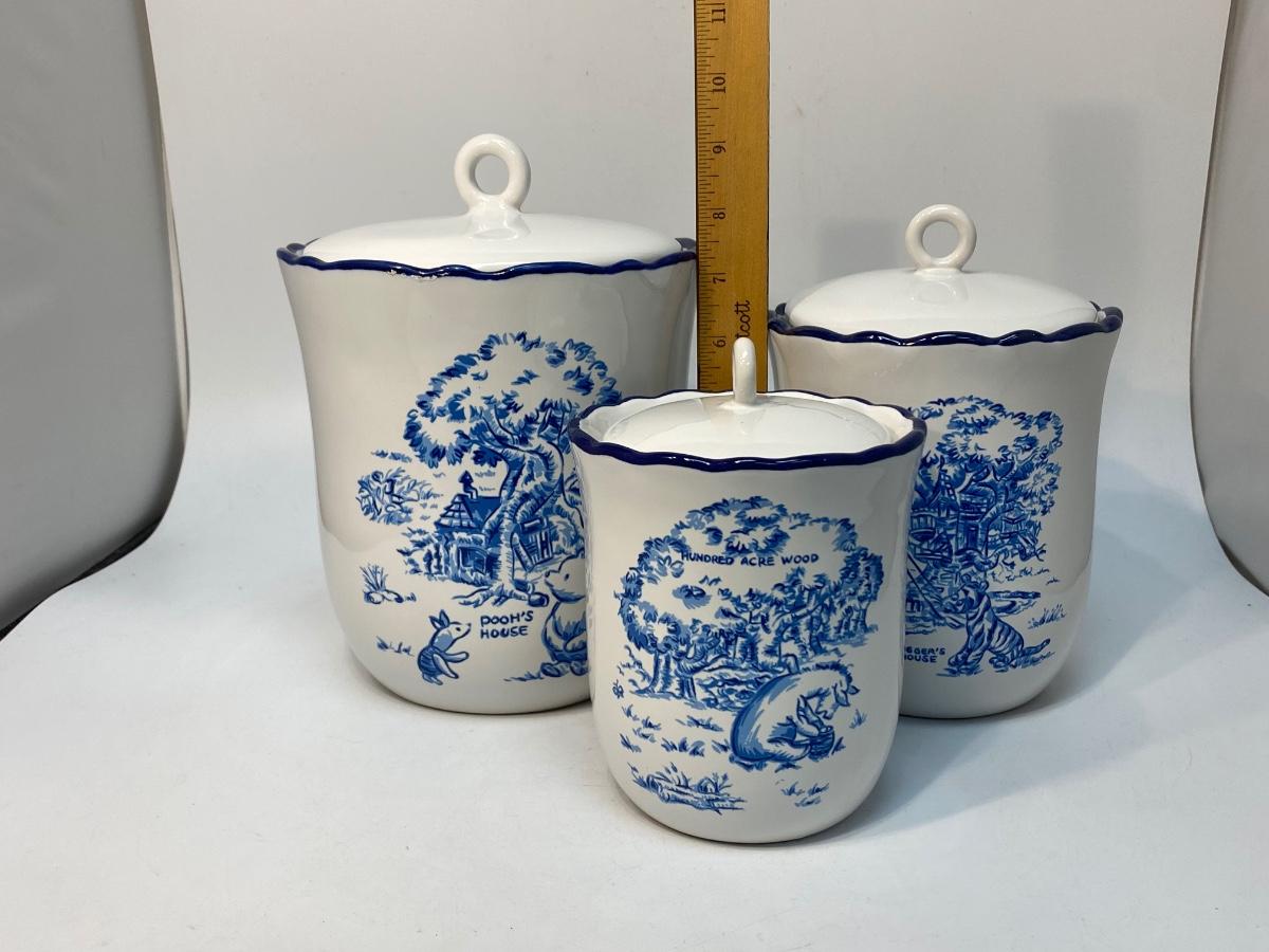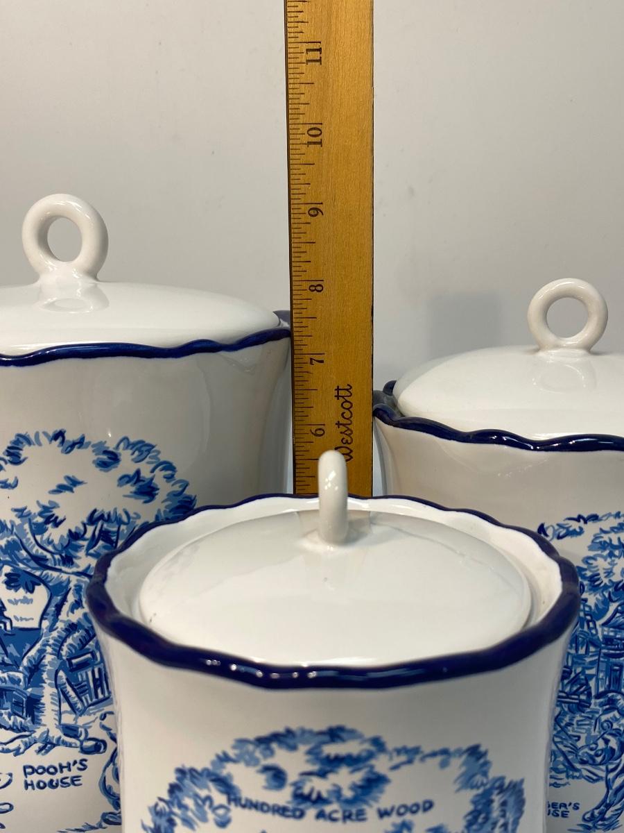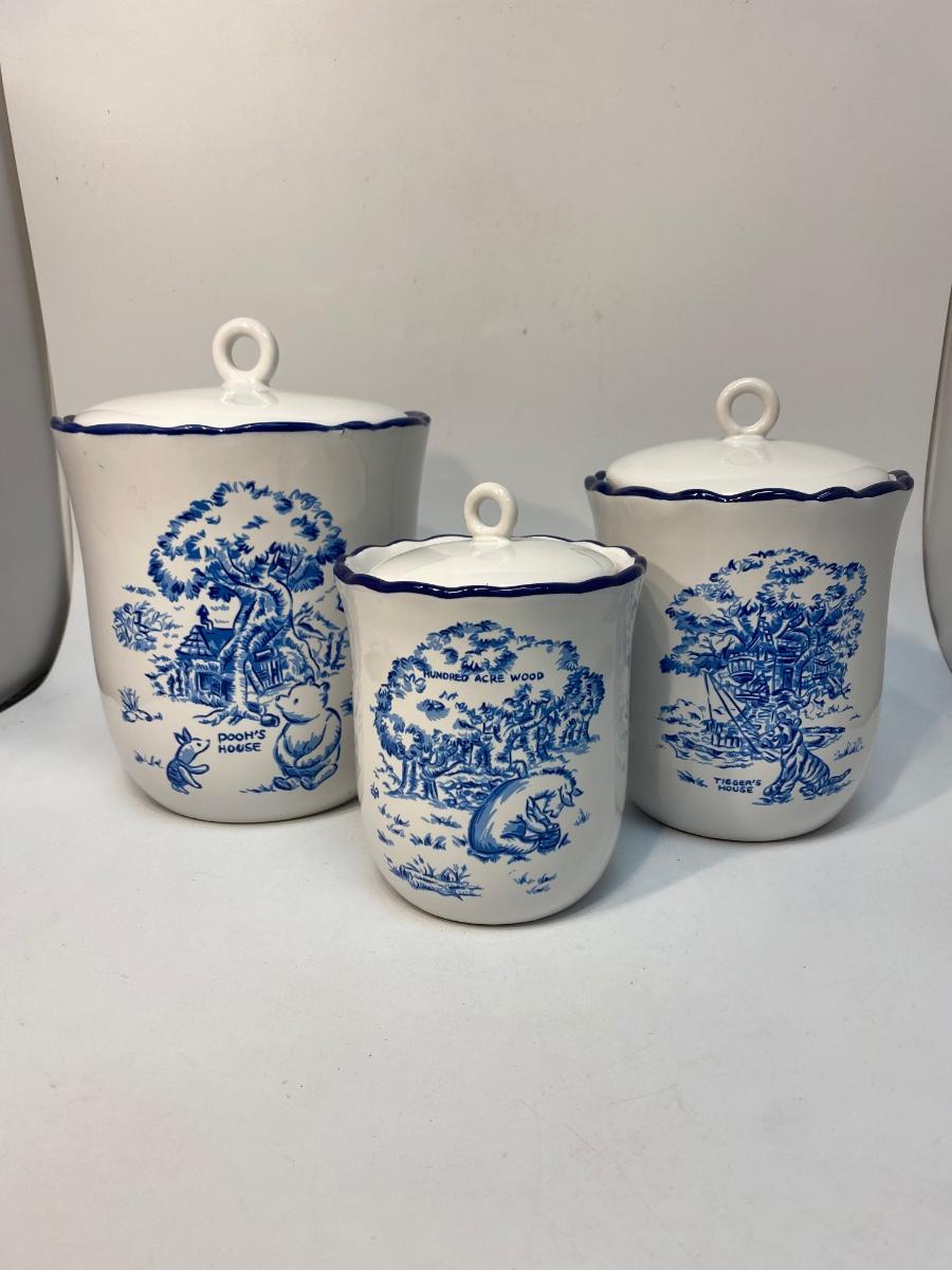 Vintage White & Blue Delft Inspired Winnie the Pooh Three Piece Canister Set. In good condition. Stoneware canisters. No chips but there is a manufacture flaw on one canister, see photo. Sizes range between 6 and 9.5" size.