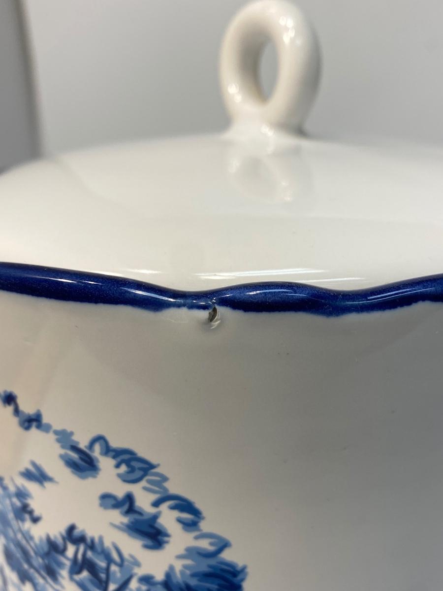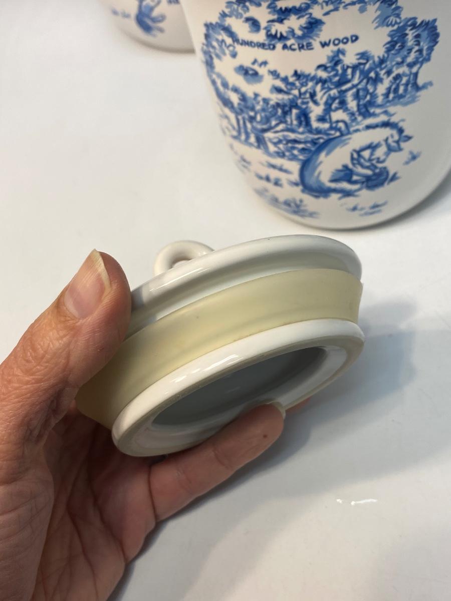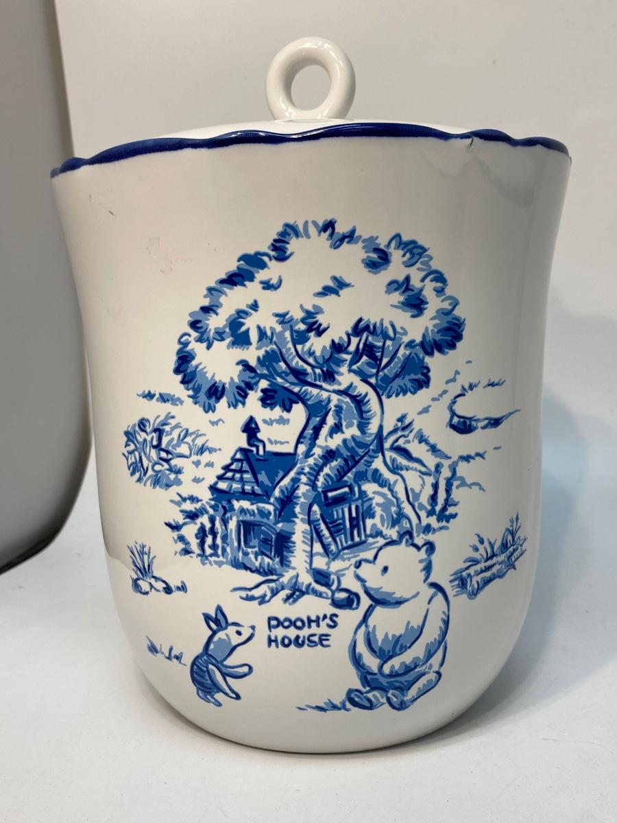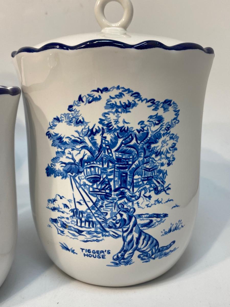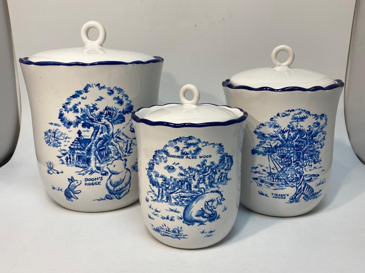 Vintage White & Blue Delft Inspired Winnie the Pooh Three Piece Canister Set. In good condition. Stoneware canisters. No chips but there is a manufacture flaw on one canister, see photo. Sizes range between 6 and 9.5" size.