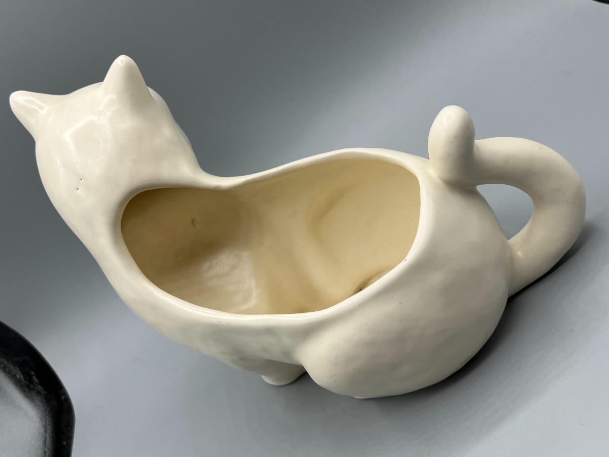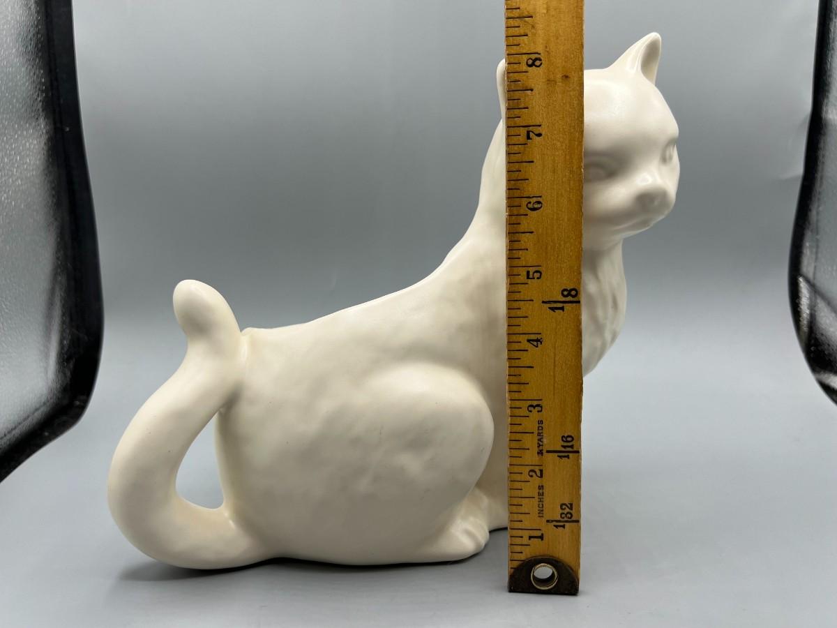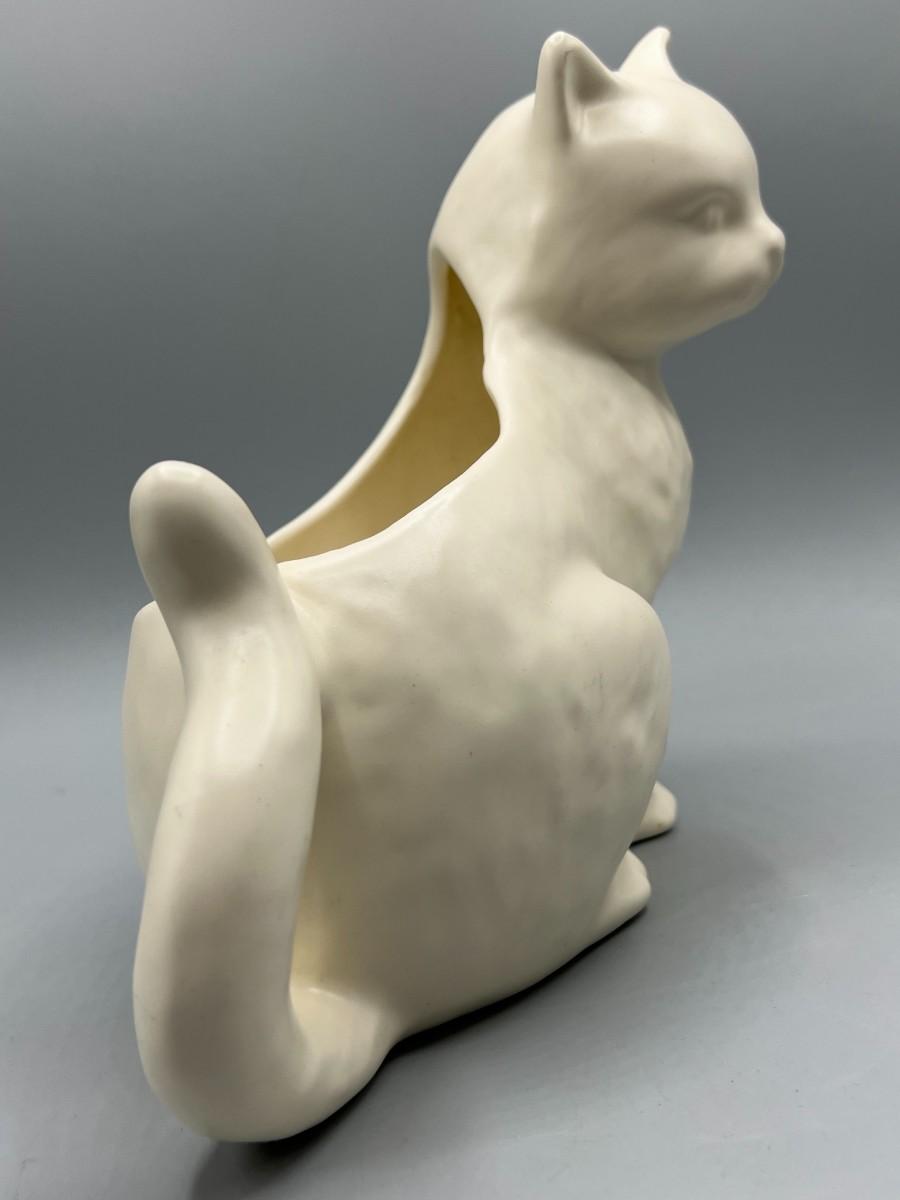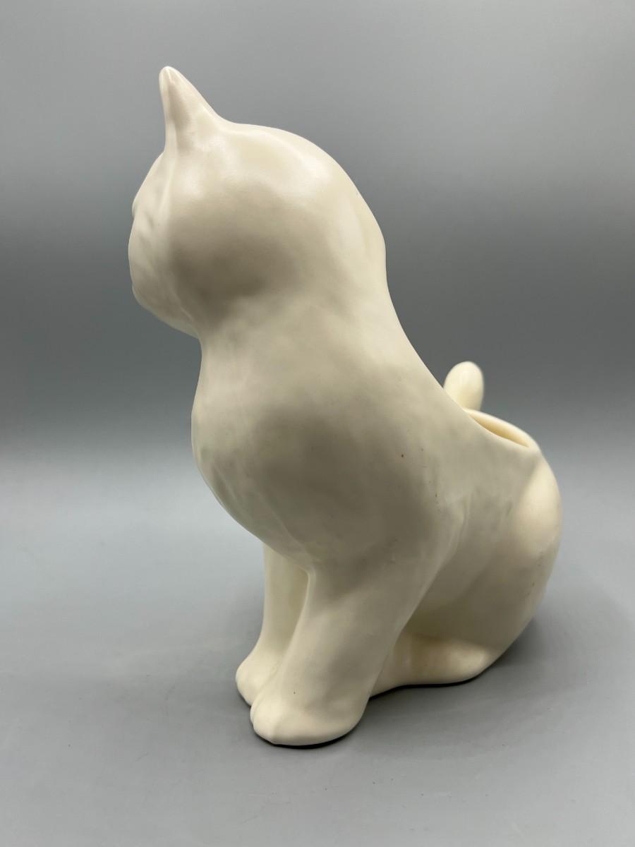 Vintage white cat figurine planter pot. Solid white finish. In good vintage condition. About 8" tall. Unbranded.
