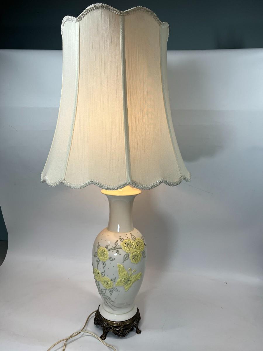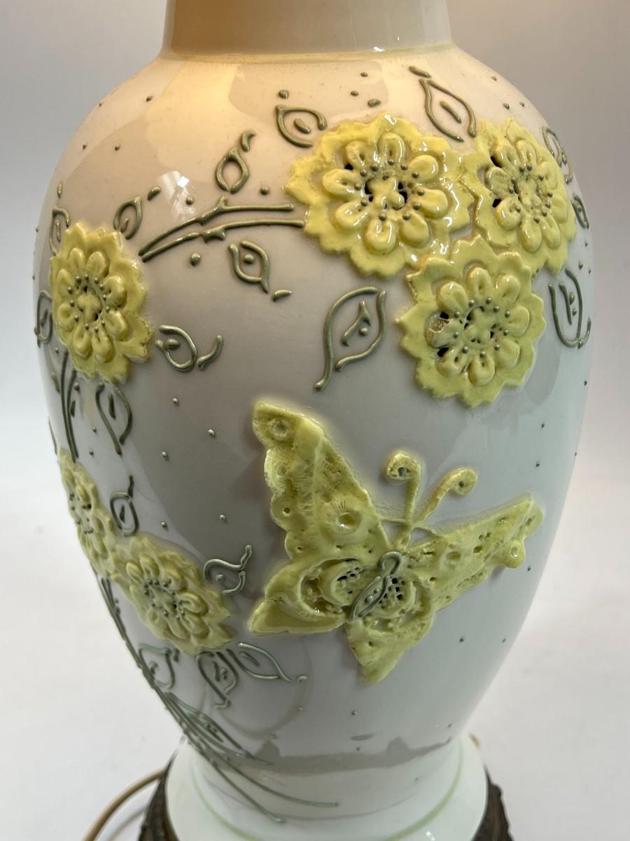 Vintage White Ceramic Table Lamp with Embossed Raised Yellow Flower and Butterfly Pattern. In good condition. Works.