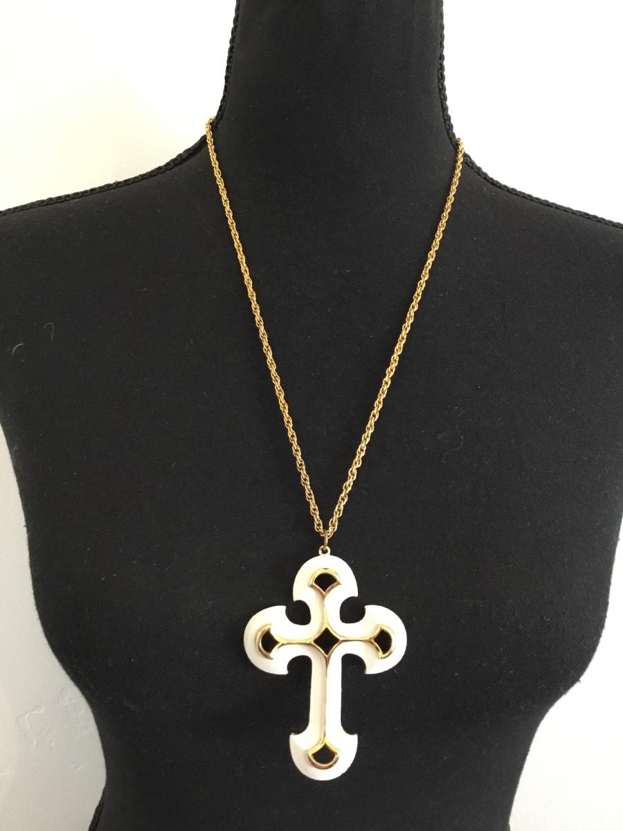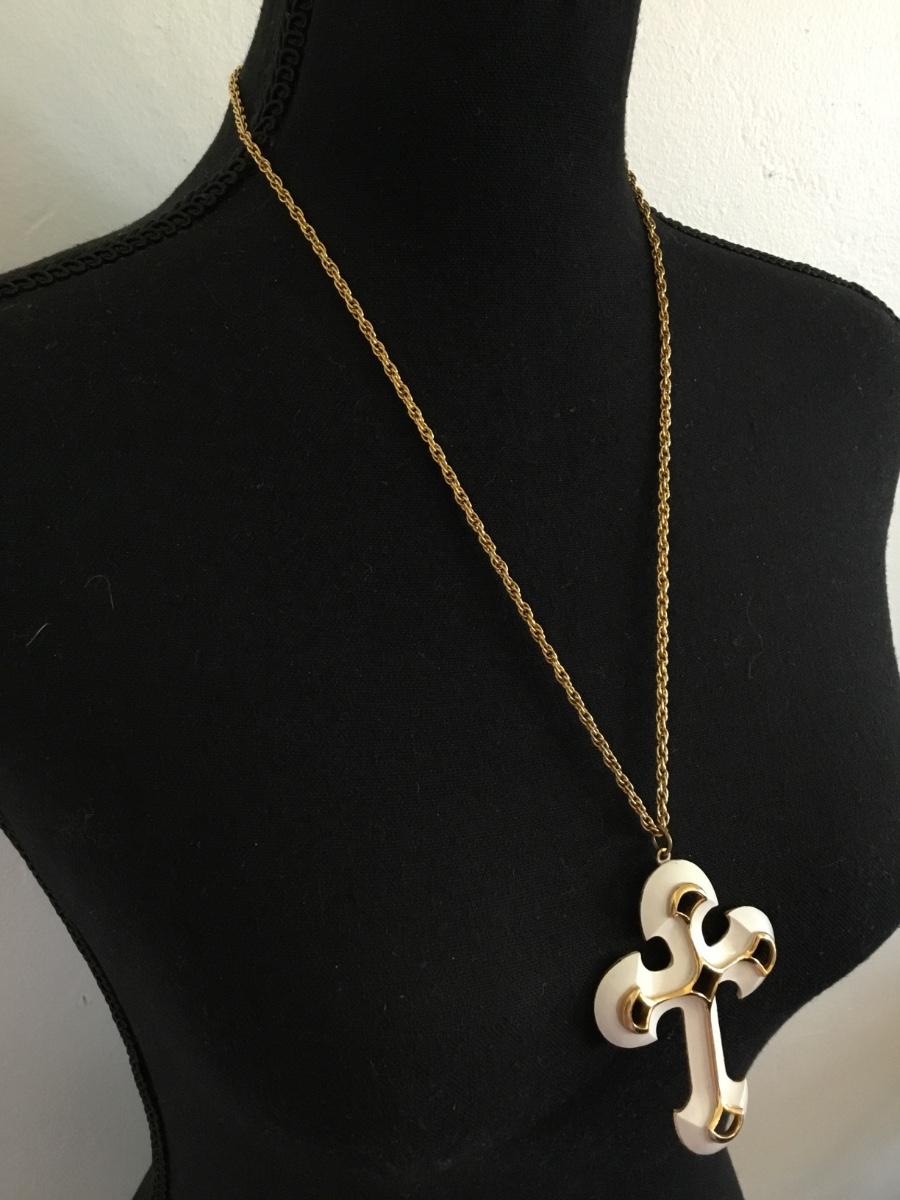 Vintage White enamel cross, pendant, and vintage gold tone chain necklace