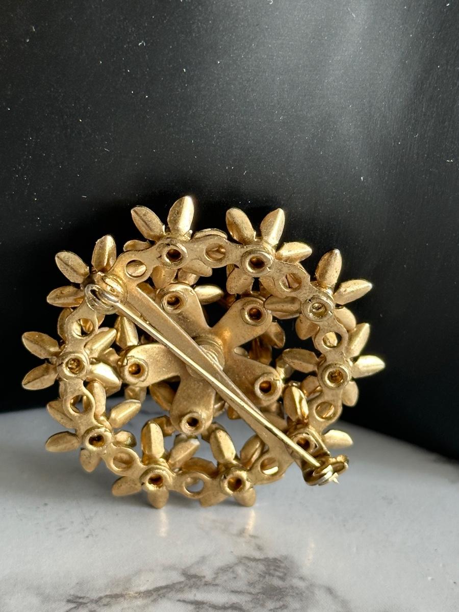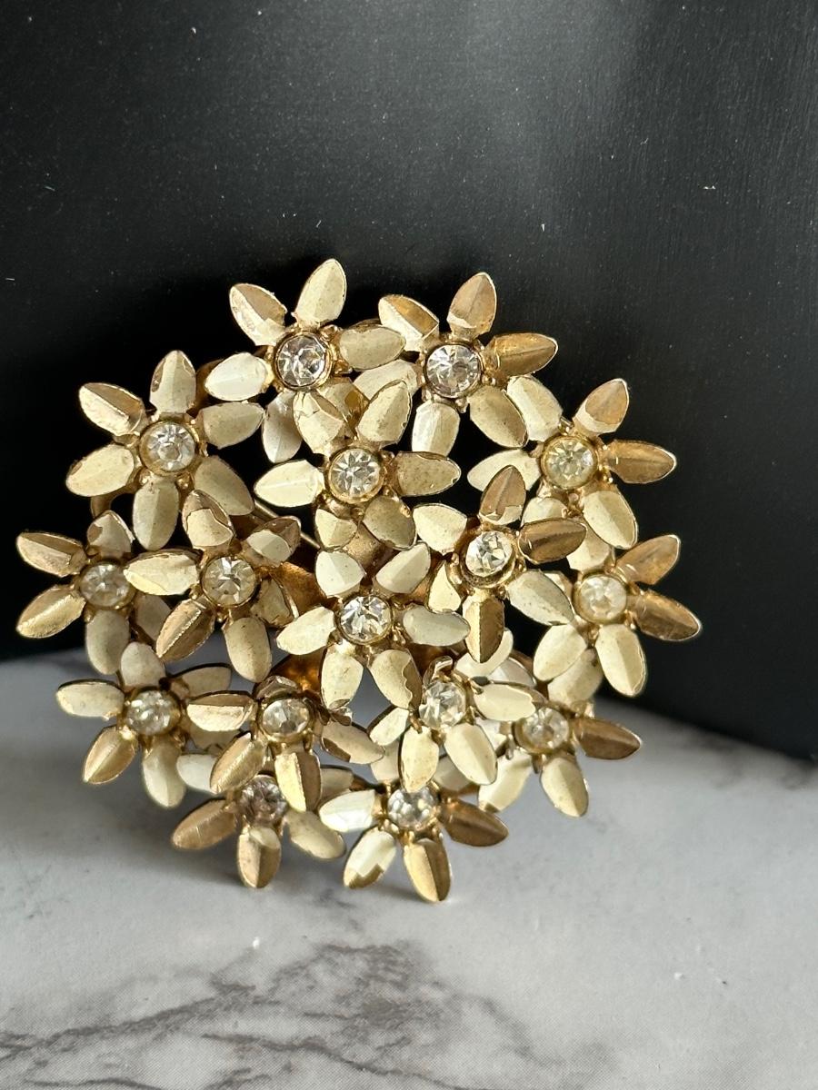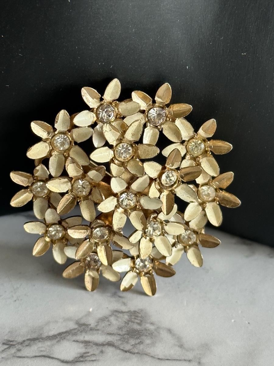 Vintage White Enamel Daisy Flower Faux Seed Pearls Rhinestone Brooch Pin