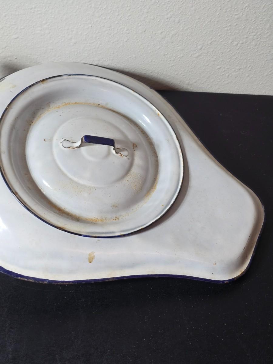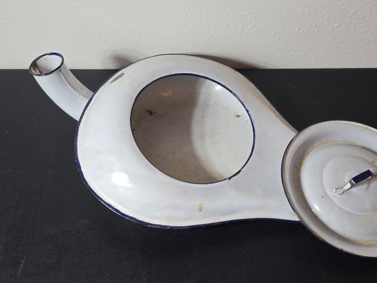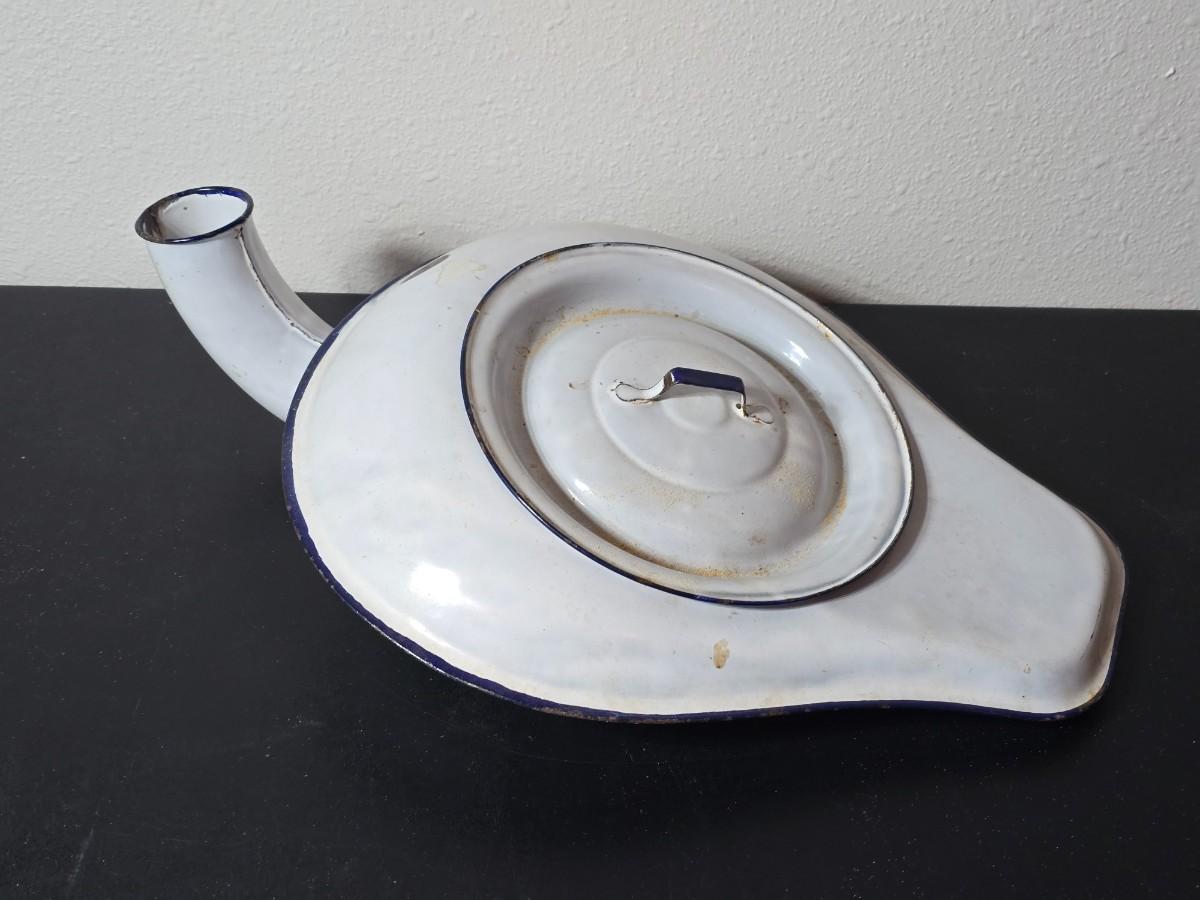 Vintage White Enamelware w/Blue Trim Bedpan / Urinal Combination Chamber pot with Lid, Antique Primitive Medical Device