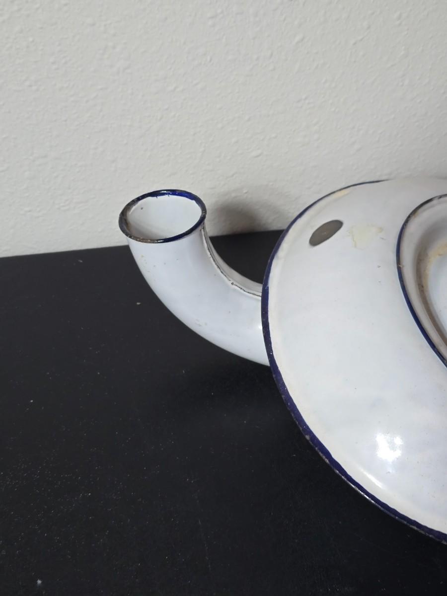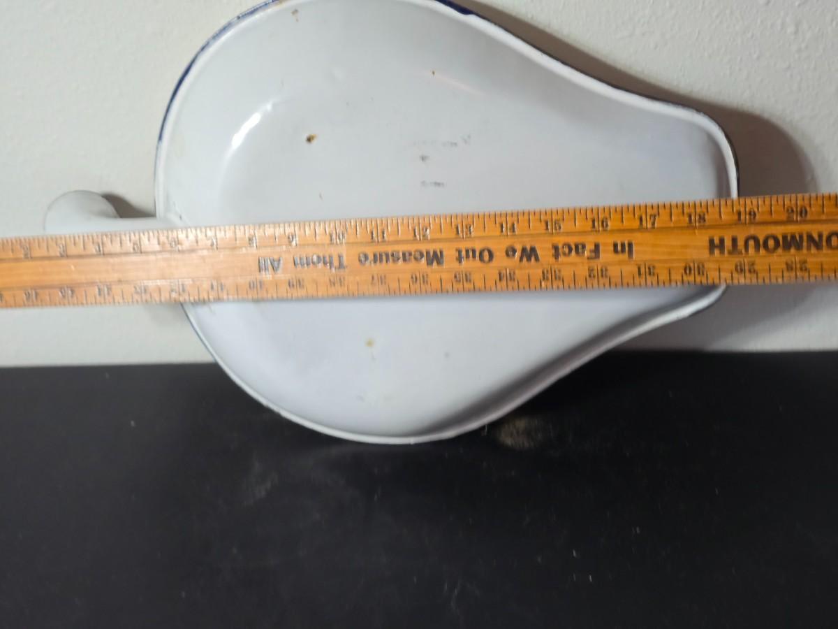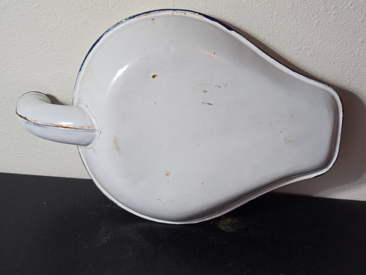 Vintage White Enamelware w/Blue Trim Bedpan / Urinal Combination Chamber pot with Lid, Antique Primitive Medical Device