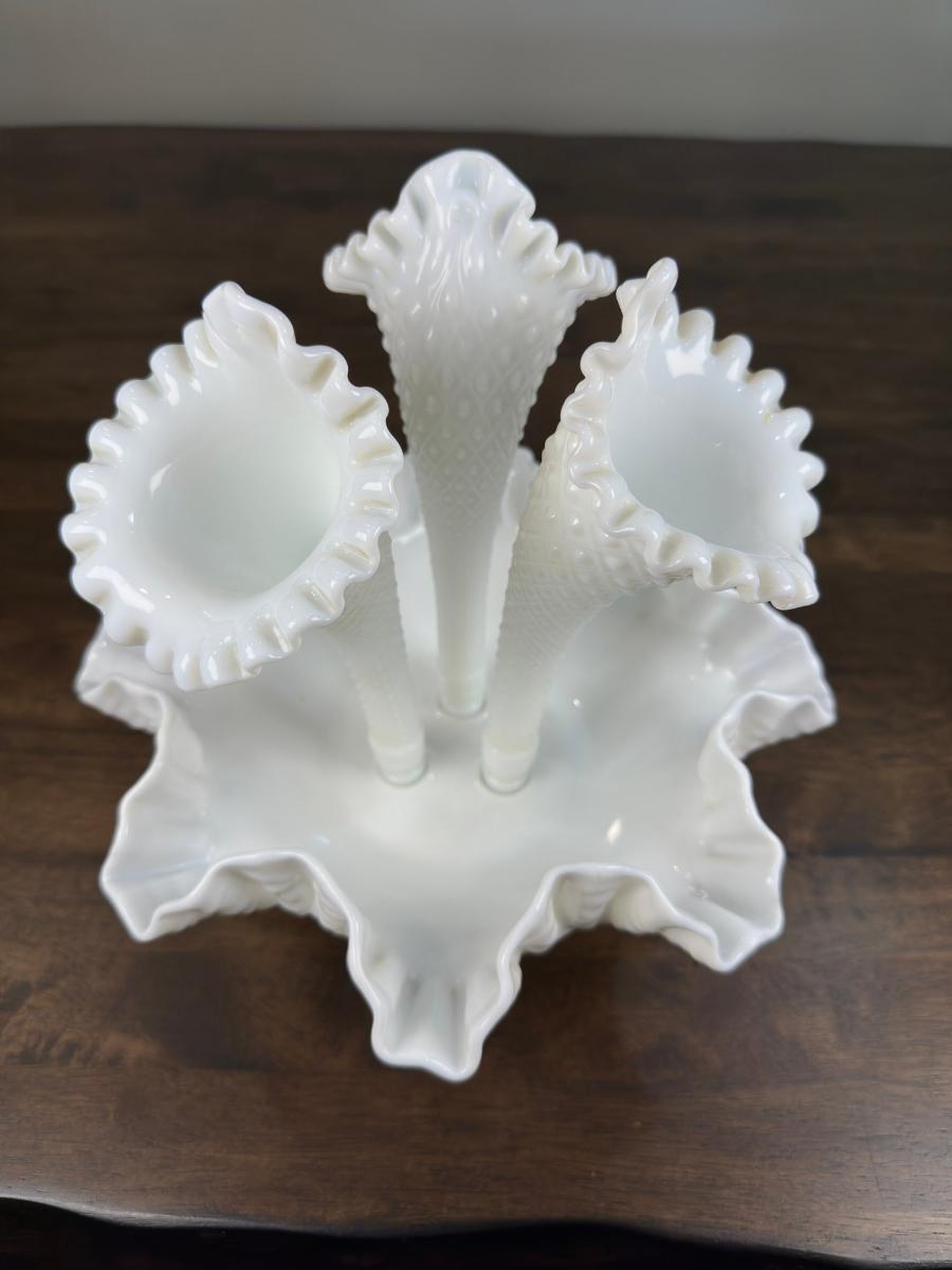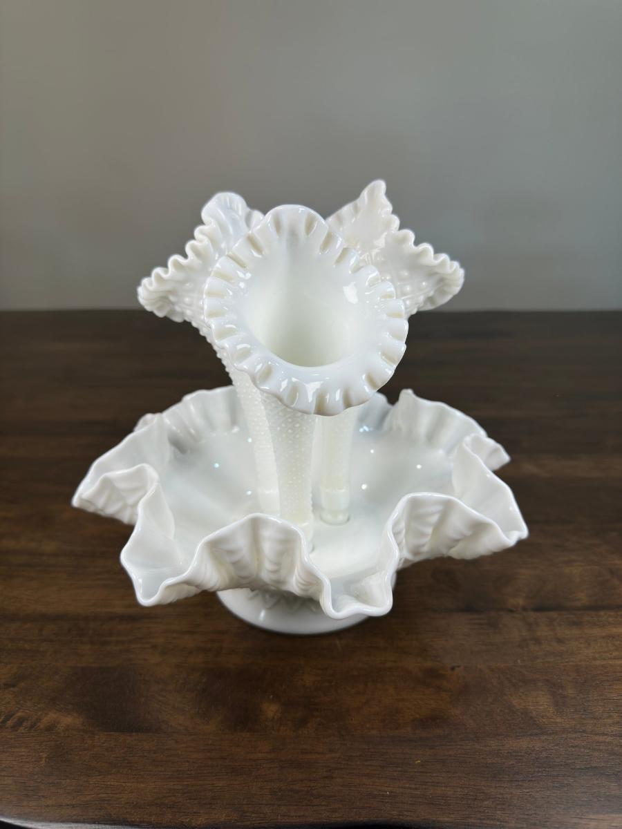 1. Vintage White Fenton Hobnail Milk Glass Epergne Vase Ruffled Bowl