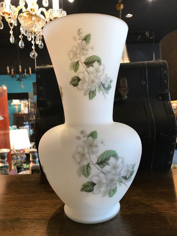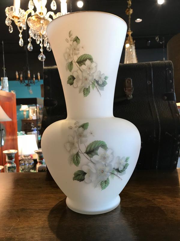 Lot 103-Vintage White Frosted Glass Vase with White Wild Rose Pattern