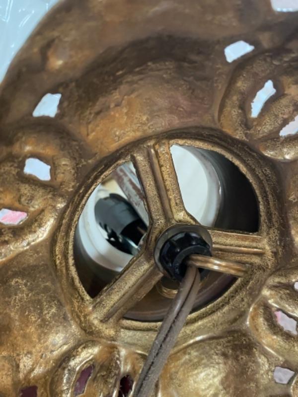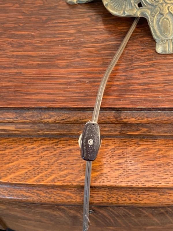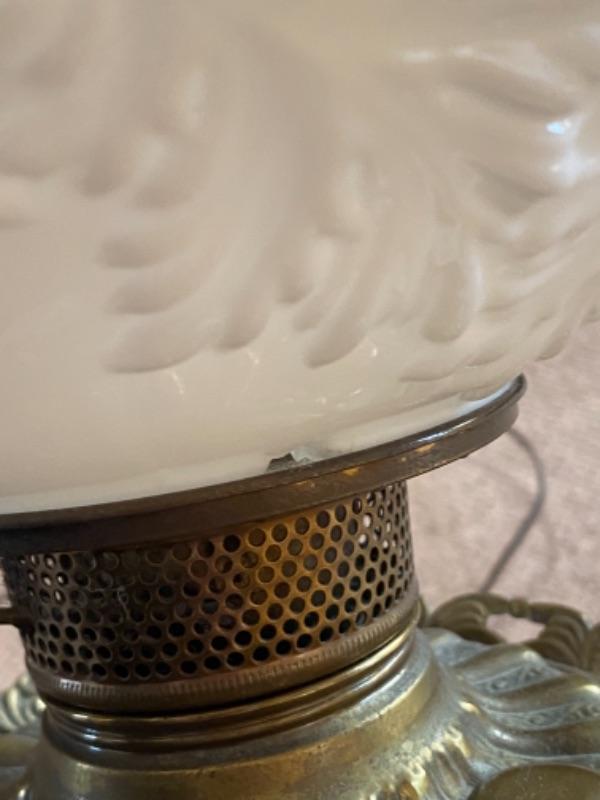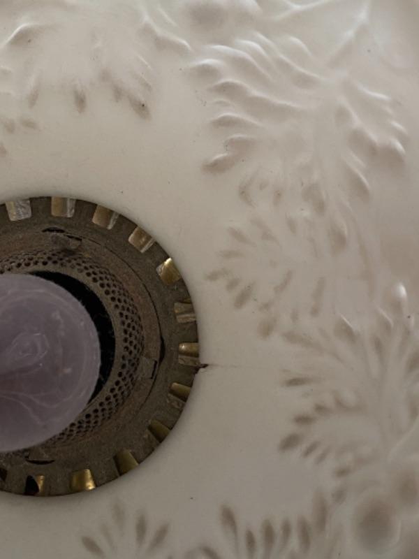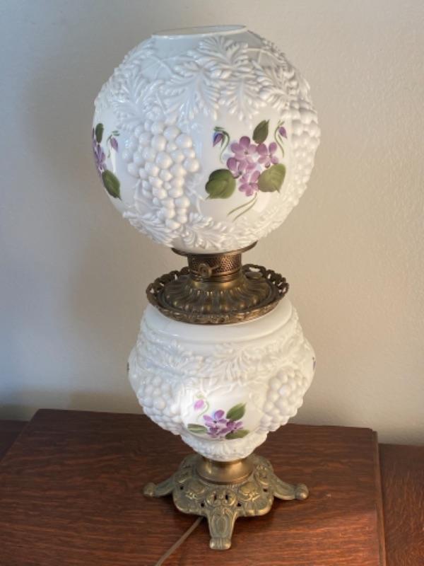 Vintage white globe Victorian table lamp. Grape embossed design with painted purple flowers. On/off switch on the cord. It should have three light settings but the base light must be burnt out. Top light does work. Did find a small crack in the bottom of one of the globes, not very noticeable.