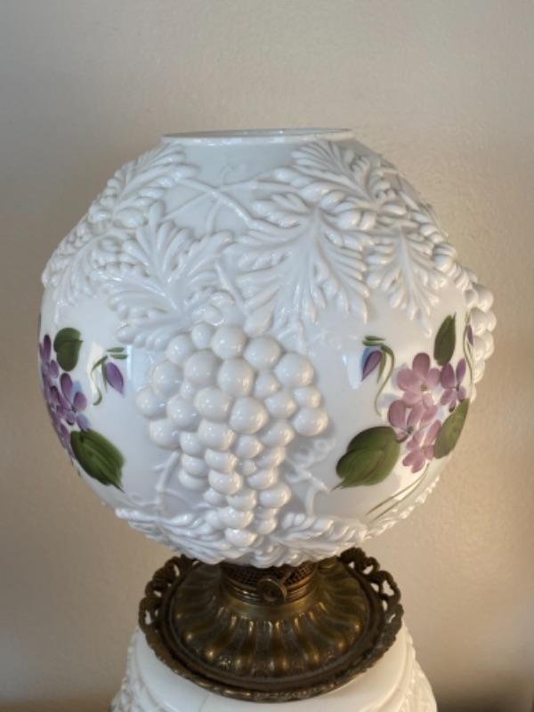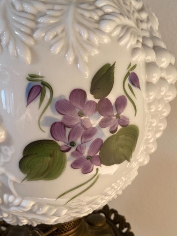 Vintage White Globe Victorian Table Lamp Embossed Grapes & Purple Flowers