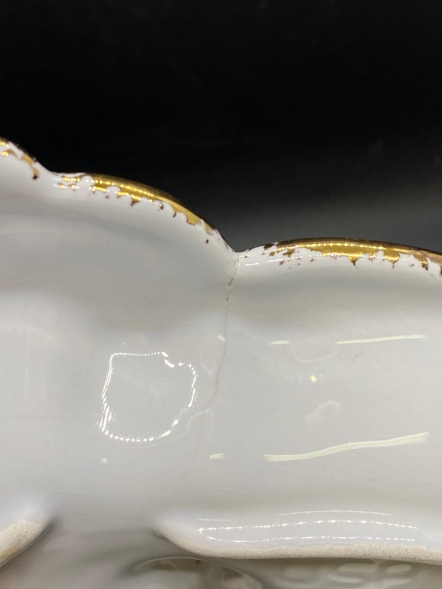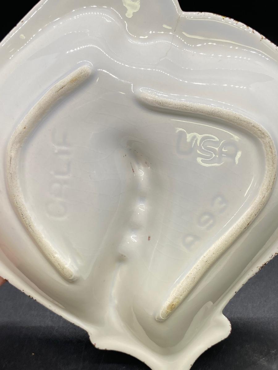 Vintage California Pottery ashtray. White with gold edging. In fair condition, it does have a crack but displays nicely, great for a trinket dish. Marked on the bottom.