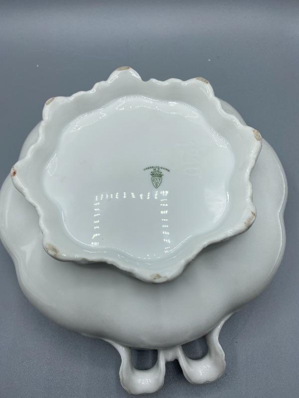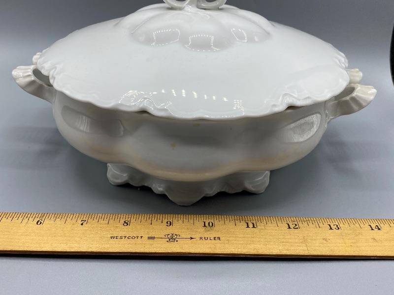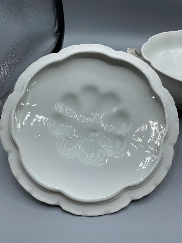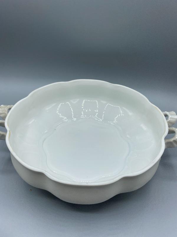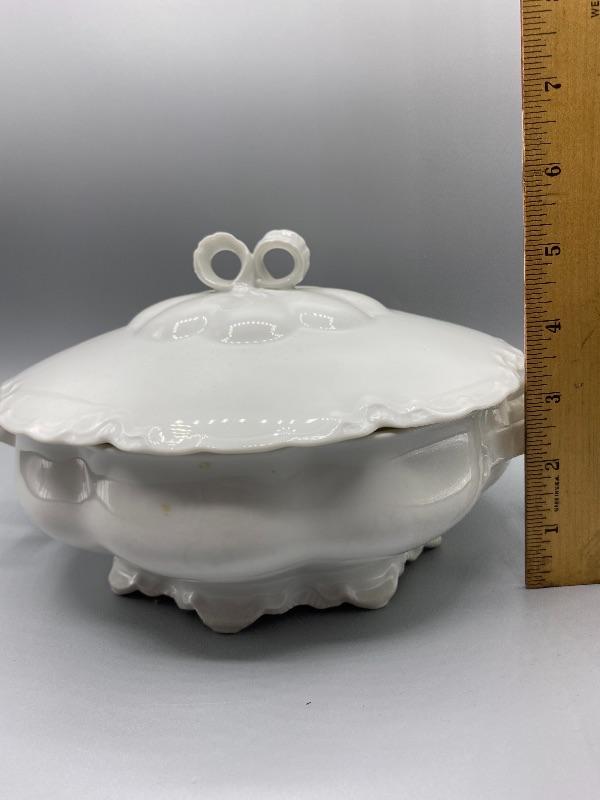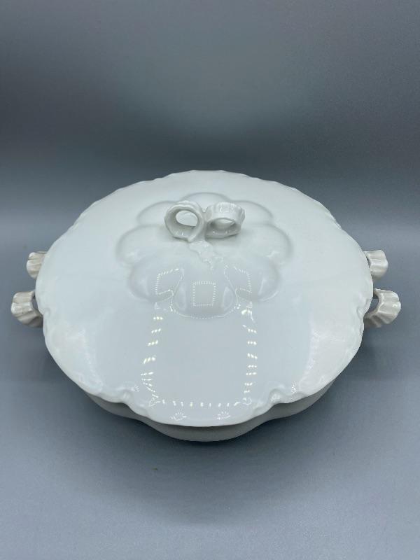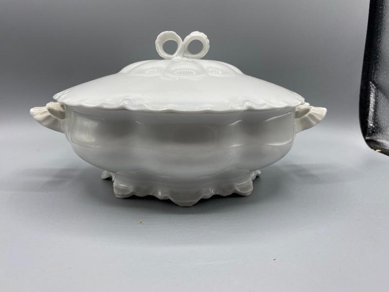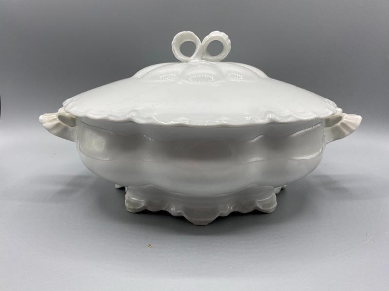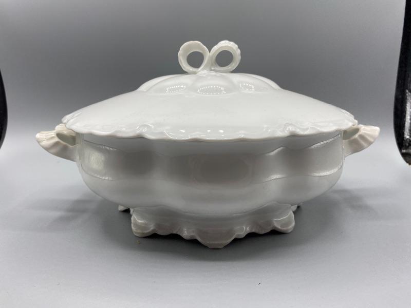 Vintage Habsburg China casserole dish. Lidded with handles. Bright white color. There is a chip out of the bottom edge. Can display nicely from one side, chip would be unseen. About 9" size.