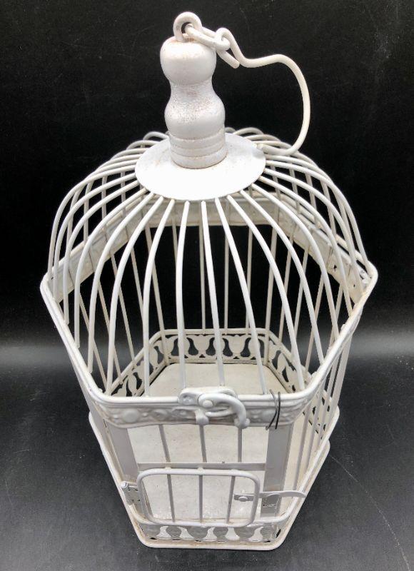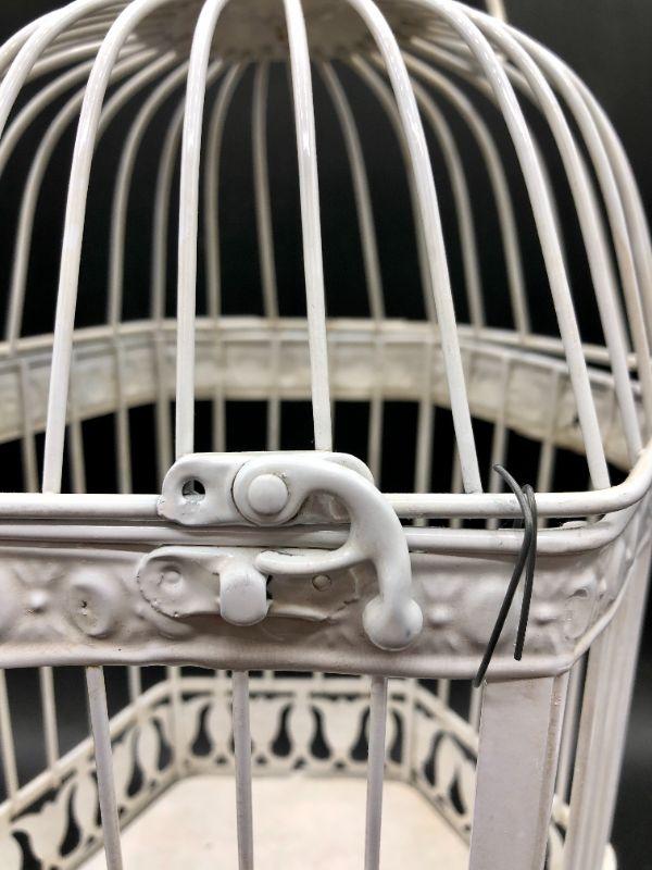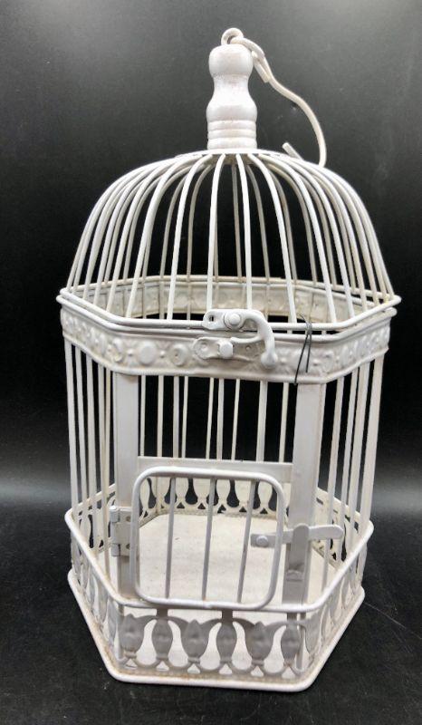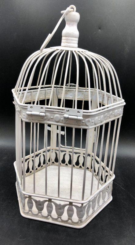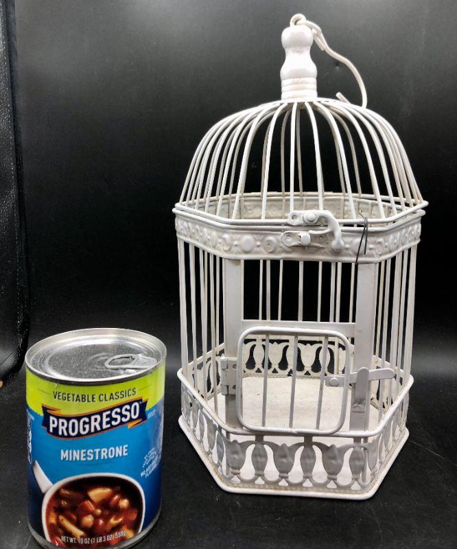 Small vintage white metal birdcage. Great for display. The latch doesn't line up, so owner used the attached piece of wire to secure the door. About 15" size. There is a hook on the top for hanging. Soup can not included, just there for size comparison.