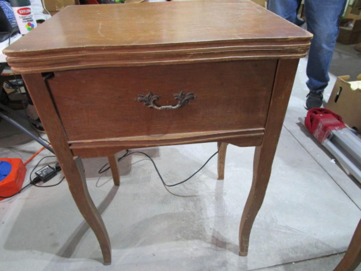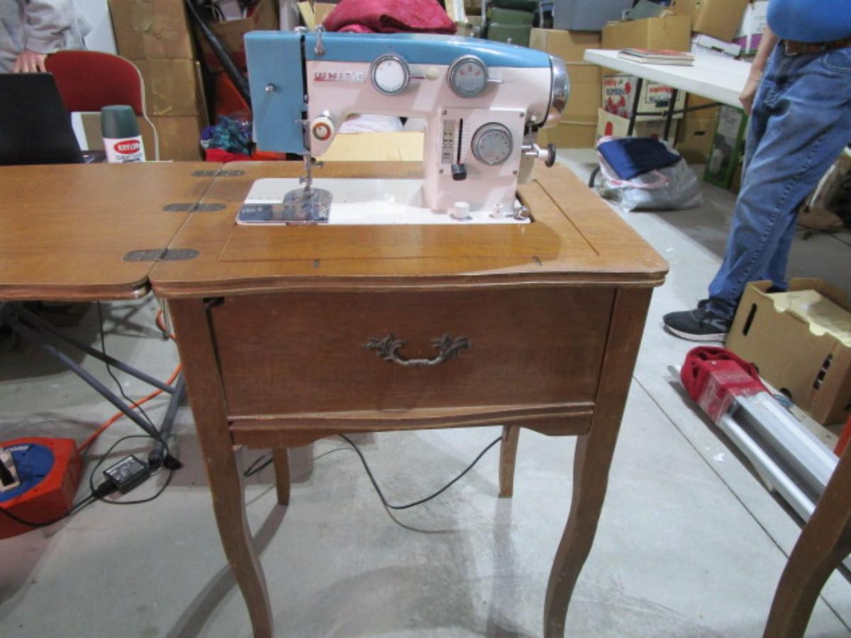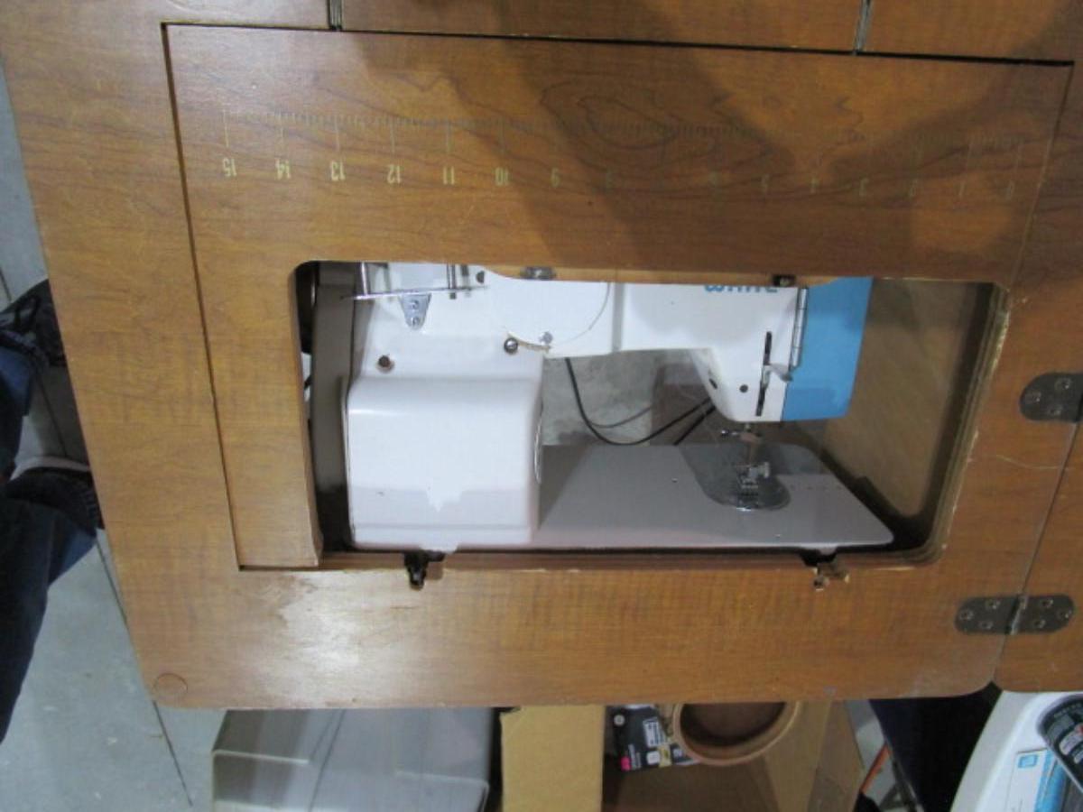 Vintage White metal sewing machine in cabinet