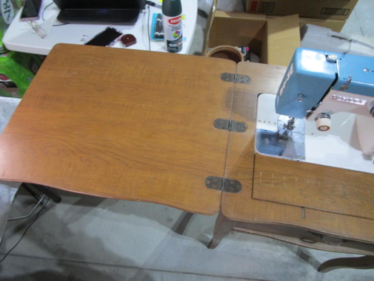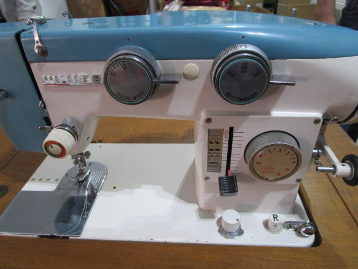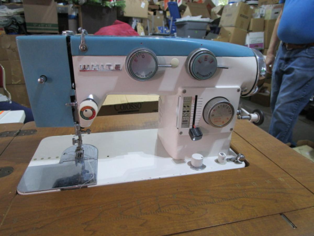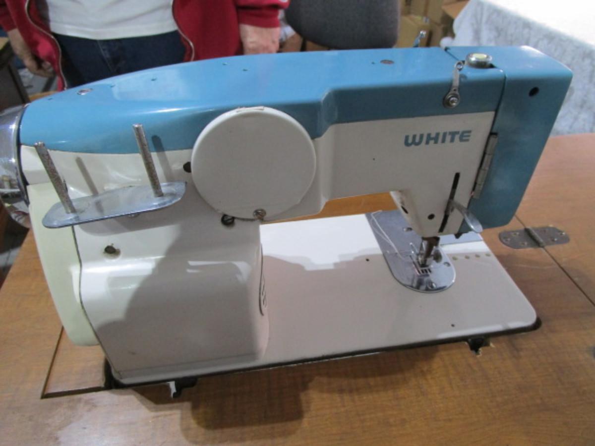 Vintage White metal sewing machine in cabinet