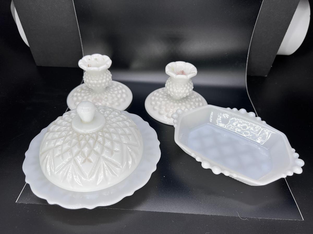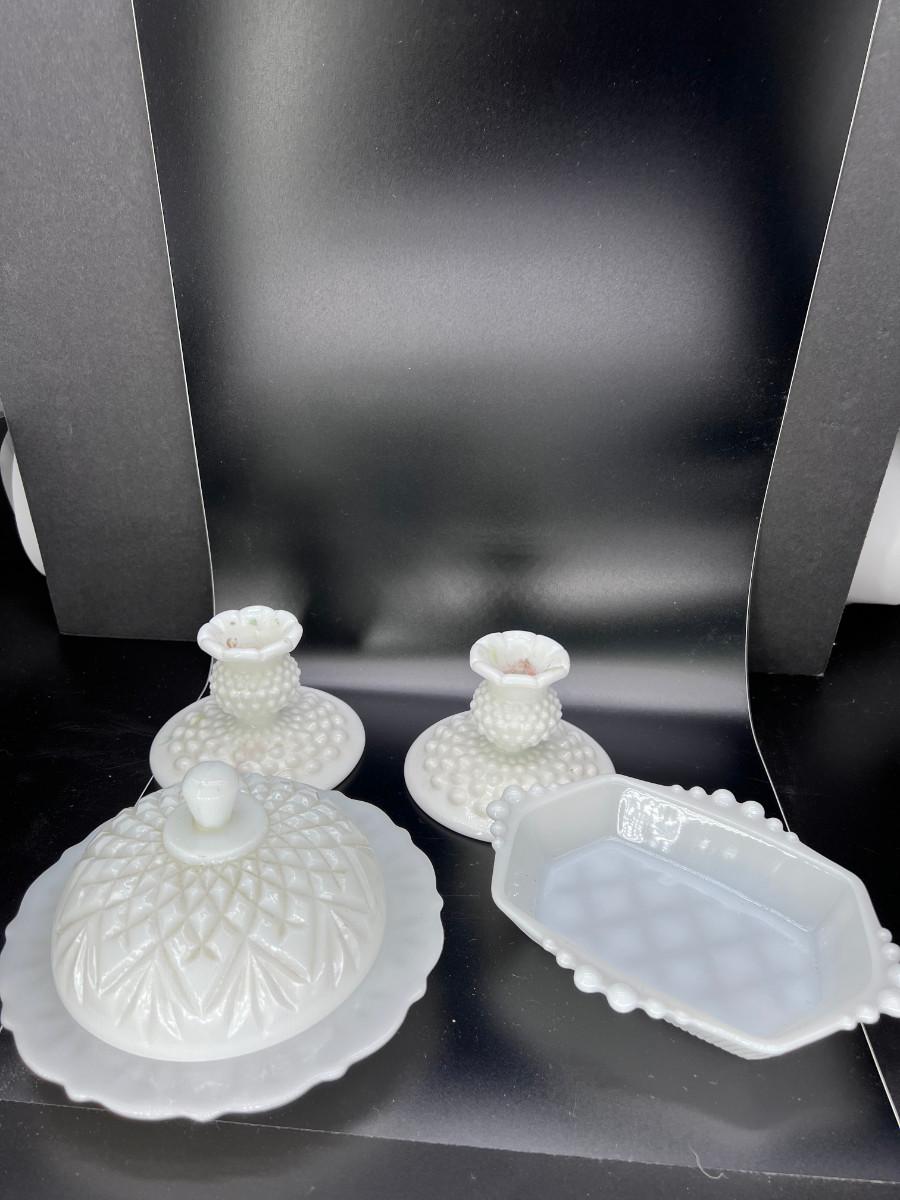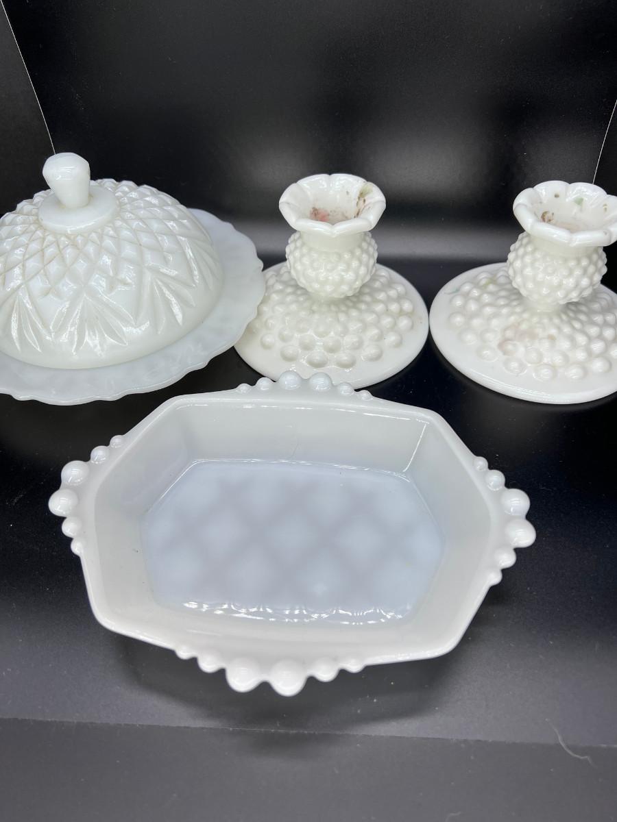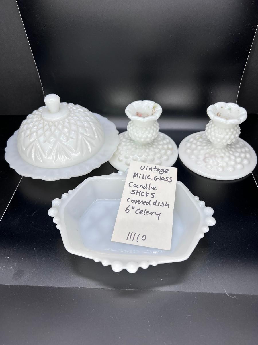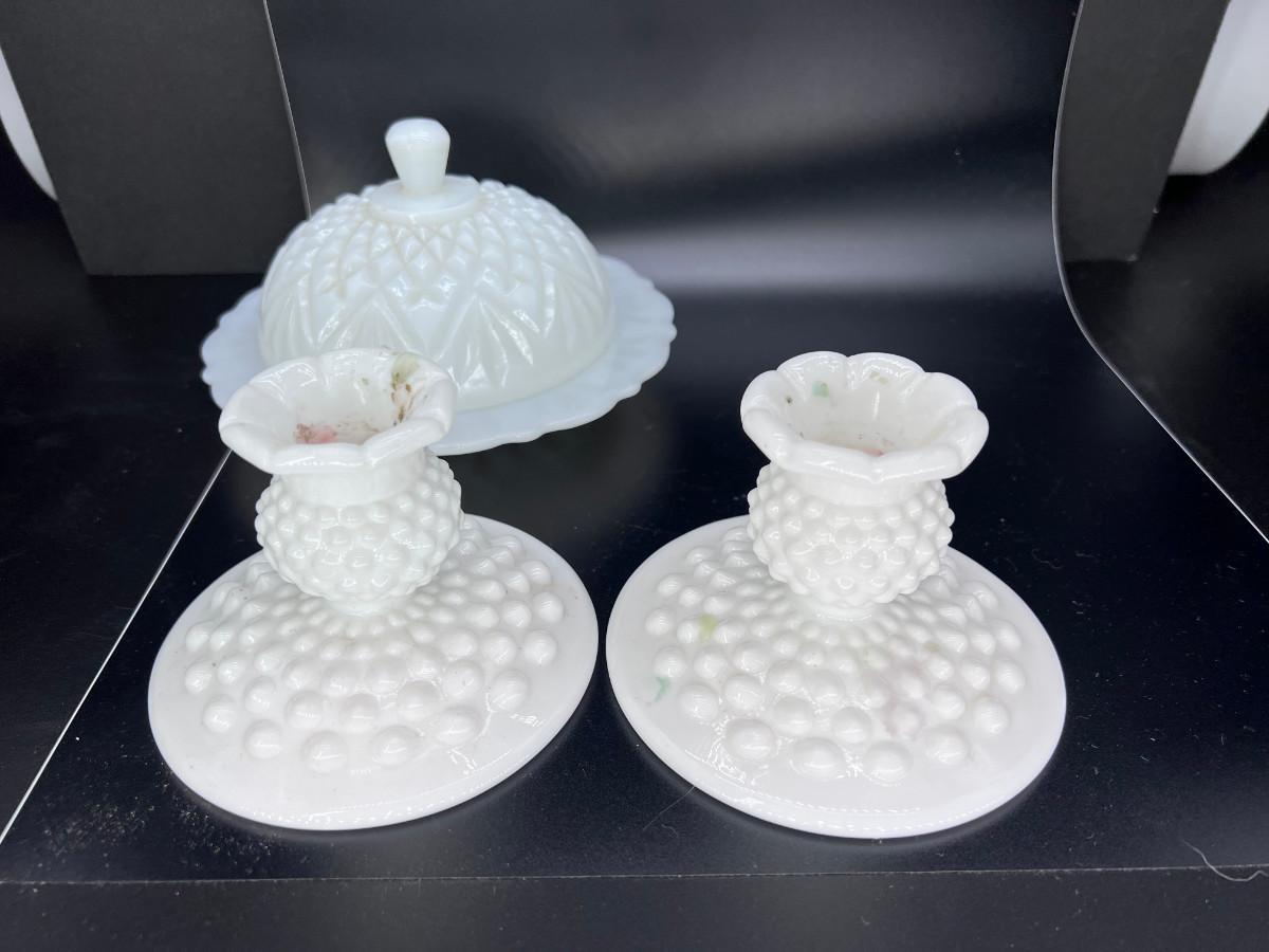 Vintage White Milk glass 2 Hobnail candle holders covered round plate celery plate