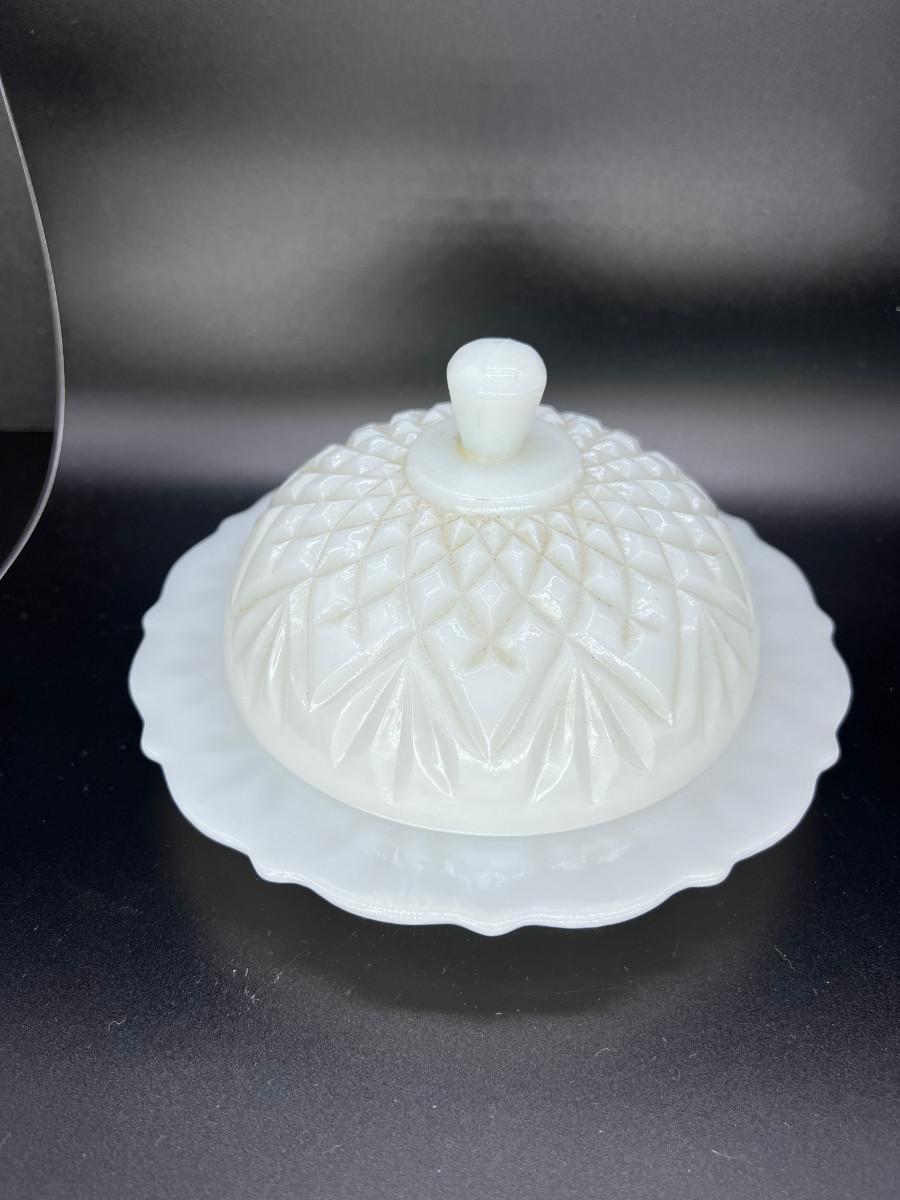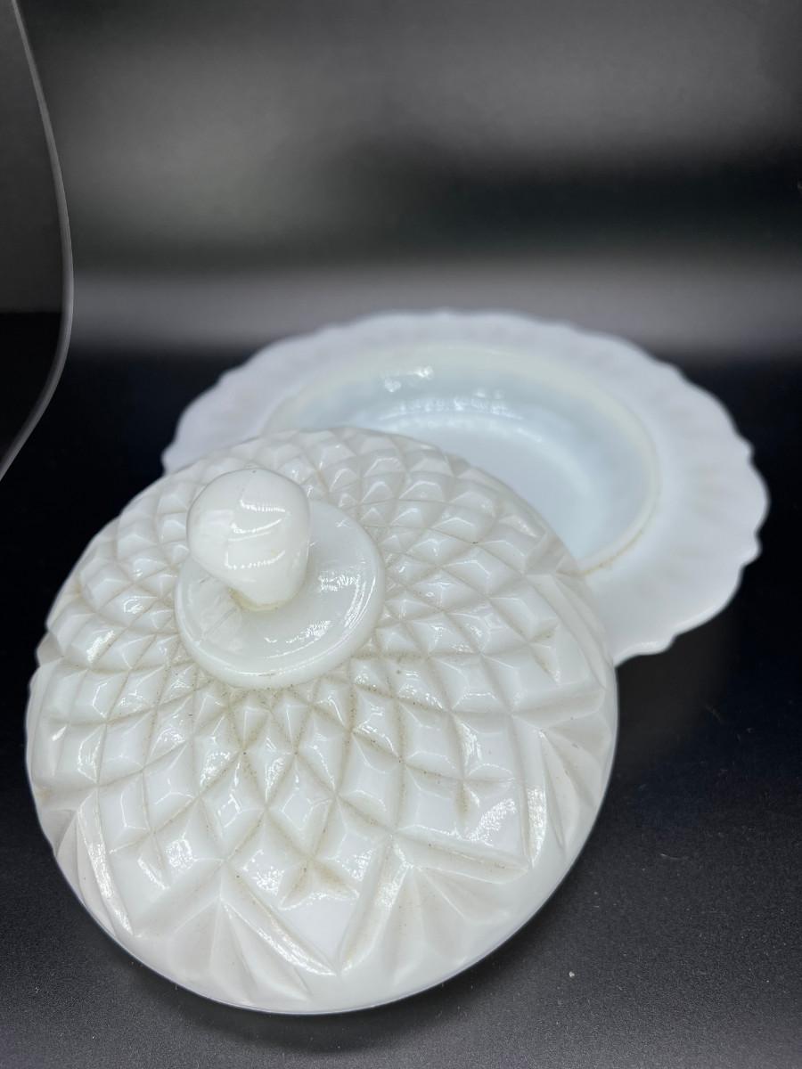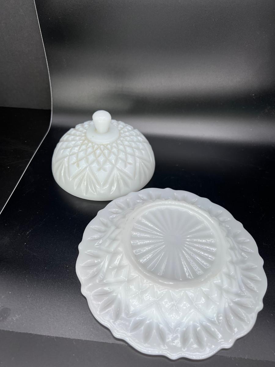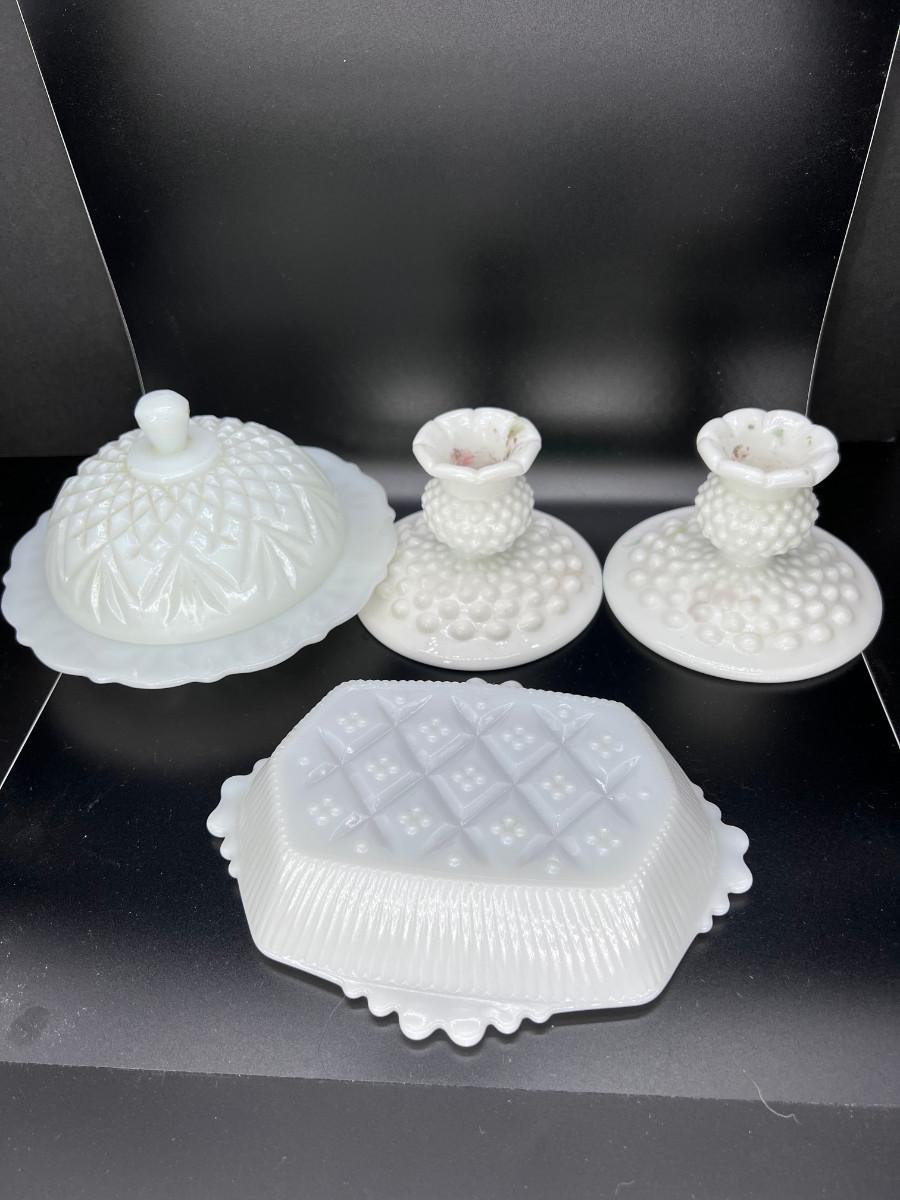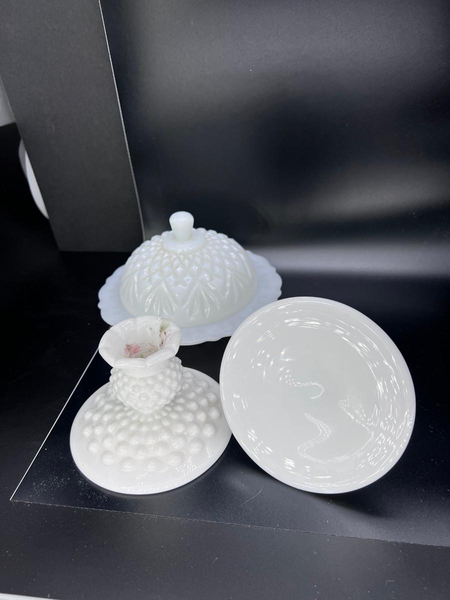 Vintage White Milk glass 2 Hobnail candle holders covered round plate celery plate