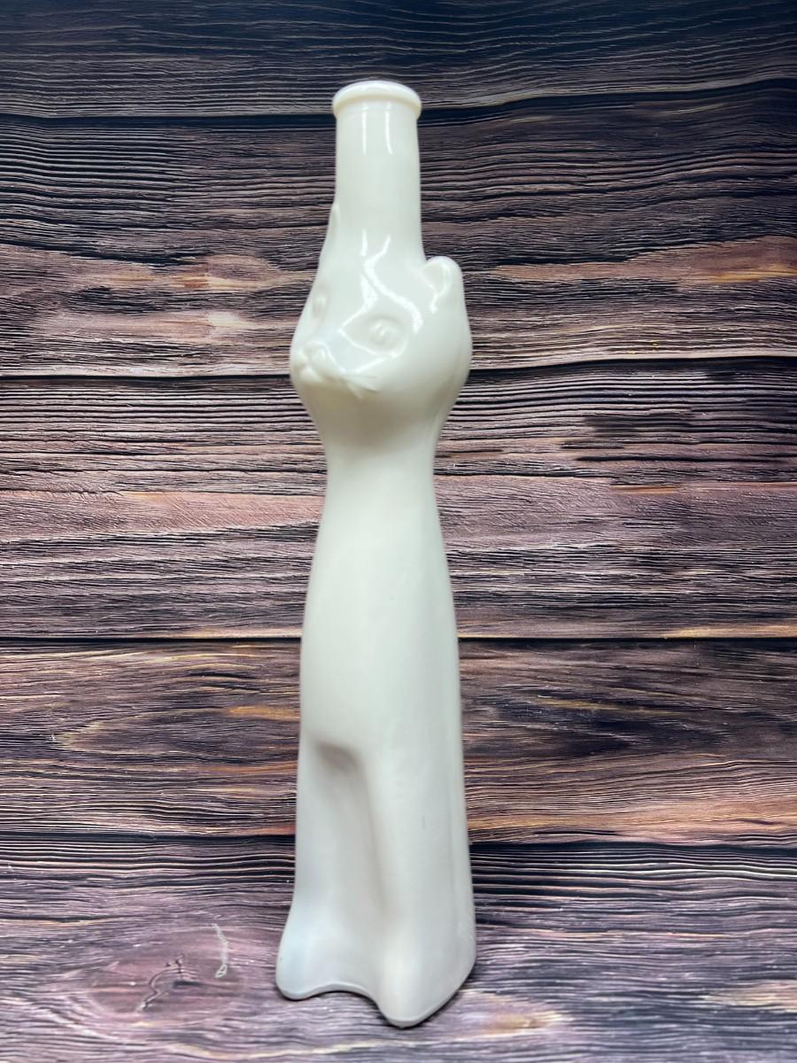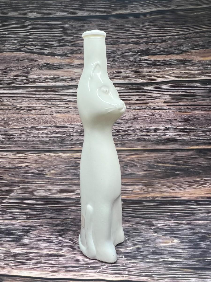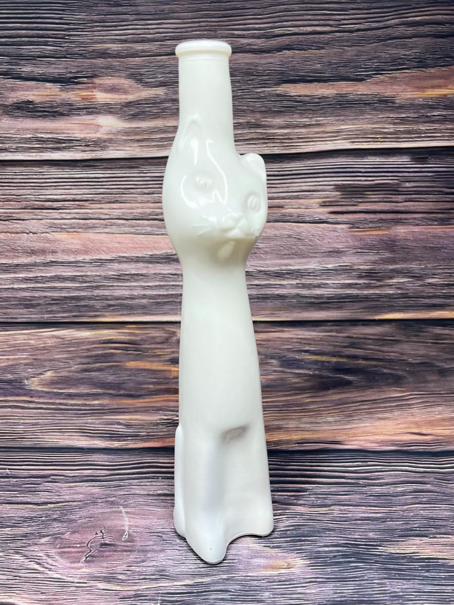 Cool vintage white glass cat shaped bottle. Was a Moselland Riesling Sherry bottle. Does not have a cap or cork. Displays great, good condition. About 12" size.