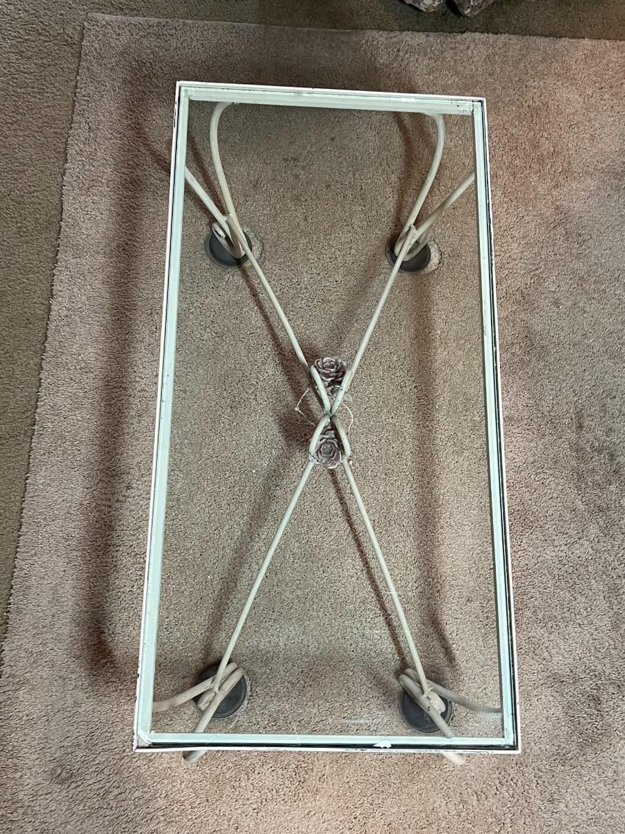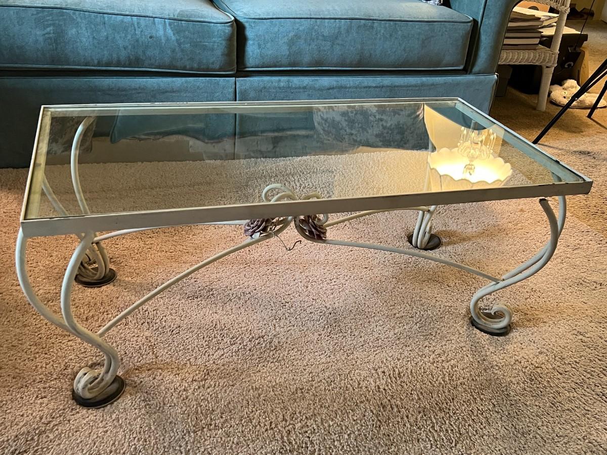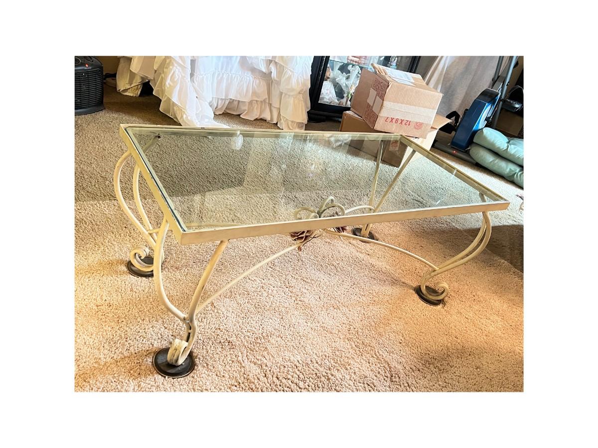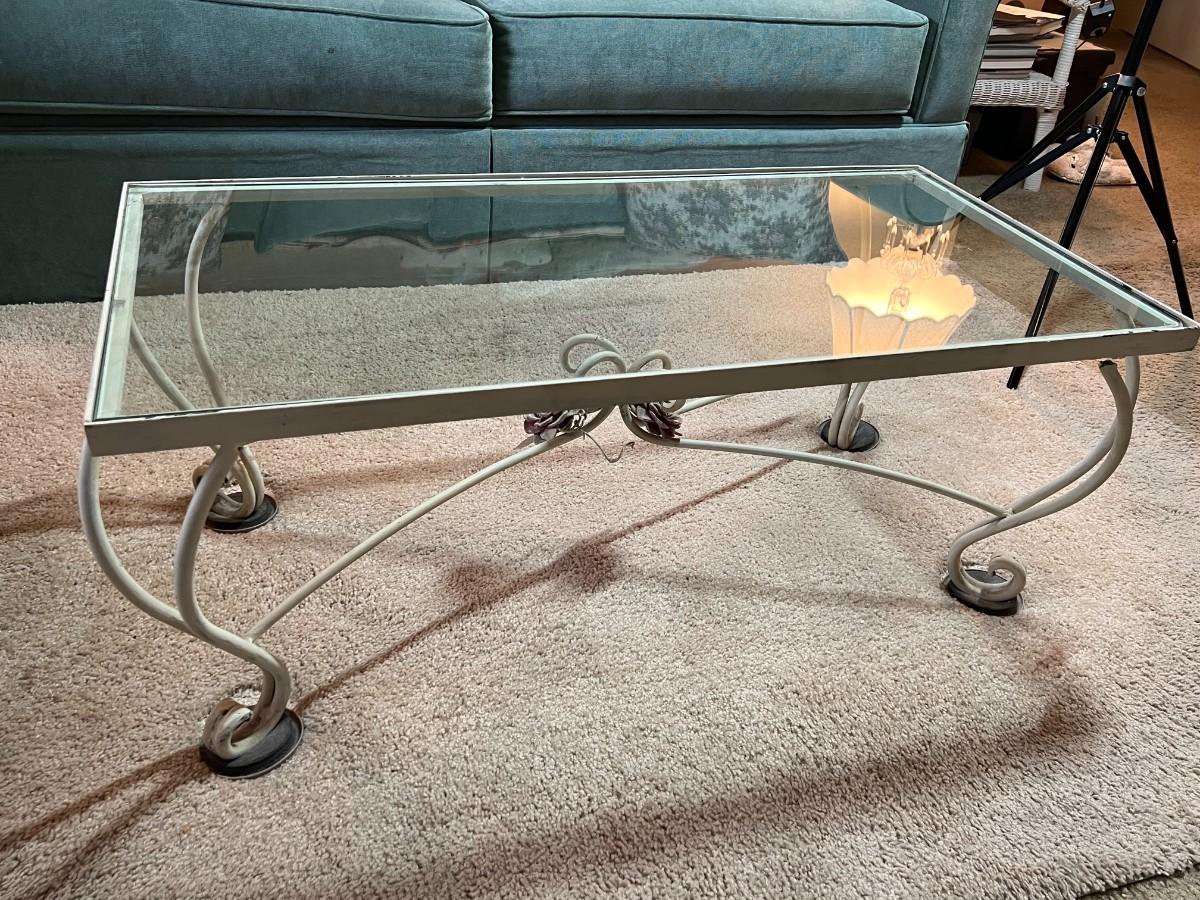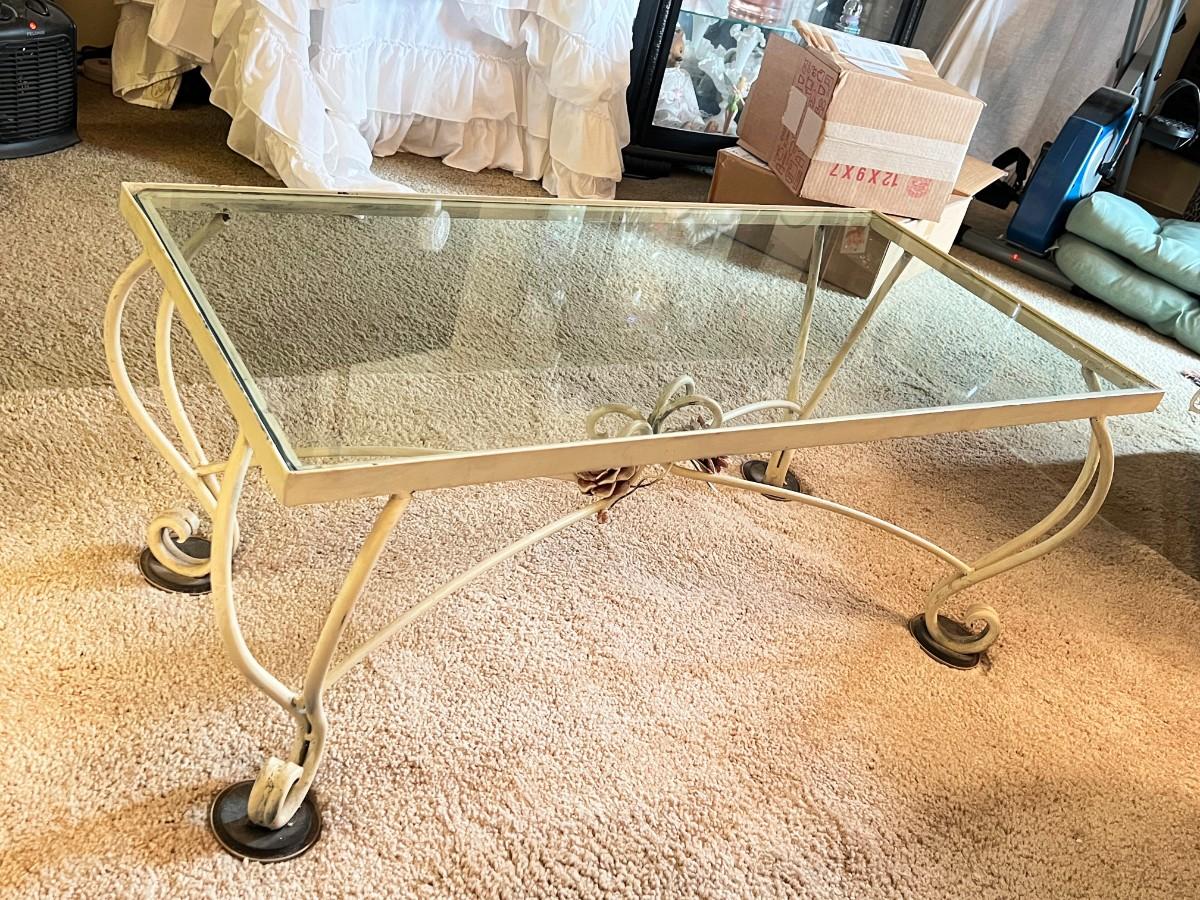 Vintage White Painted Metal Coffee Table with Glass Top. Good vintage condition, has been used inside many years in the living room. About 3' length. **Off site in Brea, owner downsizing. Pick up will be after July 14th, we will schedule with winning bidders after that date.**