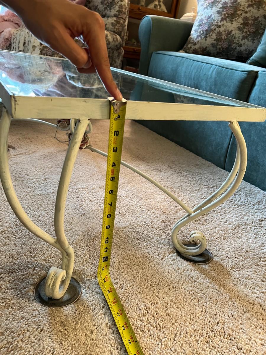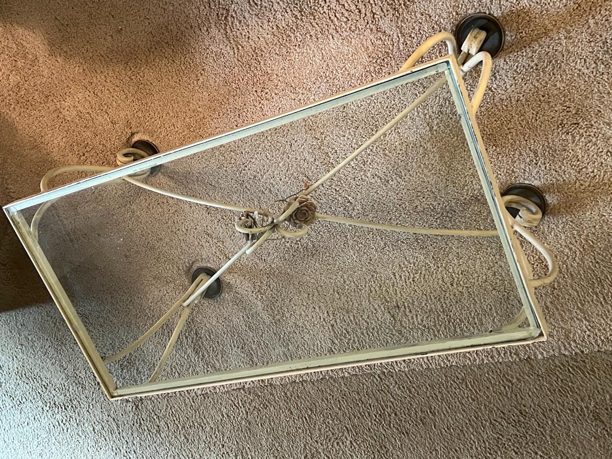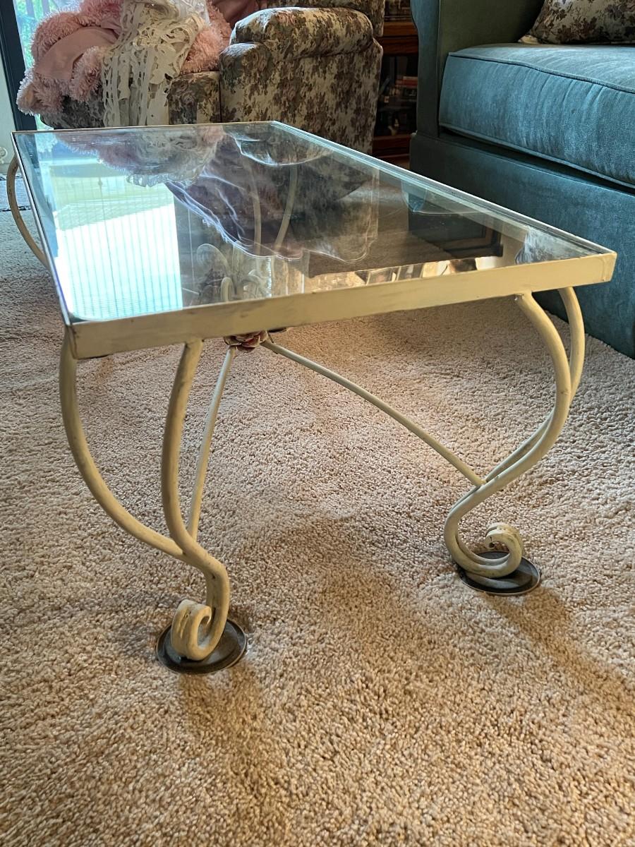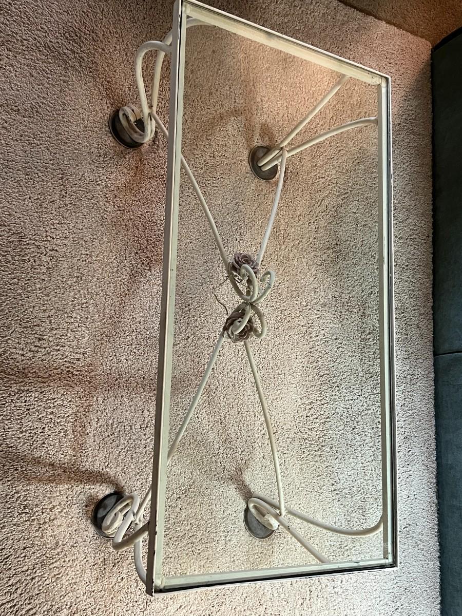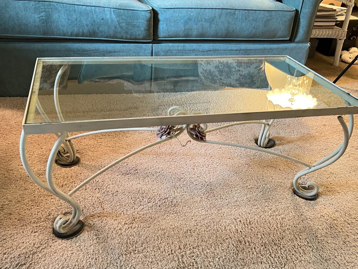 Vintage White Painted Metal Coffee Table with Glass Top. Good vintage condition, has been used inside many years in the living room. About 3' length. **Off site in Brea, owner downsizing. Pick up will be after July 14th, we will schedule with winning bidders after that date.**