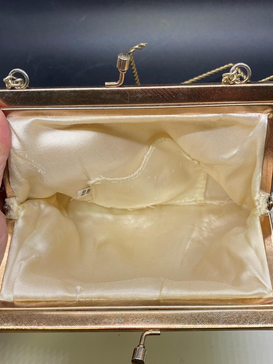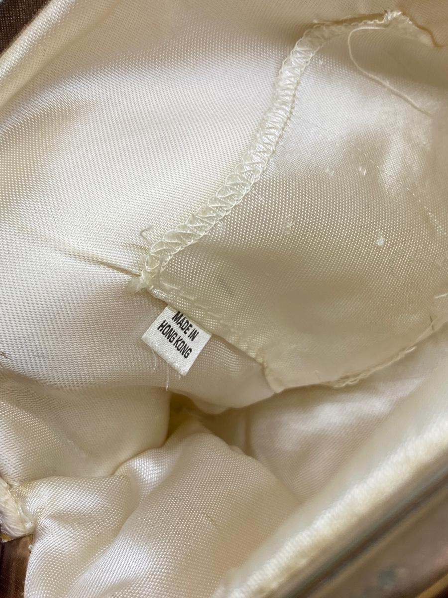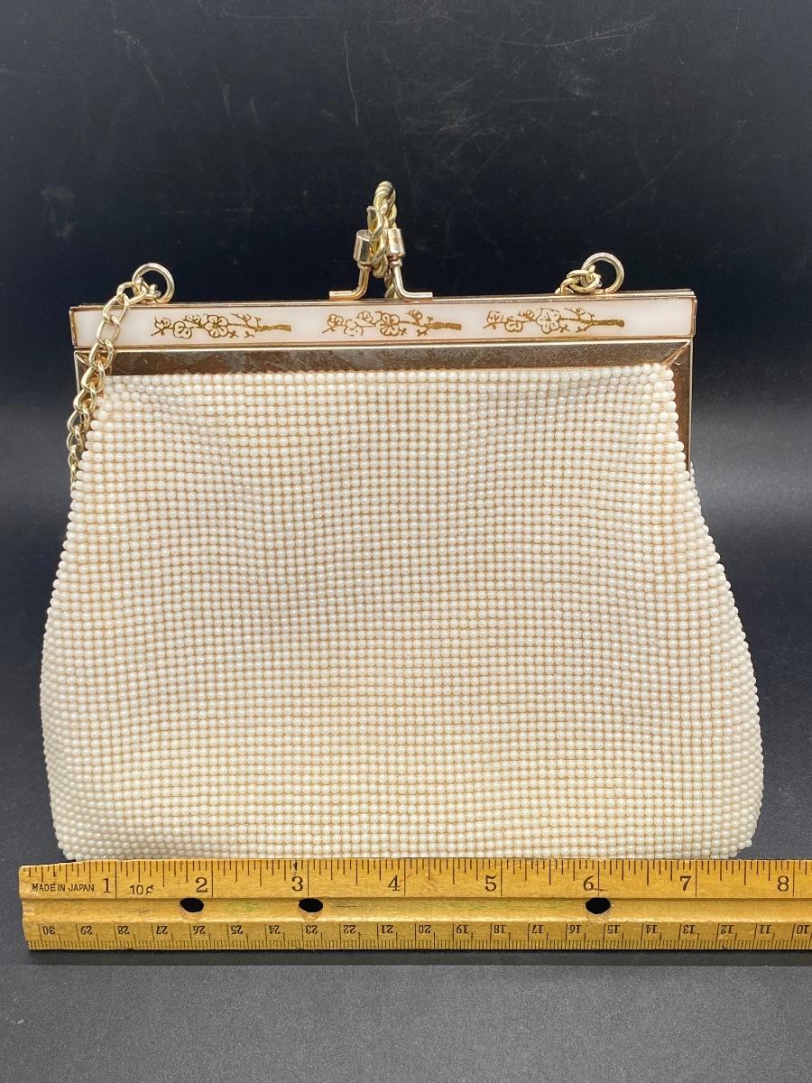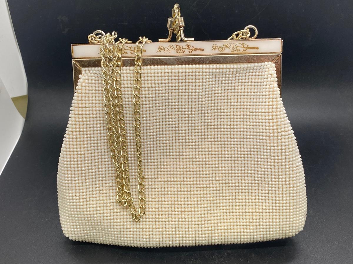 Cute vintage white plastic micro dot beaded purse. Plastic chain strap. Made in Hong Kong. In good vintage condition.
