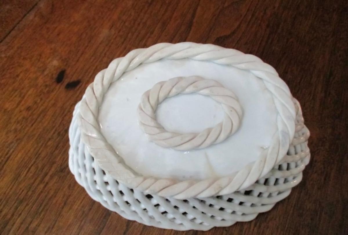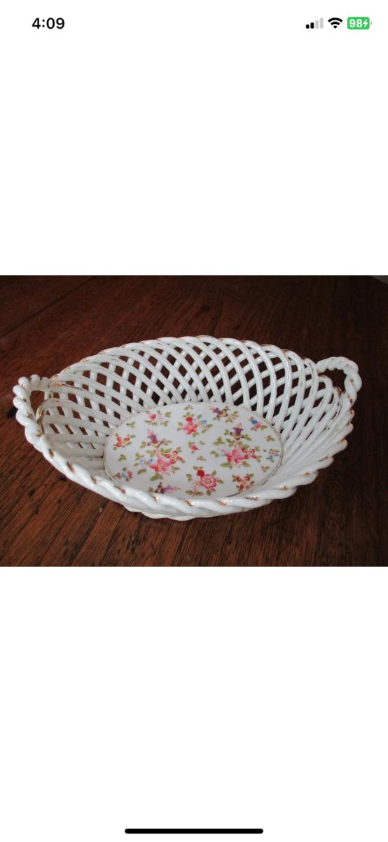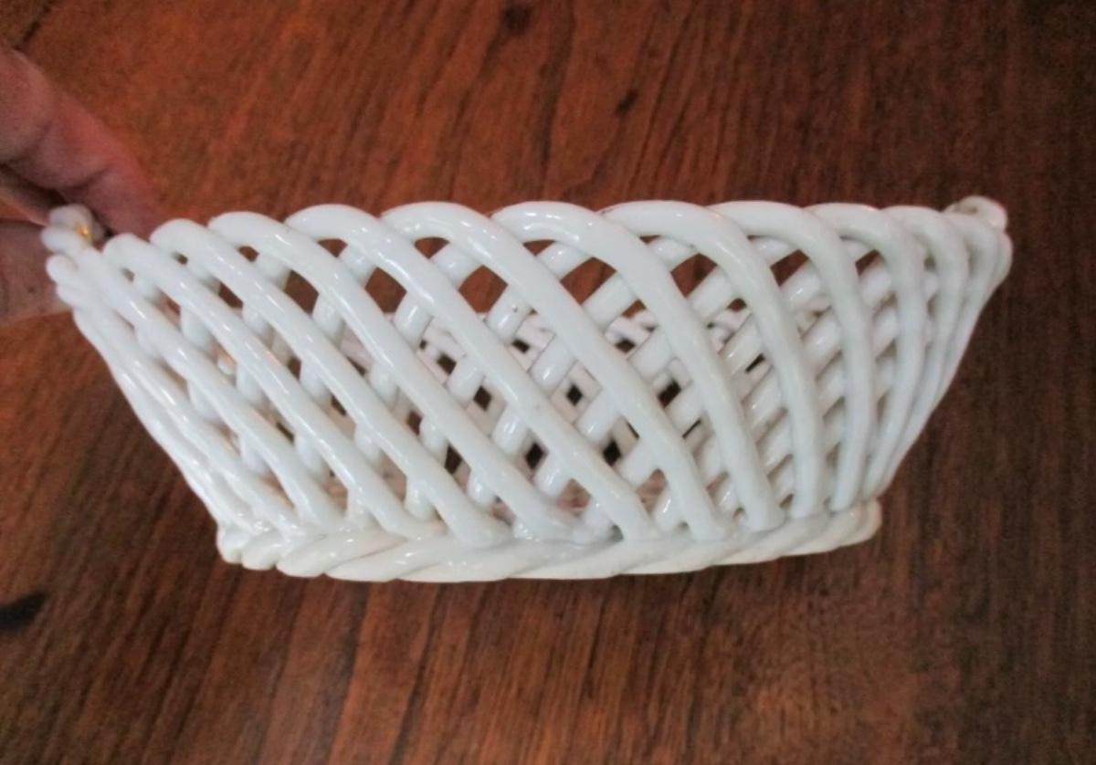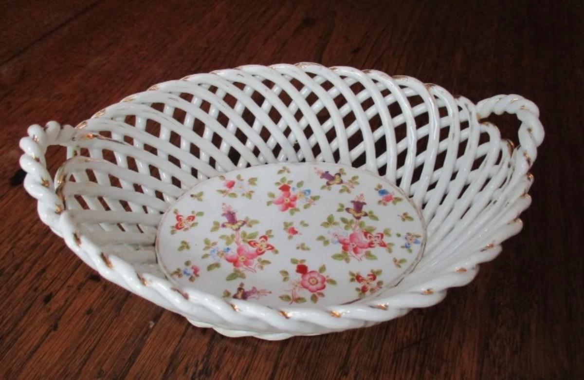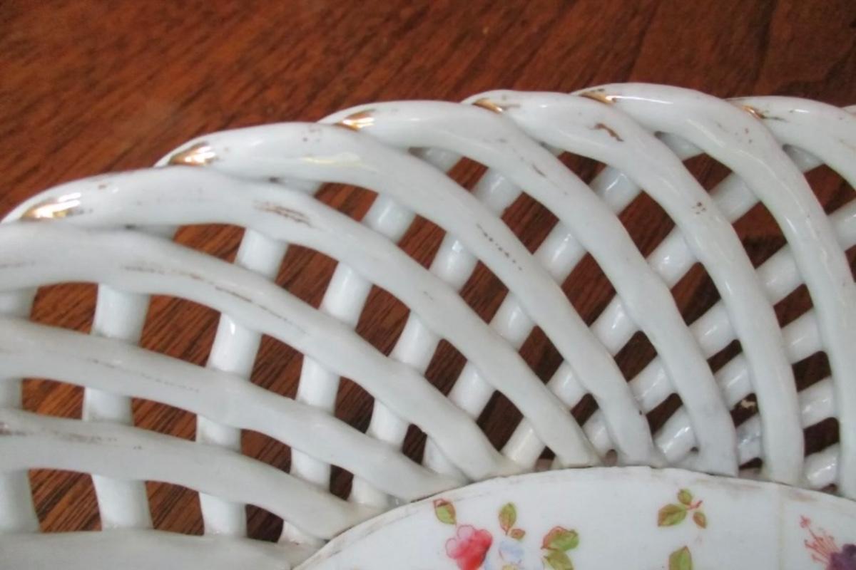 Vintage gold trimmed white rope lattice, porcelain bowl HP, Floral motif, Bassano, Italy
