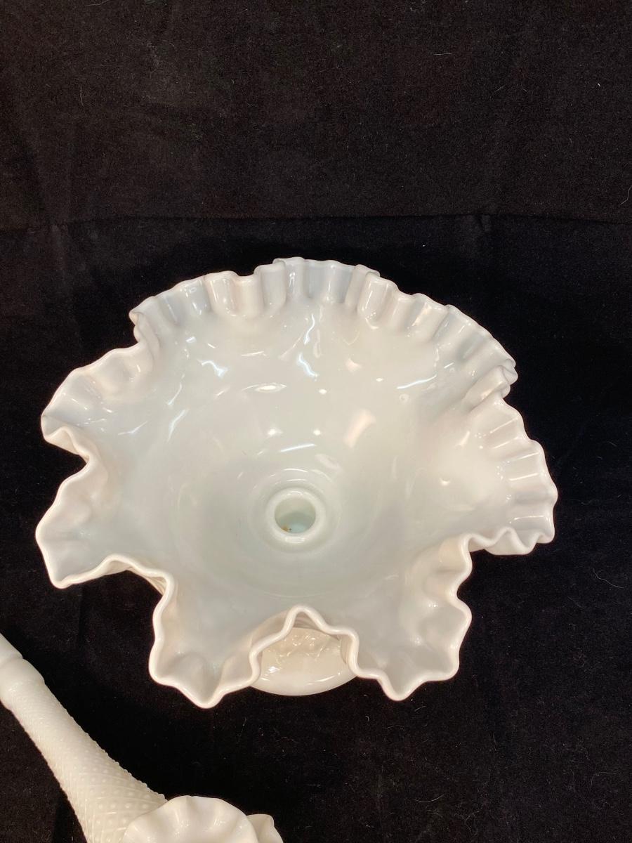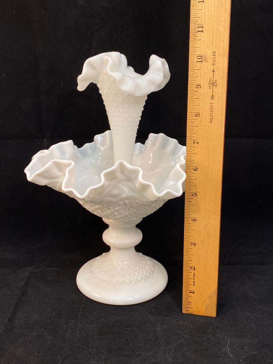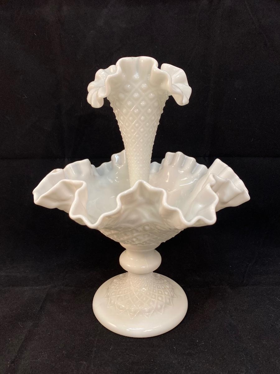 Vintage White Ruffled Milk Glass Diamond Pattern Hobnail Epergne with One Horn. In good condition, no chips. Diamond pattern with hobnail inside. Ruffled edges. Stands about 10". No identifying hallmarks but online is identified as Fenton.