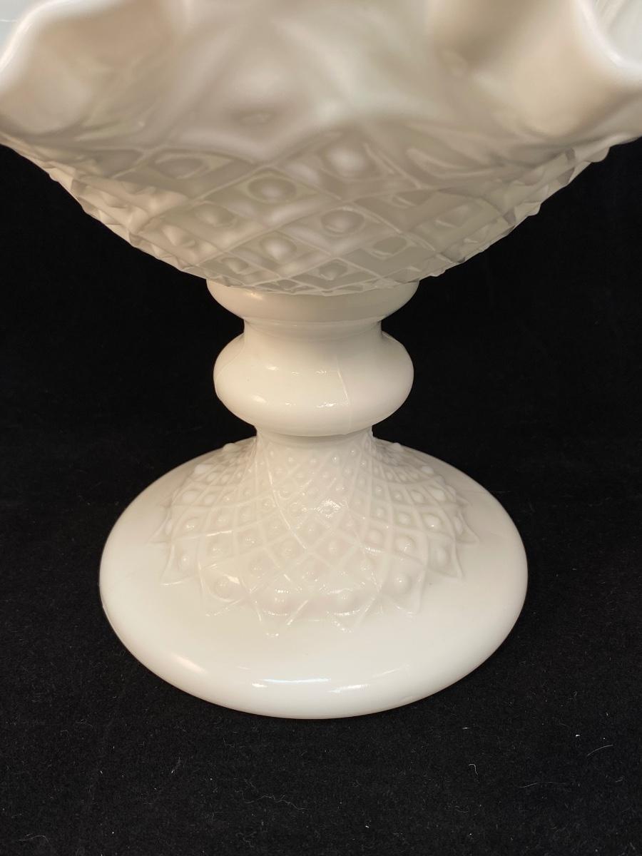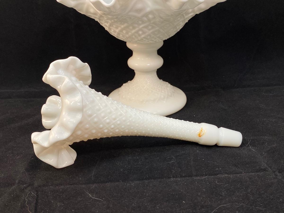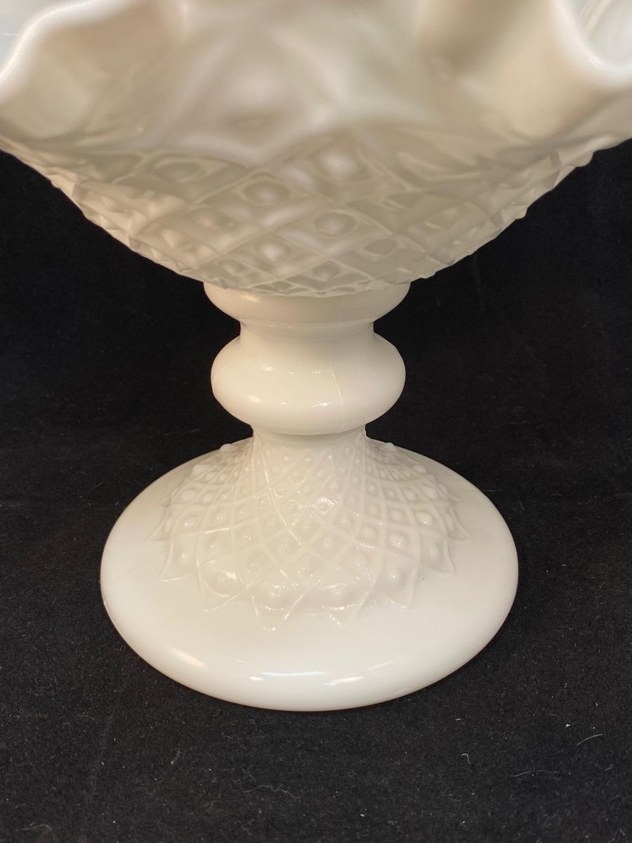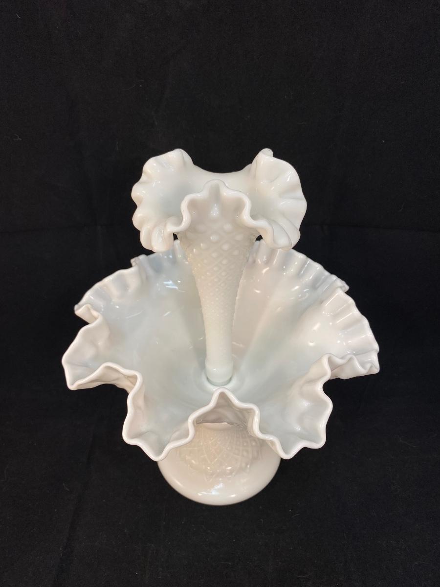 Vintage White Ruffled Milk Glass Diamond Pattern Hobnail Epergne with One Horn. In good condition, no chips. Diamond pattern with hobnail inside. Ruffled edges. Stands about 10". No identifying hallmarks but online is identified as Fenton.