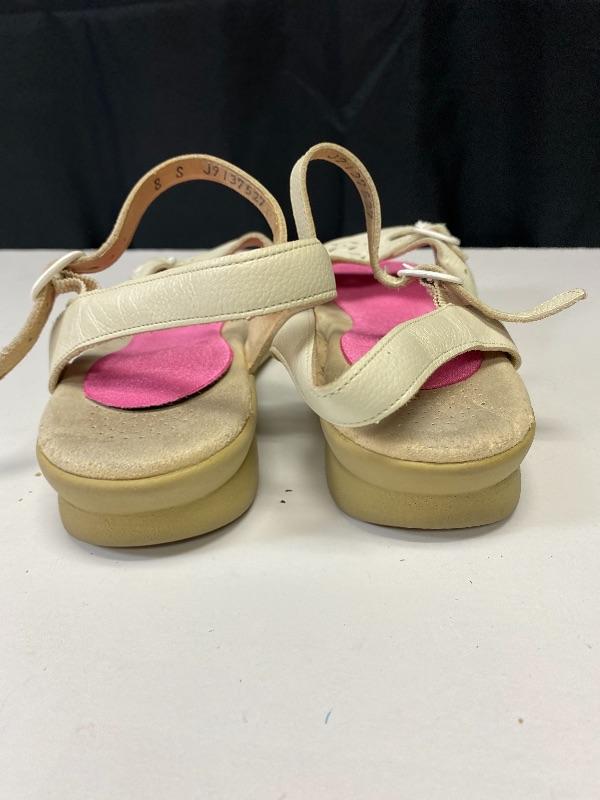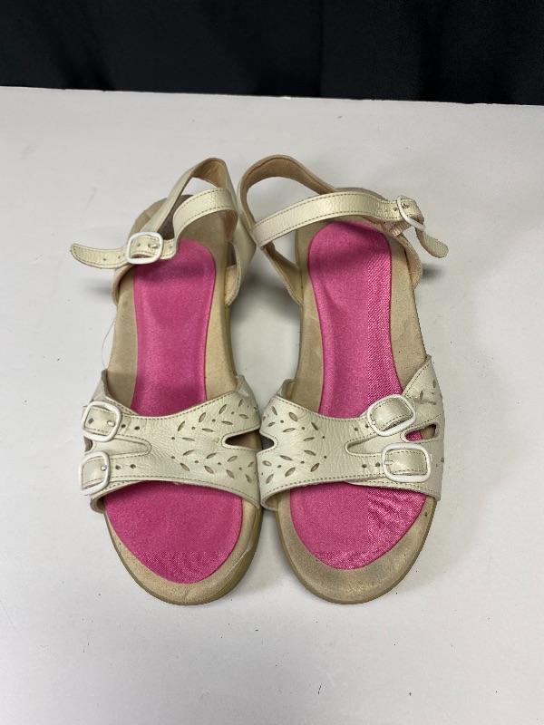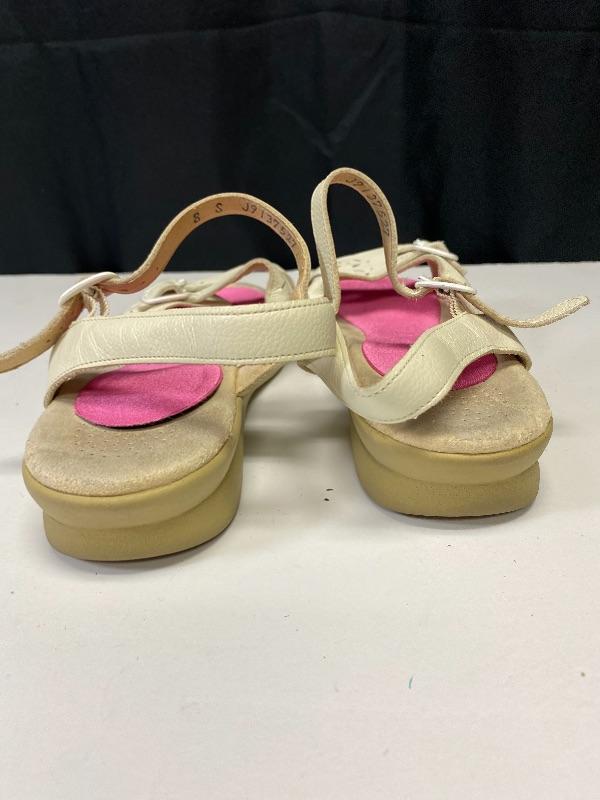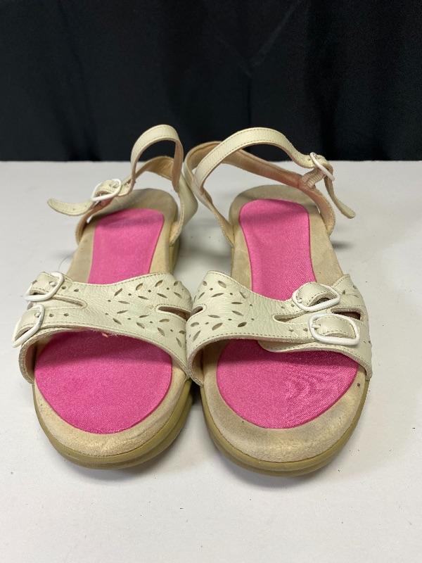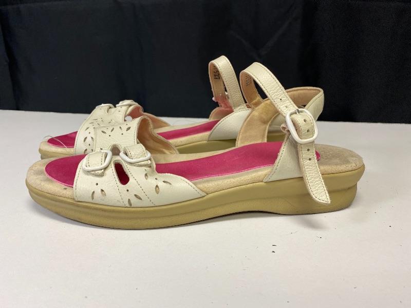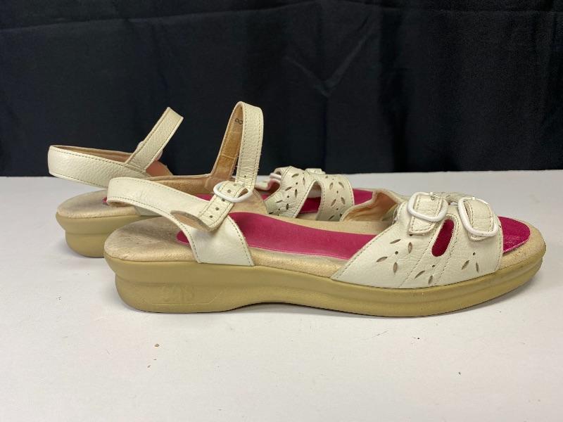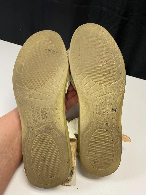 Vintage white sandals from SAS. Previously worn condition. Could not find a size mark, guessing 8.5 or 9 based on other shoes from estate.