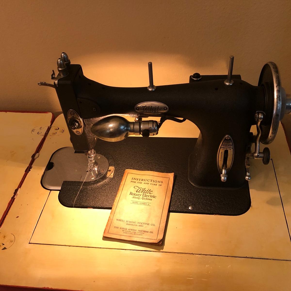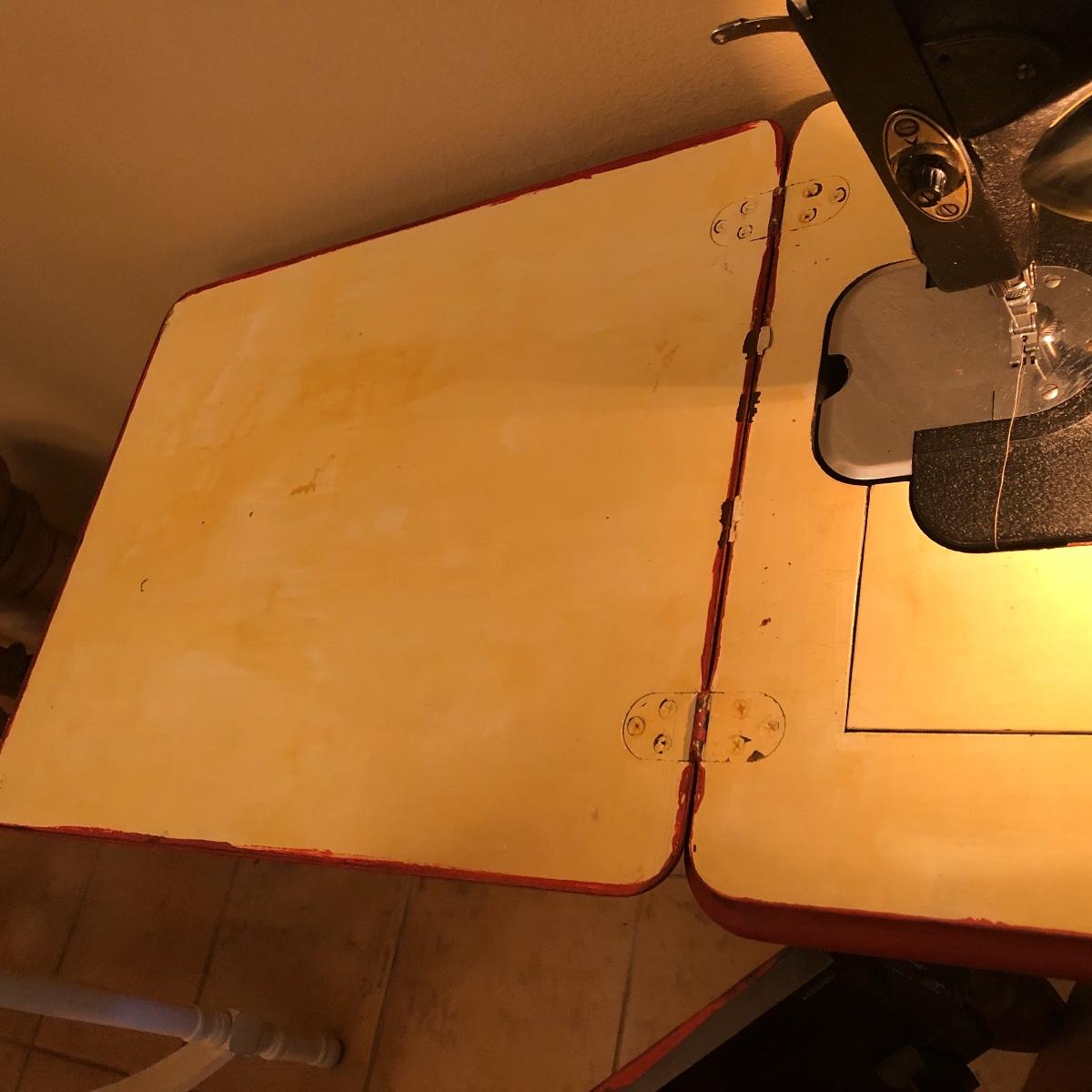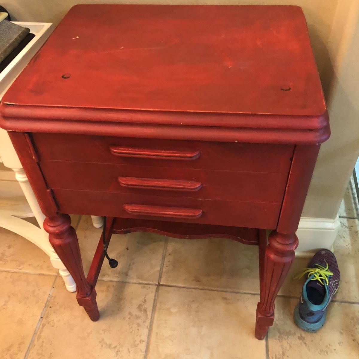This small table converts to a sewing machine table with a white sewing machine completely functional. Also has a o of sewing machine supplies. Cabinet measures 21 x 17 x 31.