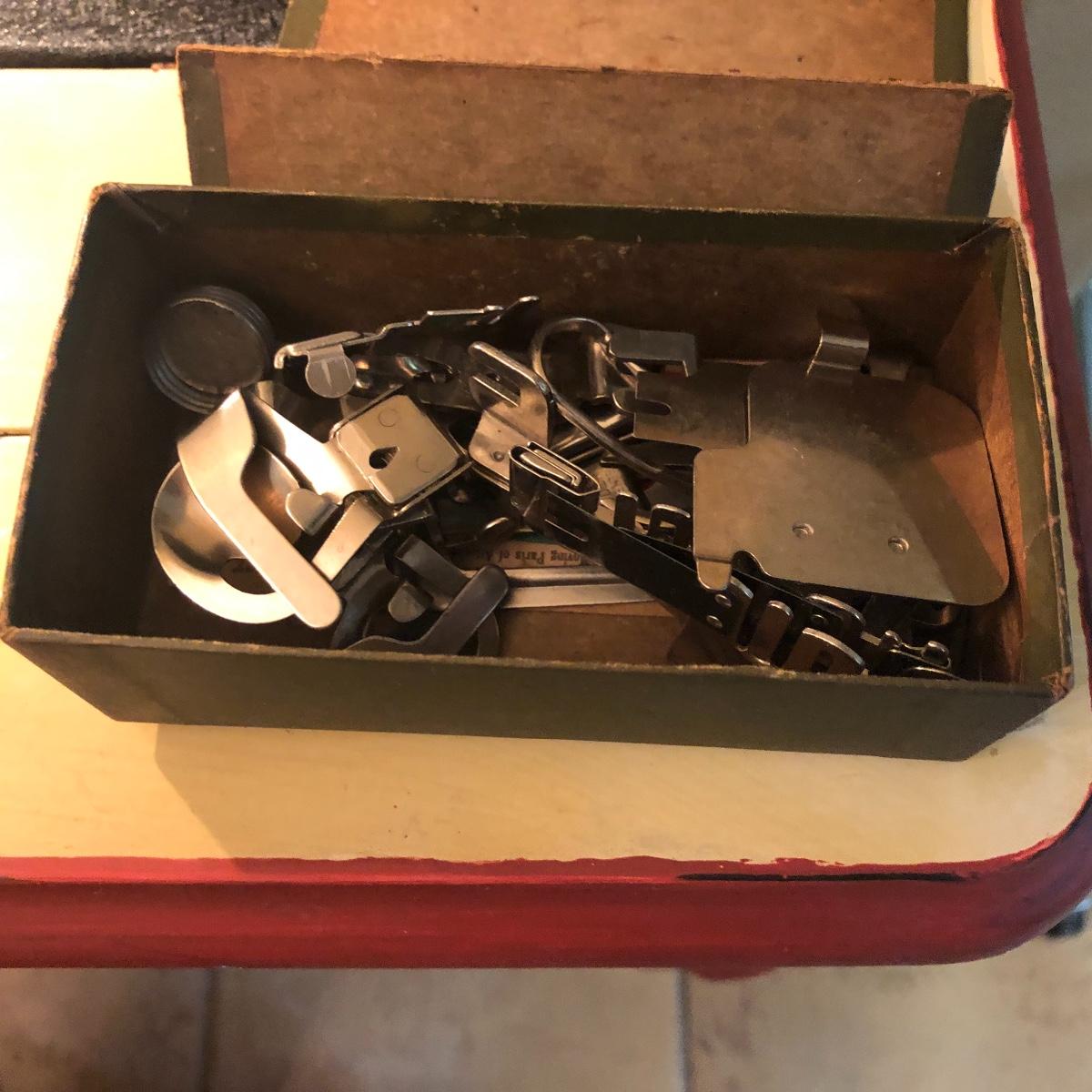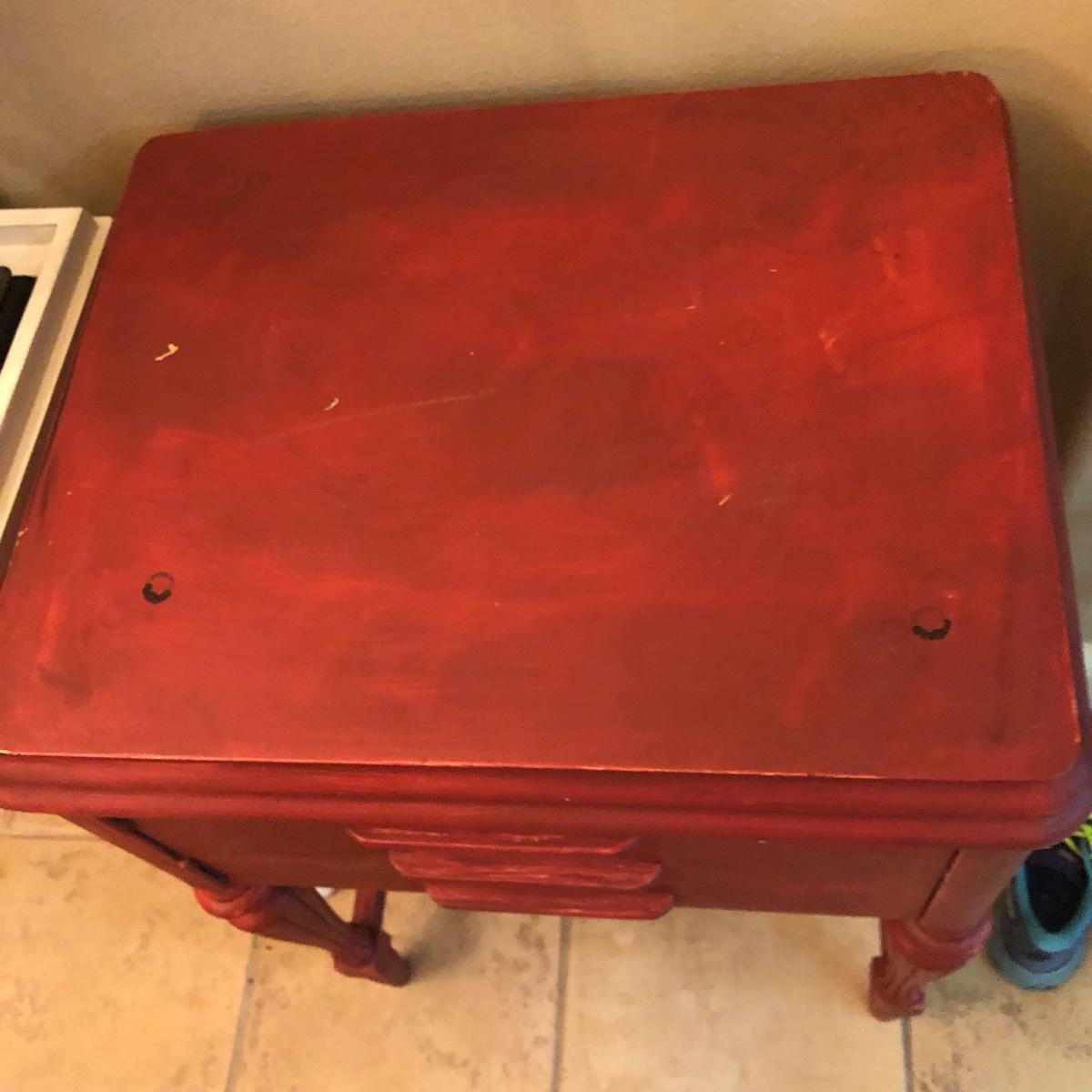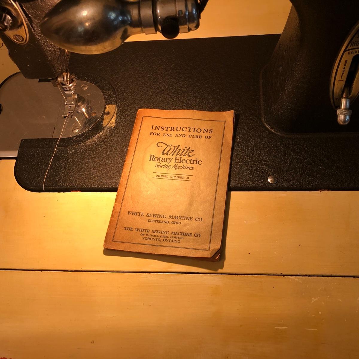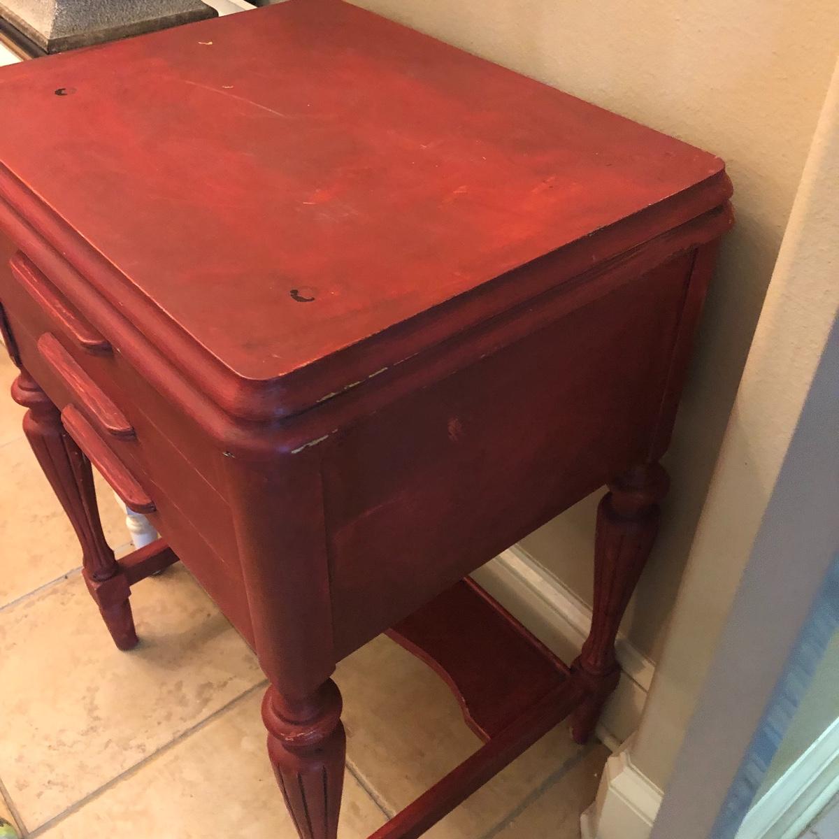 This small table converts to a sewing machine table with a white sewing machine completely functional. Also has a o of sewing machine supplies. Cabinet measures 21 x 17 x 31.