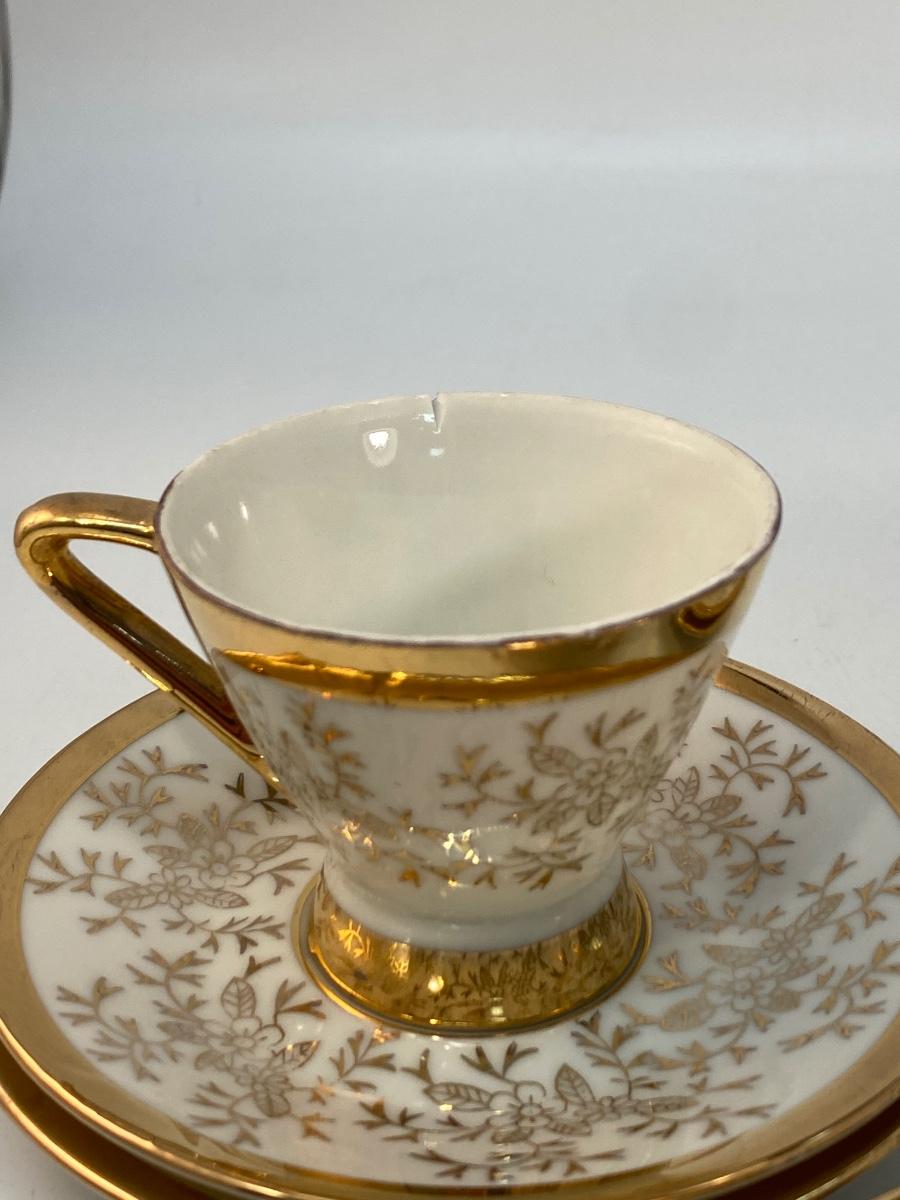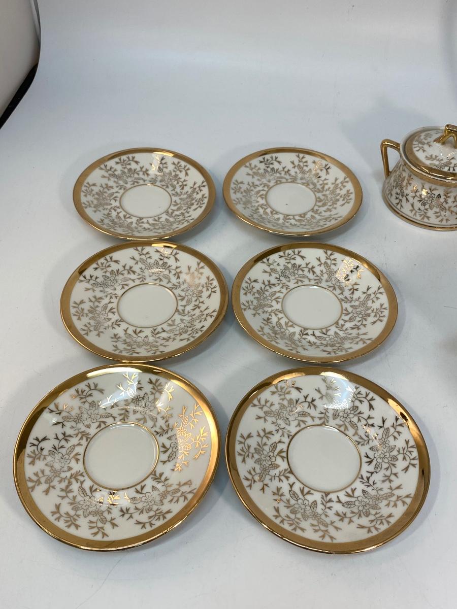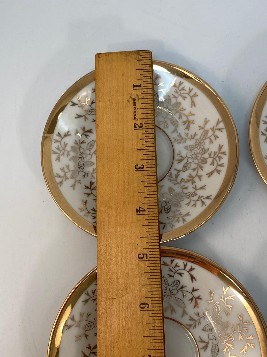 Vintage White w Gold Floral Vine Demitasse Mini Tea Set Unbranded. Smaller than usual size. demitasse or possible vintage child's porcelain tea set. White with gold design and details. Missing 3 cups. Some light wear to gold in spots and one cup has a small crack. No maker mark or branding.