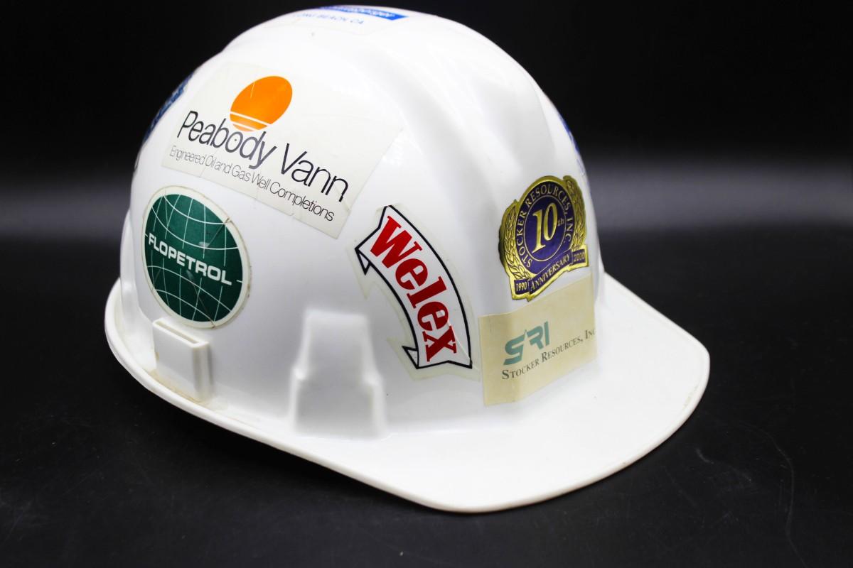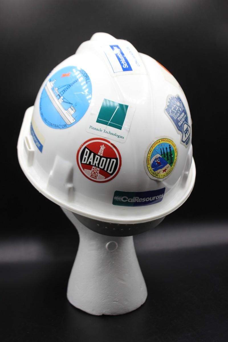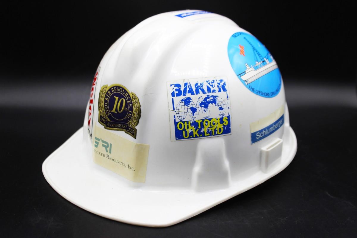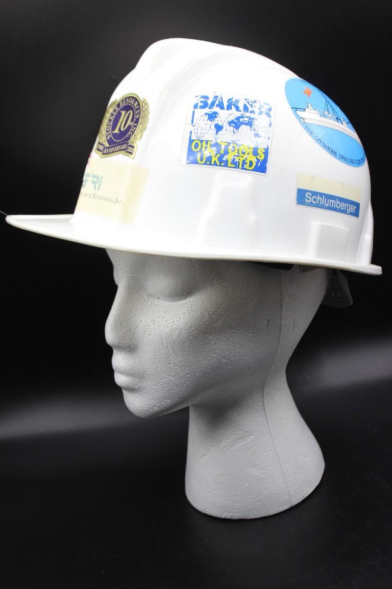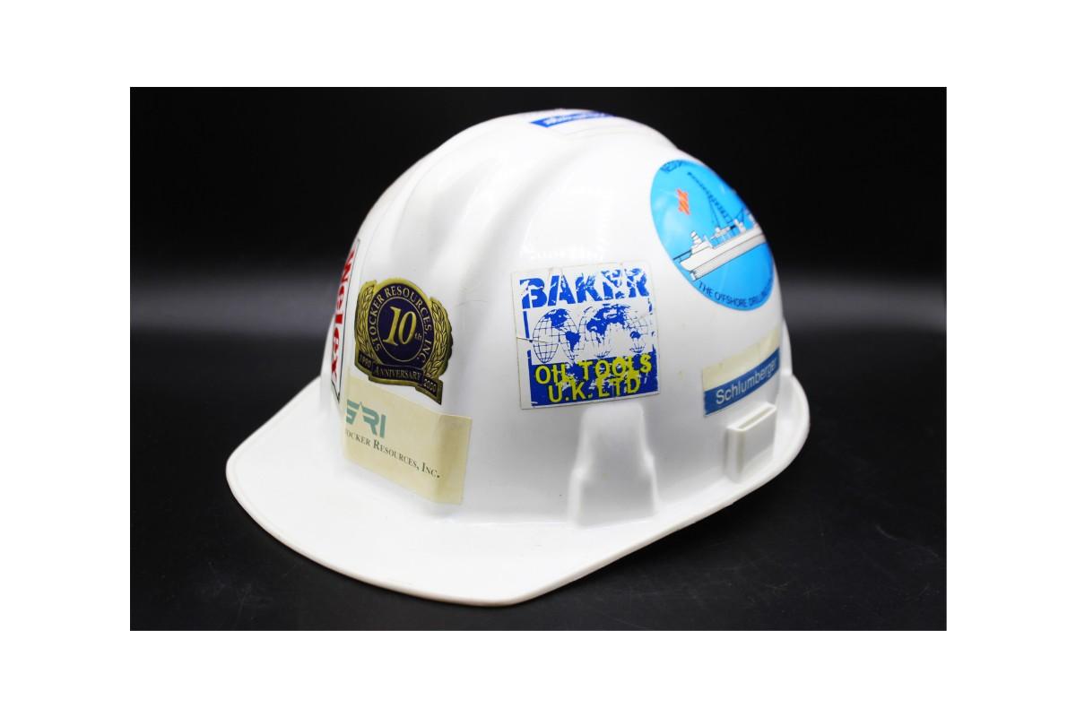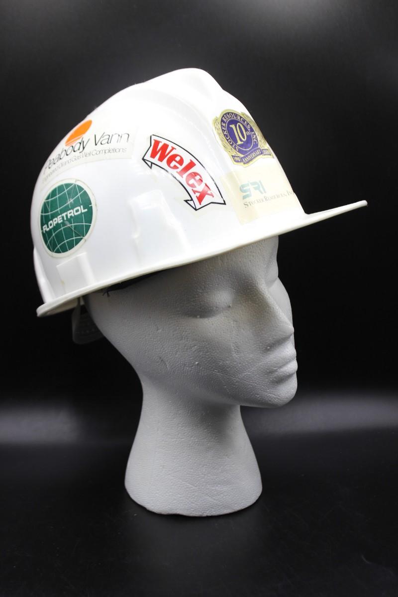 Vintage White Welsh Textron Poly Cap II Fiberglass Adjustable Hard Hat, there is no significant damage to the hard hat and is in good vintage condition. The hard hat is decorated with stickers all around. Check pictures for more details and for sizing.